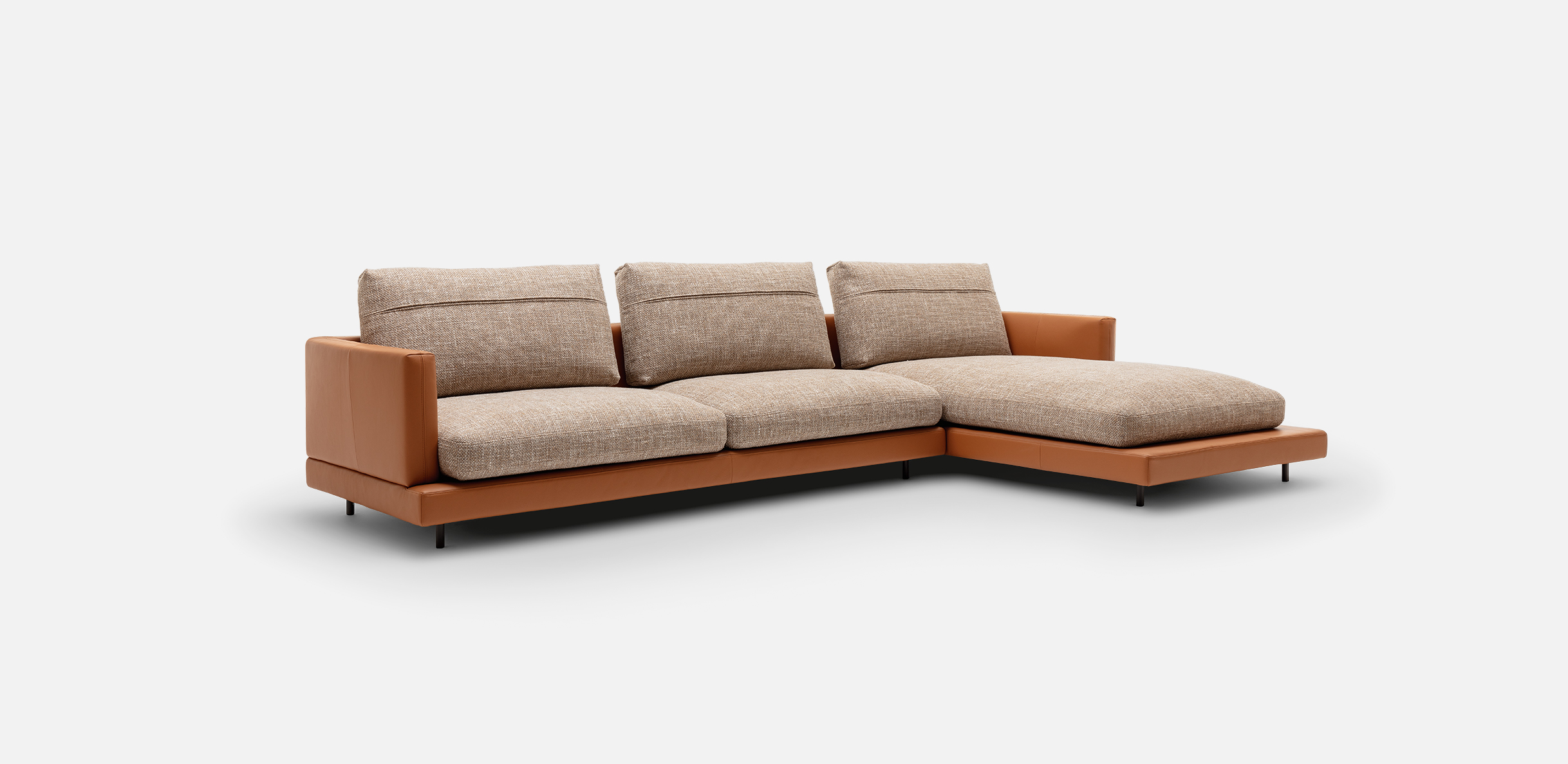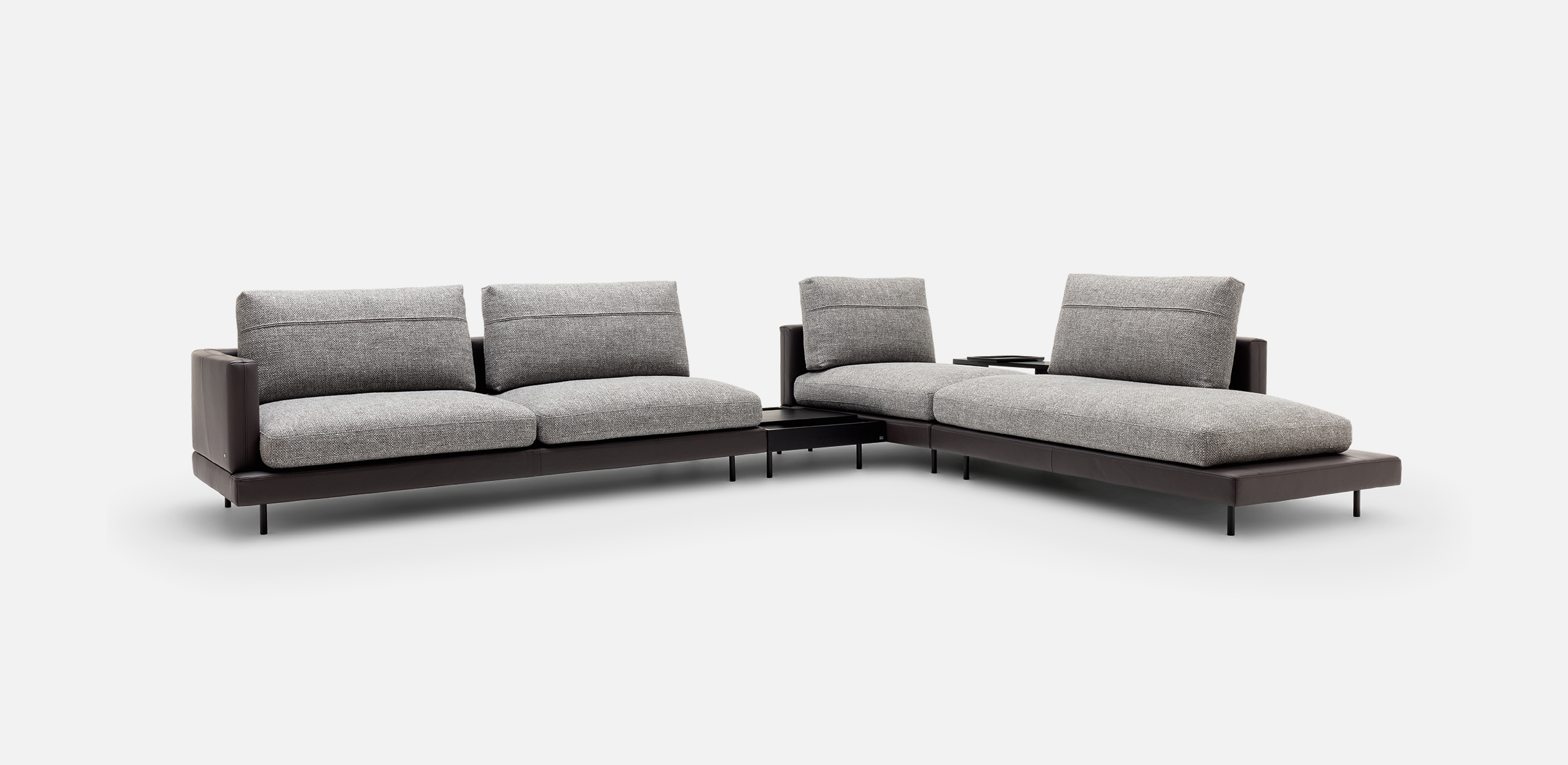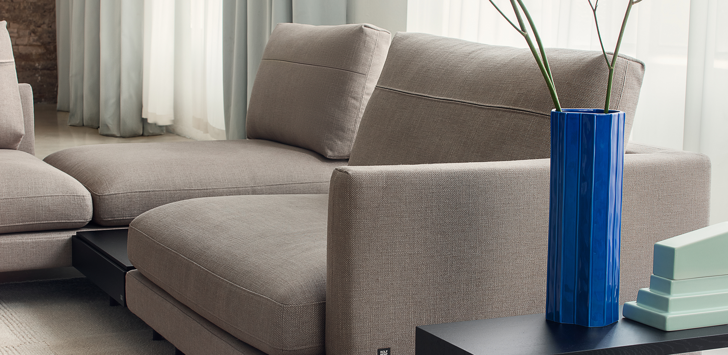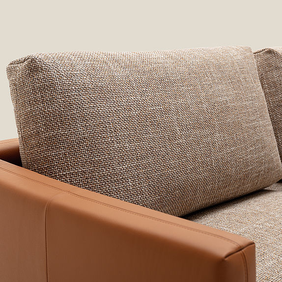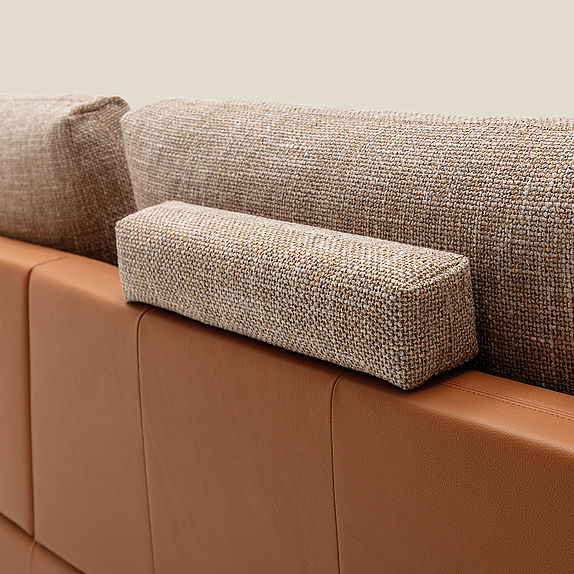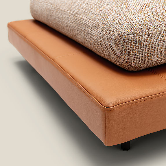 The soft seat cushions of Rolf Benz SINA rest on a frame that is available in leather or fabric with softly curved back and side sections. Seat and backrest cushion covers in contrasting materials and colours create a modern mix of materials and the wealth of creative design possibilities here is seemingly endless. Rolf Benz SINA creates inspiring spaces with a number of flexible modular elements. Innovative sofa modules that optionally come with only one backrest and the integrable Rolf Benz SINA coffee table create a sense of soothing transparency. With the connected upholstered bench and the perfectly matching shelving system, Rolf Benz SINA creates a sophisticated interplay of seating, reclining and storage options. Two different upholstery versions, two seat depths and two seat heights offer additional customisation options.