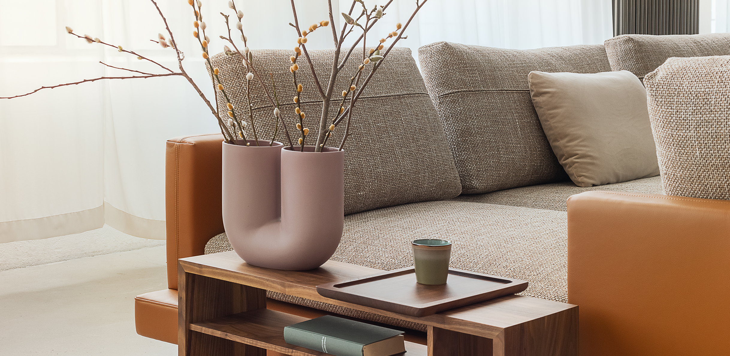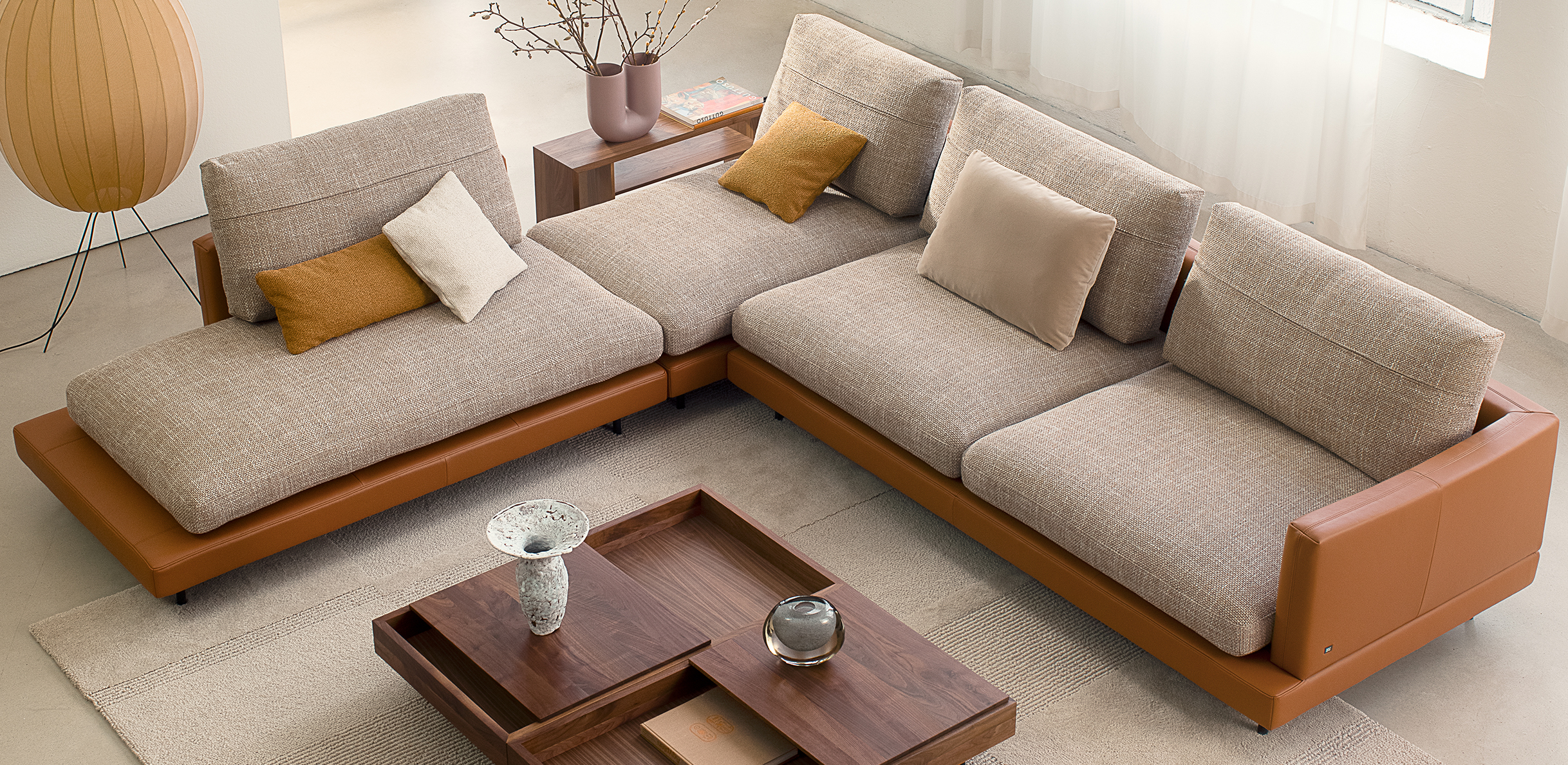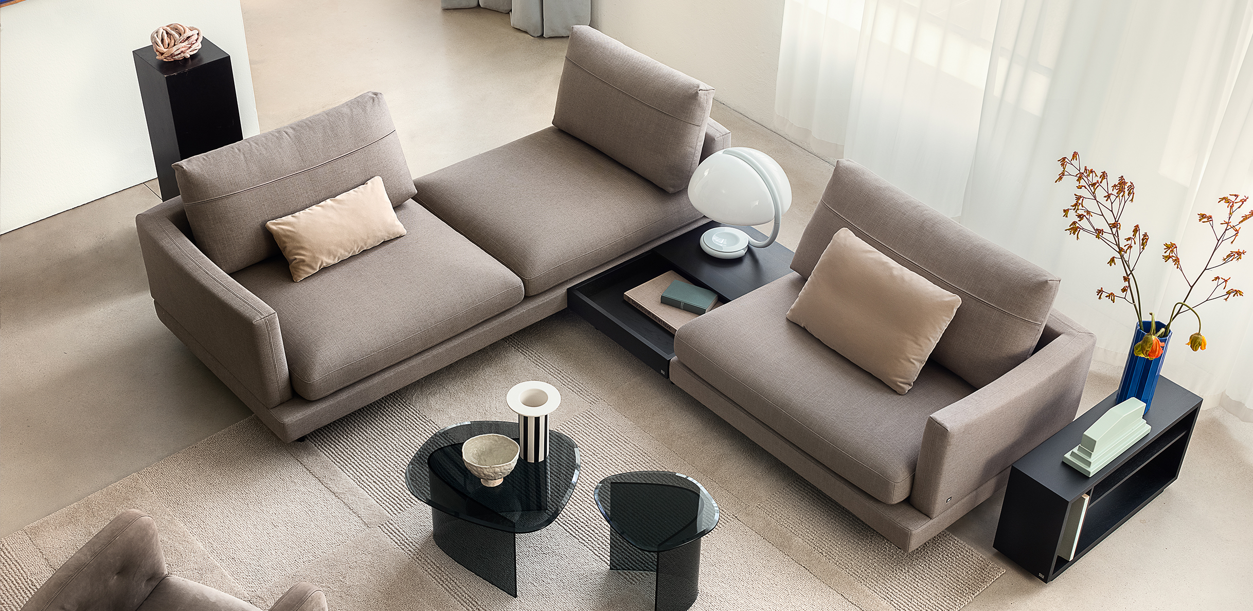 The soft seat cushions of Rolf Benz SINA rest on a frame that is available in leather or fabric with softly curved back and side sections. Seat and backrest cushion covers in contrasting materials and colours create a modern mix of materials and the wealth of creative design possibilities here is seemingly endless. Rolf Benz SINA creates inspiring spaces with a number of flexible modular elements. Innovative sofa modules that optionally come with only one backrest and the integrable Rolf Benz SINA coffee table create a sense of soothing transparency. With the connected upholstered bench and the perfectly matching shelving system, Rolf Benz SINA creates a sophisticated interplay of seating, reclining and storage options. Two different upholstery versions, two seat depths and two seat heights offer additional customisation options.