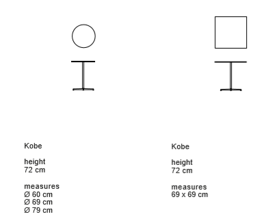 Leader of a discreet style, Kobe tables embrace the simplicity of different geometric shapes. Pure functionality that adapts to any residential or workplace setting. Table with die-cast aluminium base and steel tube. Layered laminate top, available in black colour, white colour, or lacquered. Lacquered base in the same nishes as the top.