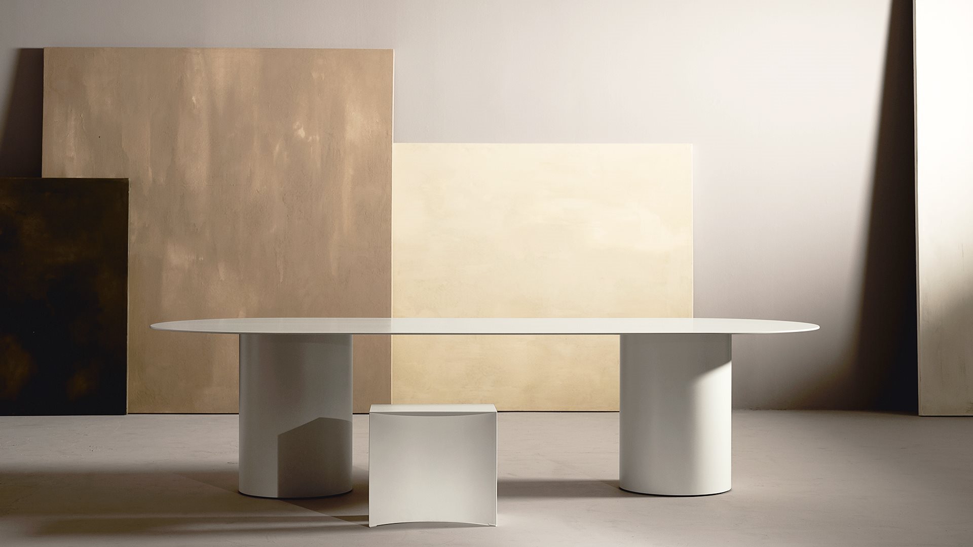 The resulting composition gives the piece a strong monolithic presence highlighted by the accentuated contrast between the impressive volumes of the base and the extreme thickness of the top.