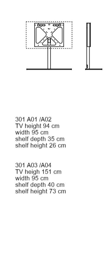 Tv-stand system for flat and curved screens. Swivelling steel frame. Integrated wiring box. Available in four versions: with base equipped of built-in monodirectional castors, with rear cable management, with rear wall- xing system and with swivelling floor-ceiling upright.