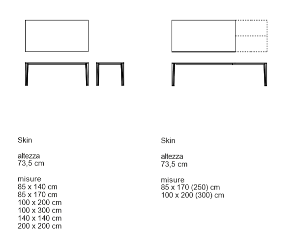 Una superficie lineare e sottilissima nasconde meccanismi sofisticati che permettono di allungare il piano senza perderne l’armonia delle proporzioni. Come se Skin fosse un tavolo all’interno del quale ve ne fosse contenuto un secondo.