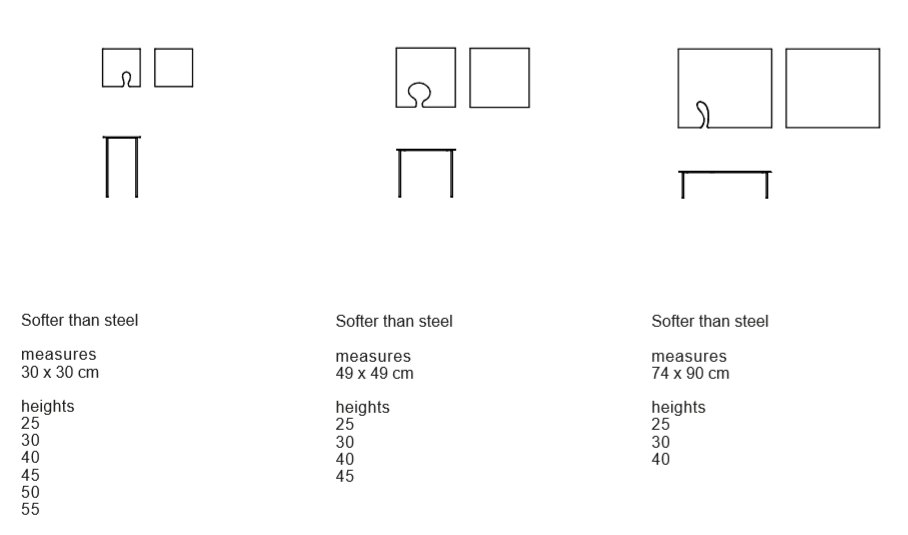 Ultralight carved tops of different shapes and complementary heights de ne the Softer Than Steel range. Almost a playful Nendo design, with an arrangement of interesting personal variations and nestings.