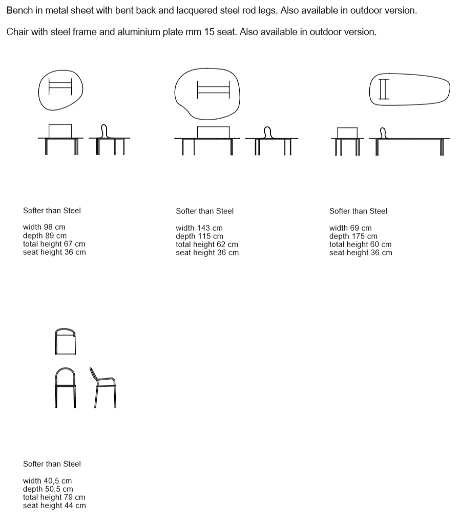 Bench in metal sheet with bent back and rod steel legs, matt lacquered.