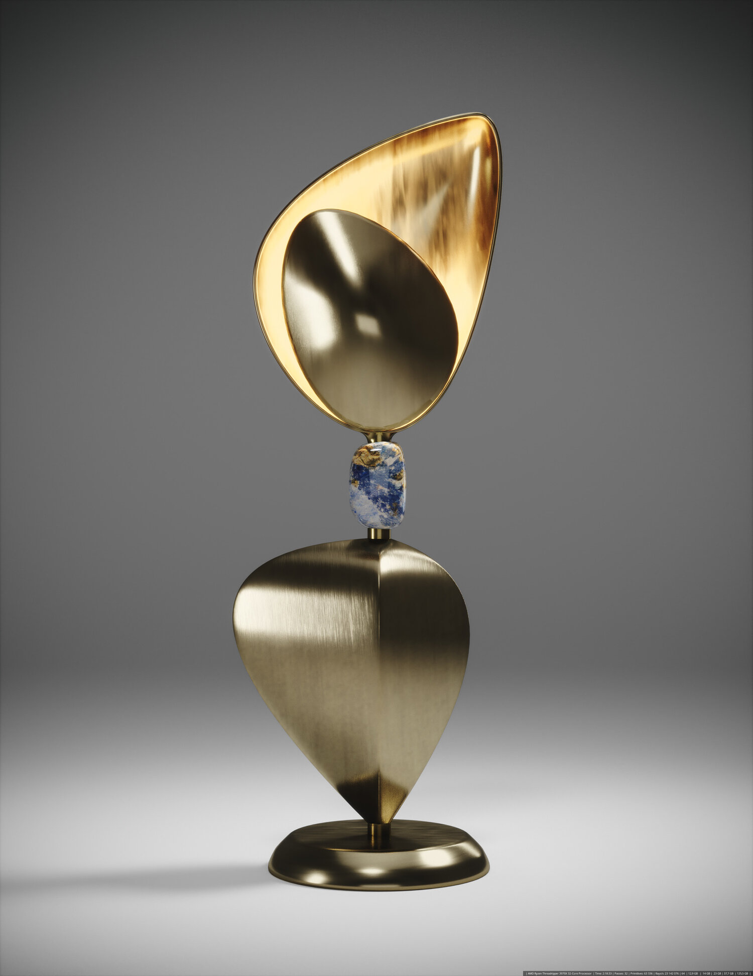 The Cosmo Bird table lamp by Kifu Paris is a whimsical and sculptural piece, inlaid in either cream shagreen and bronze-patina brass with a beautiful quartz piece in the center or completely in bronze-patina brass with a lapis lazuli piece. The amorphous shapes are an abstract and poetic reinterpretation of a bird flying in a cosmic sky. This piece is a part of the Cosmo II Capsule. This piece is designed by Kifu Augousti, the daughter of Ria and Yiouri Augousti. All shagreen pieces are hand-dyed by artisans.