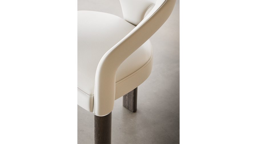 Poltroncina con struttura in legno, schienale e seduta imbottiti in pelle o tessuto, con dettagli in acciaio lucido.