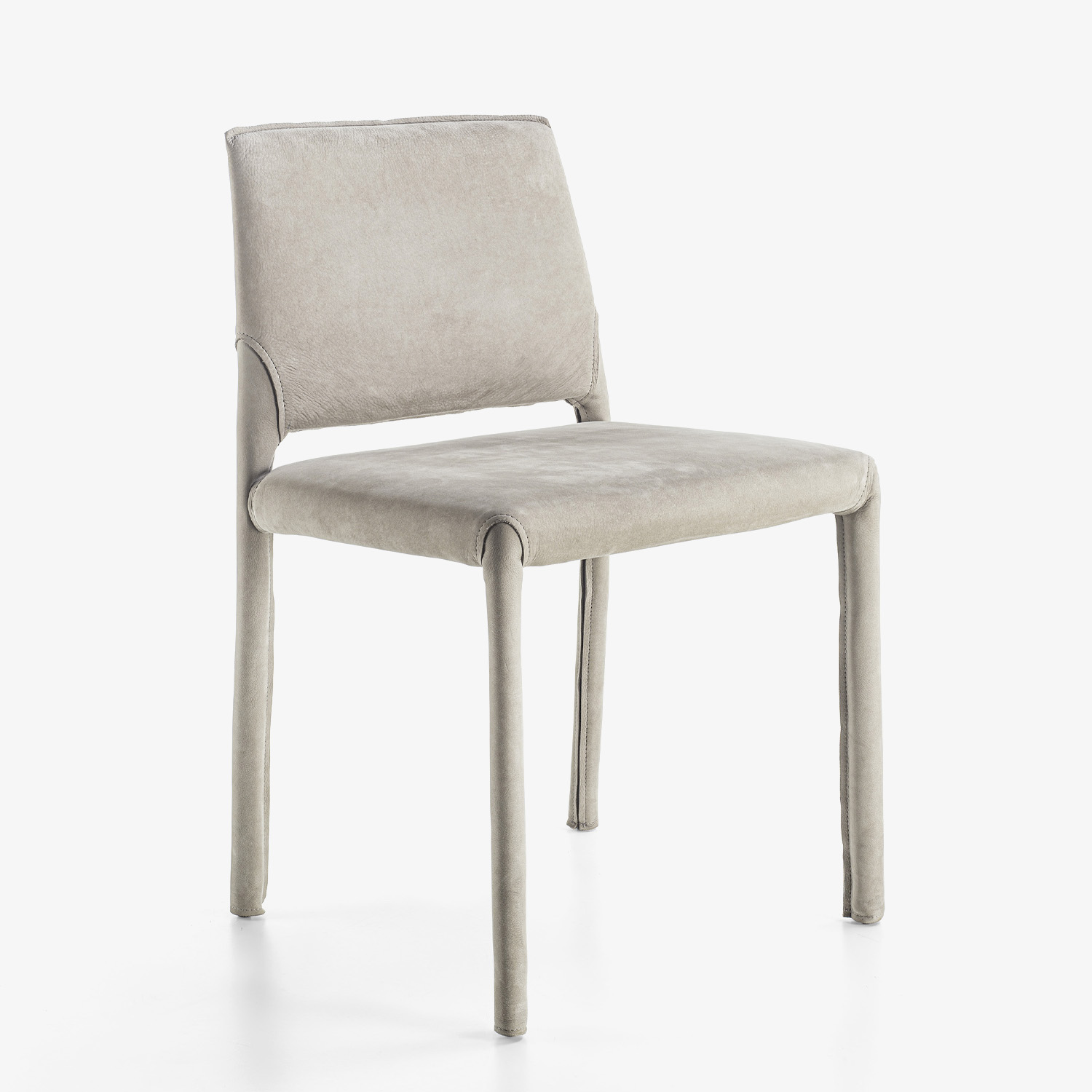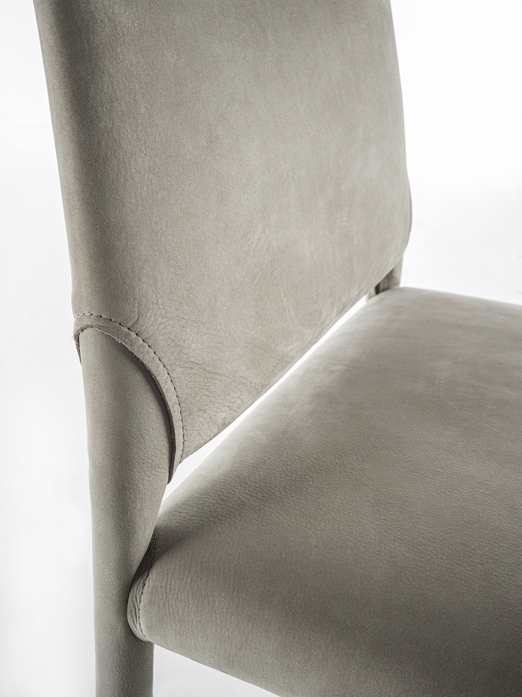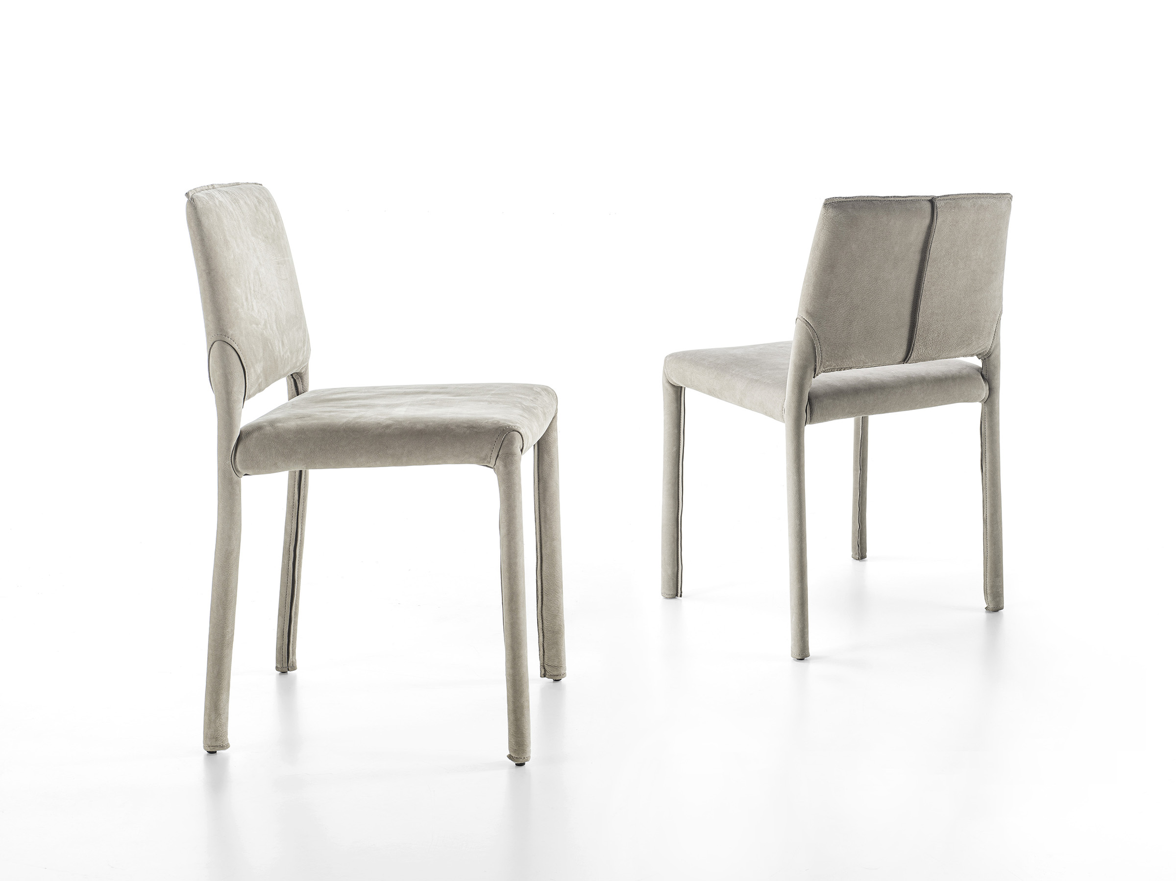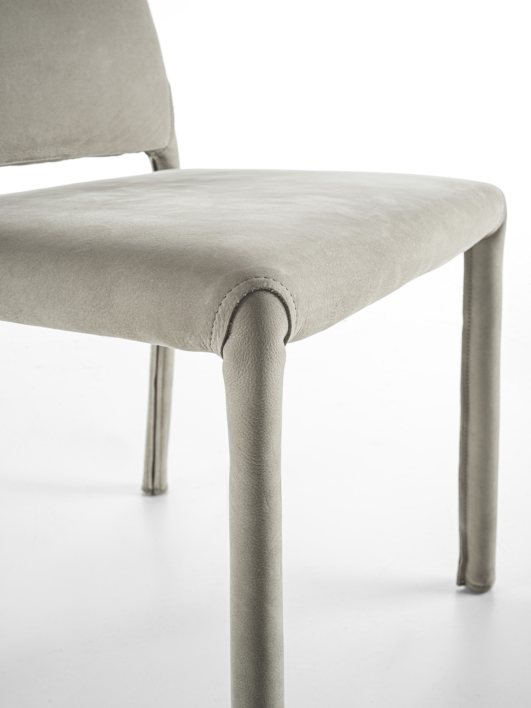 Rivisitazione della sedia in versione soft. Alla struttura in metallo viene sommata un’imbottitura che ne conferisce maggior comfort e morbidezza. Completamente rivestita in pelle, con cuciture a vista.