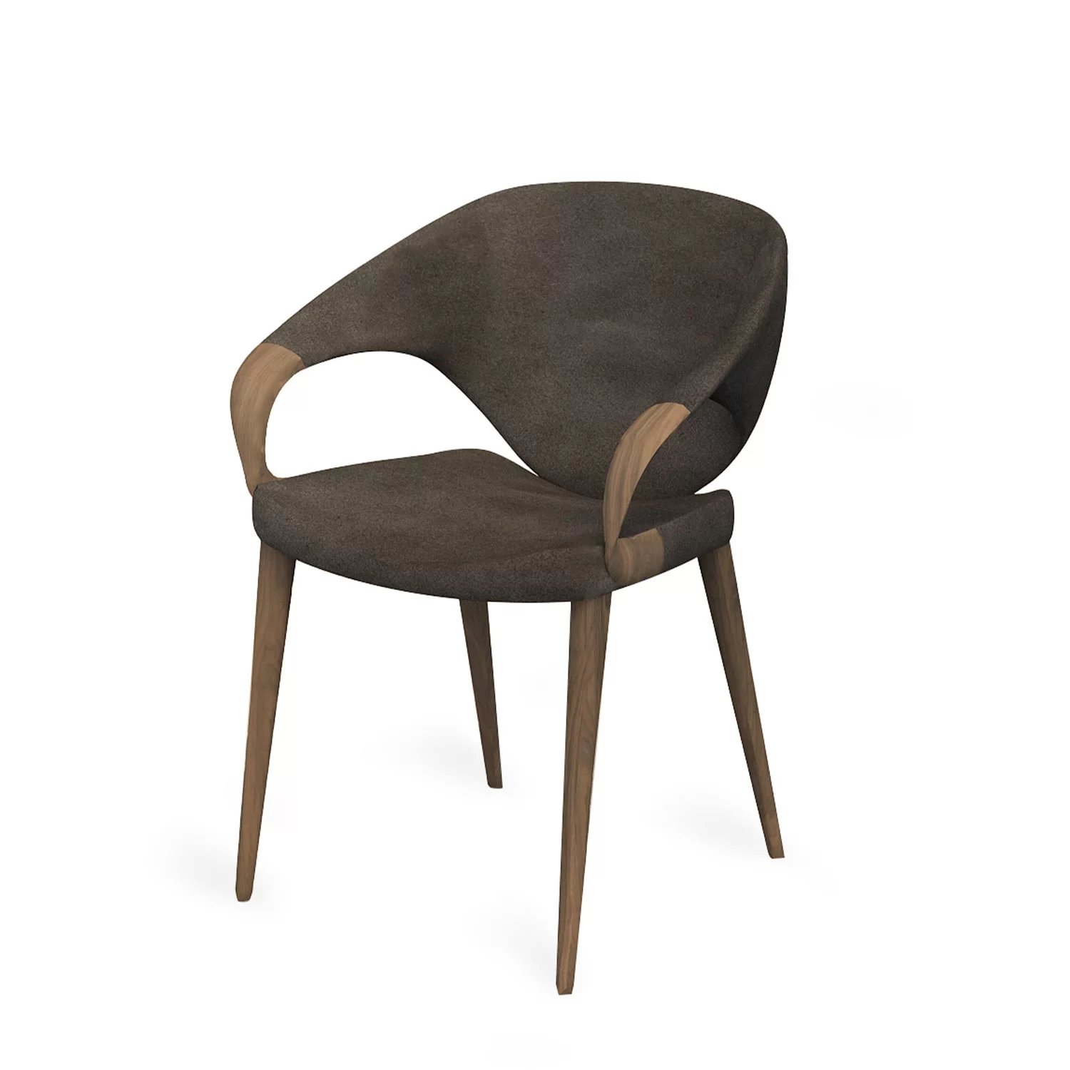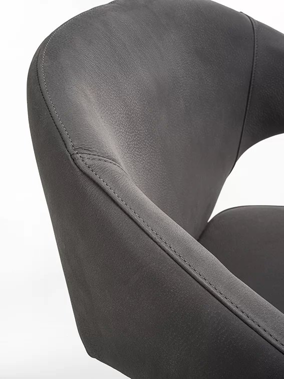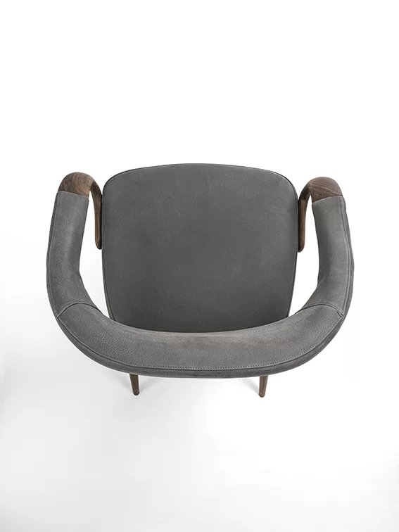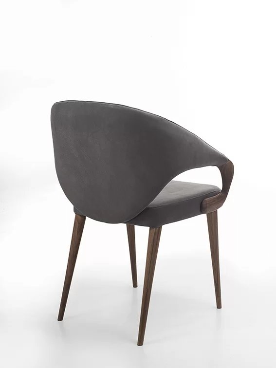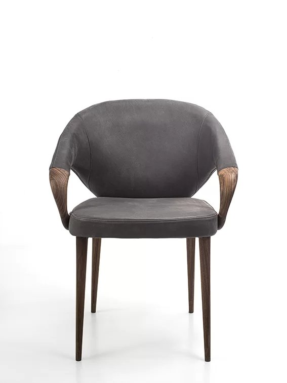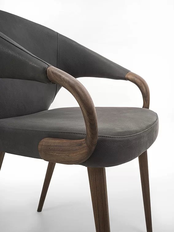 Poltroncina elegante ed avvolgente, con gambe e braccioli in legno massello. Seduta e schienale rivesti in pelle o tessuto.