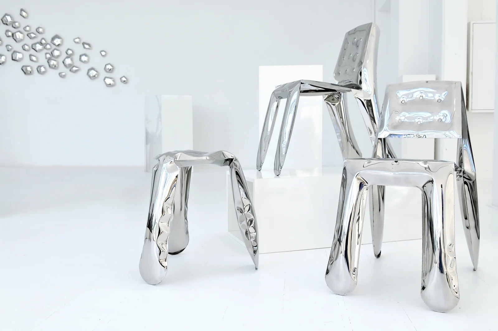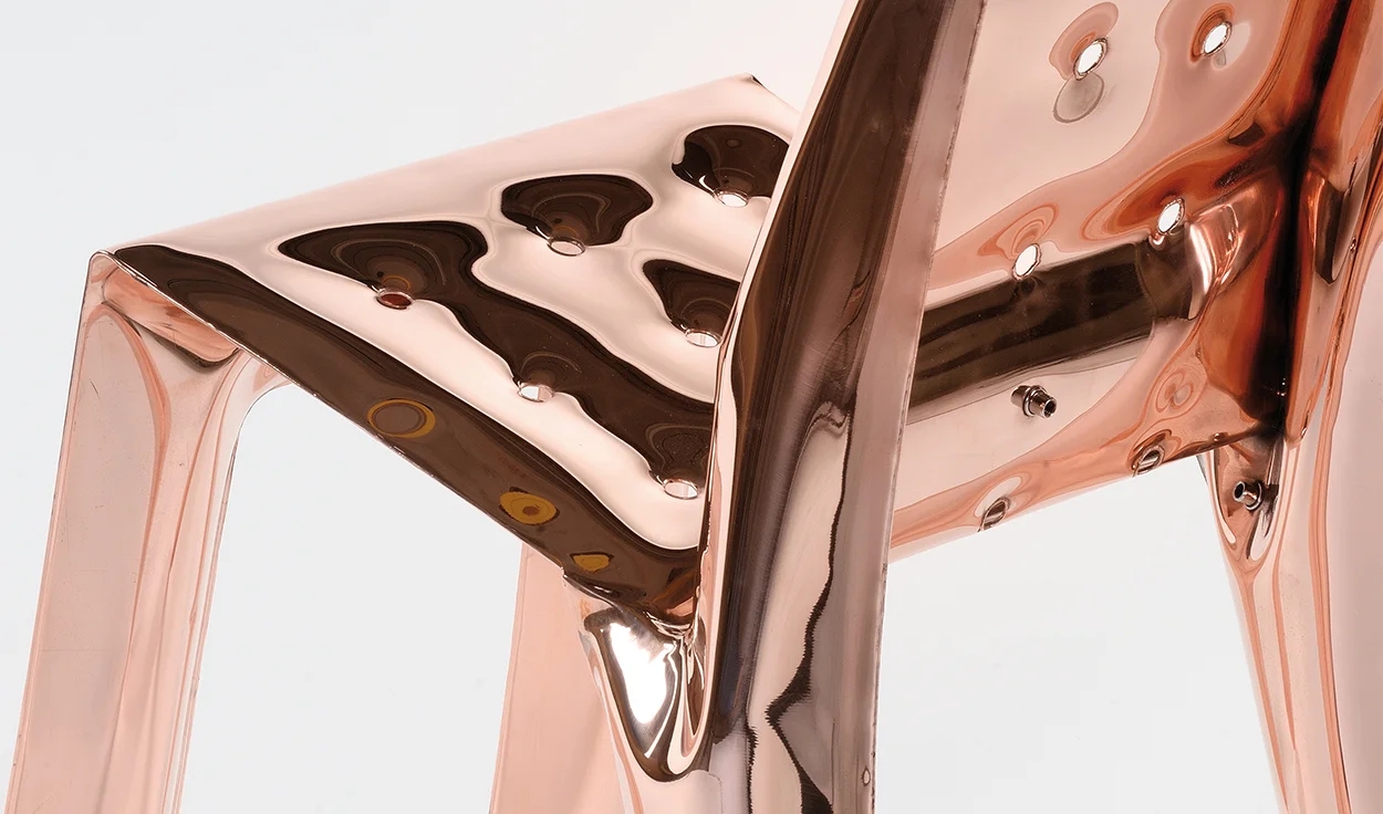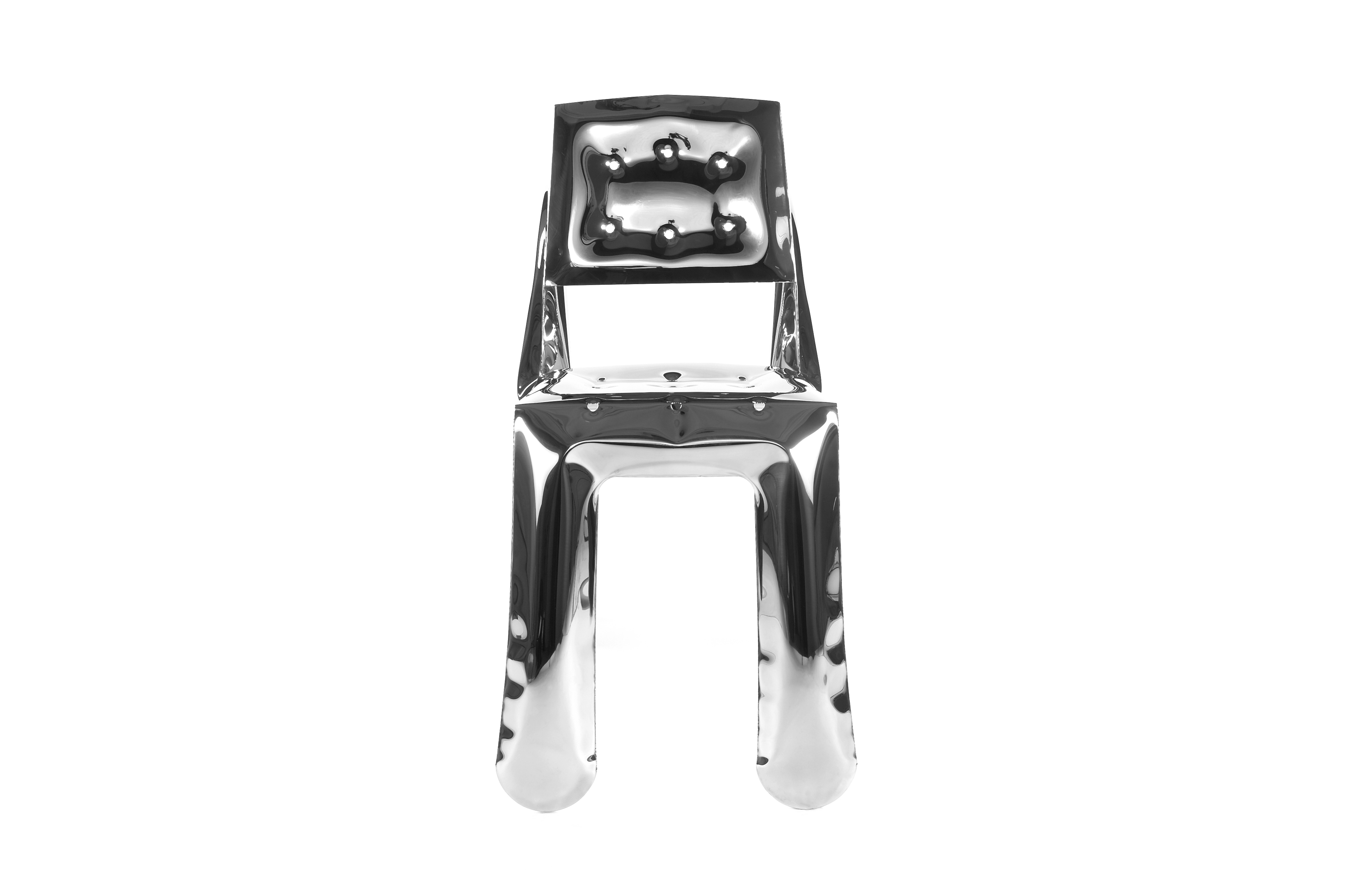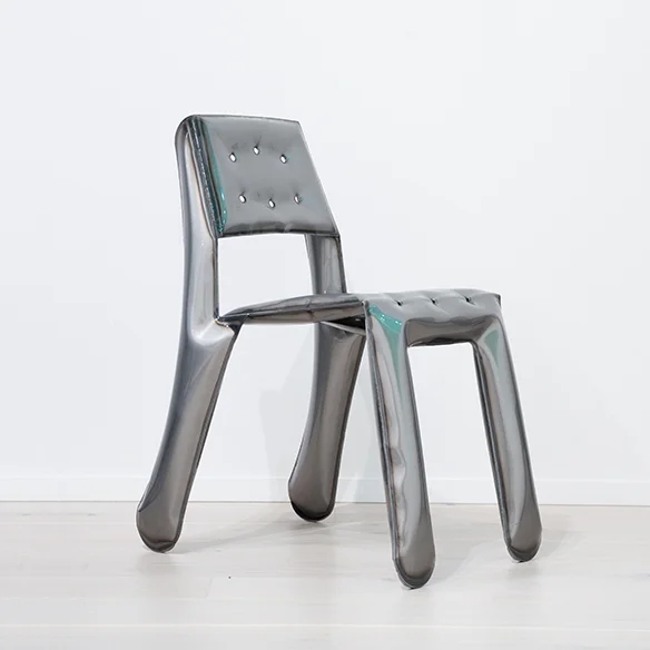 A development of the limited edition Chippensteel 0.5 chair – available in new colours. It still offers a unique material experience but the shape of the chair has been slightly redesigned to allow a mass-production. The chair has been uniquely processed and produced in FiDU technology using bending properties of steel sheets.