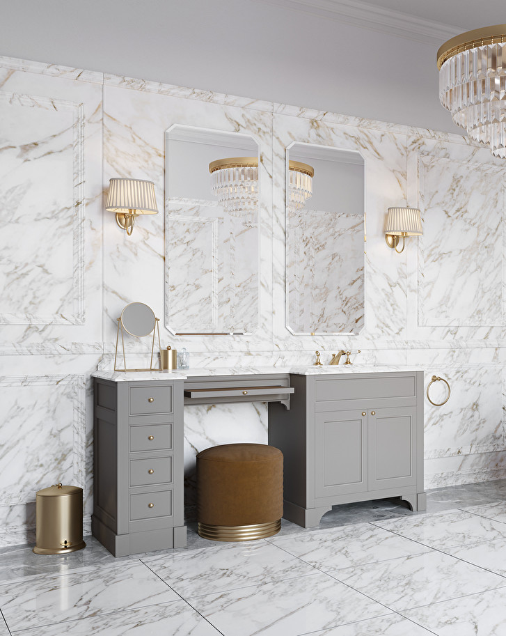 The iconic neoclassical vanity unit features a dressing table with four drawers and a fold-out velvet top. Ideal for those wanting to make even the most compact space into an exclusive, luxurious beauty haven, Season Vanity is the result of impeccable craftsmanship and the finest materials. The marble top, brass knobs and wooden frame all come in a bespoke choice of colours and finishes.