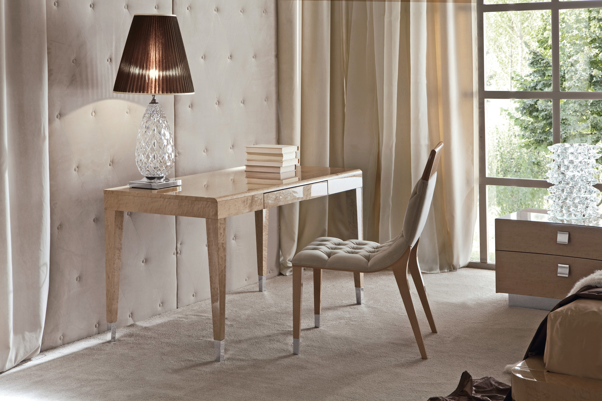 Vanity desk finished in champagne bird’s eye maple veneer. 1 full extension drawer with bottom in printed iguana leather. 4 stainless steel feet.