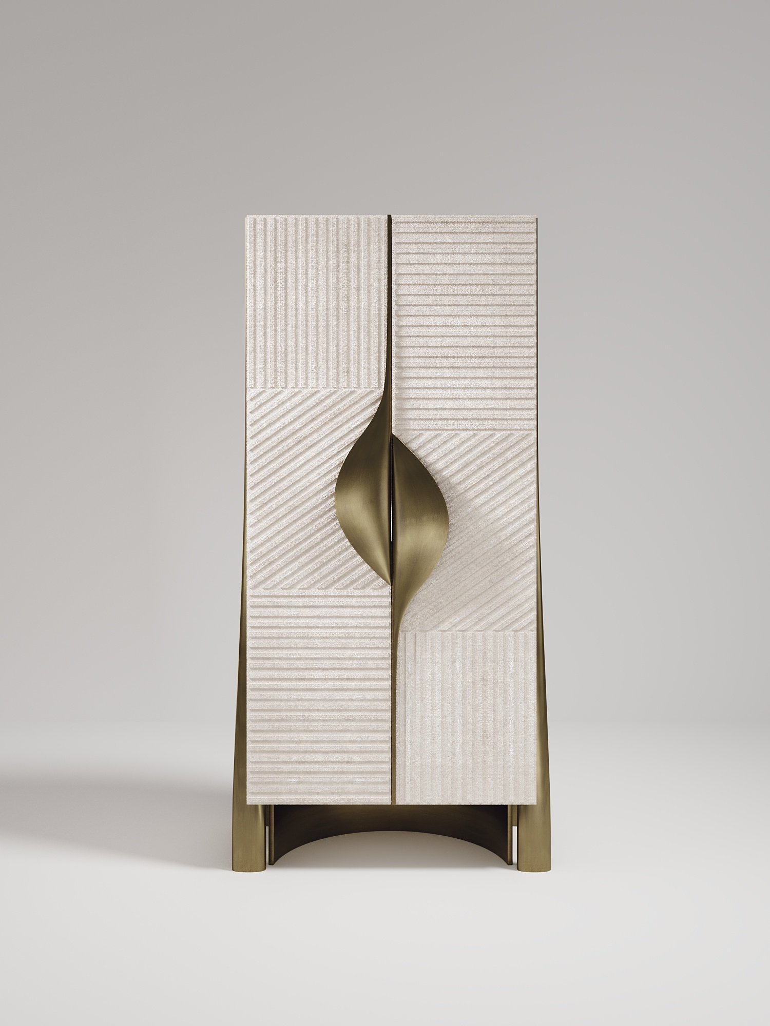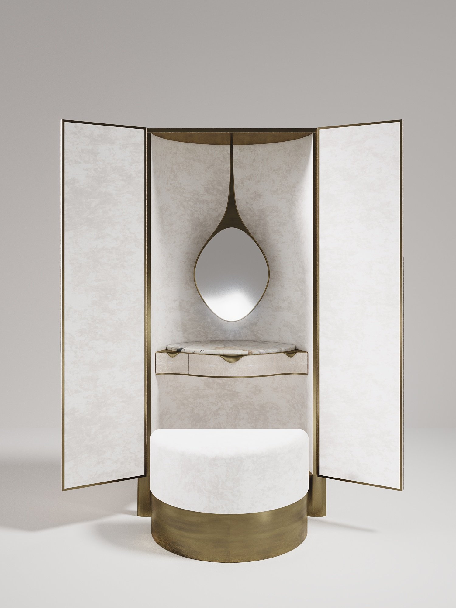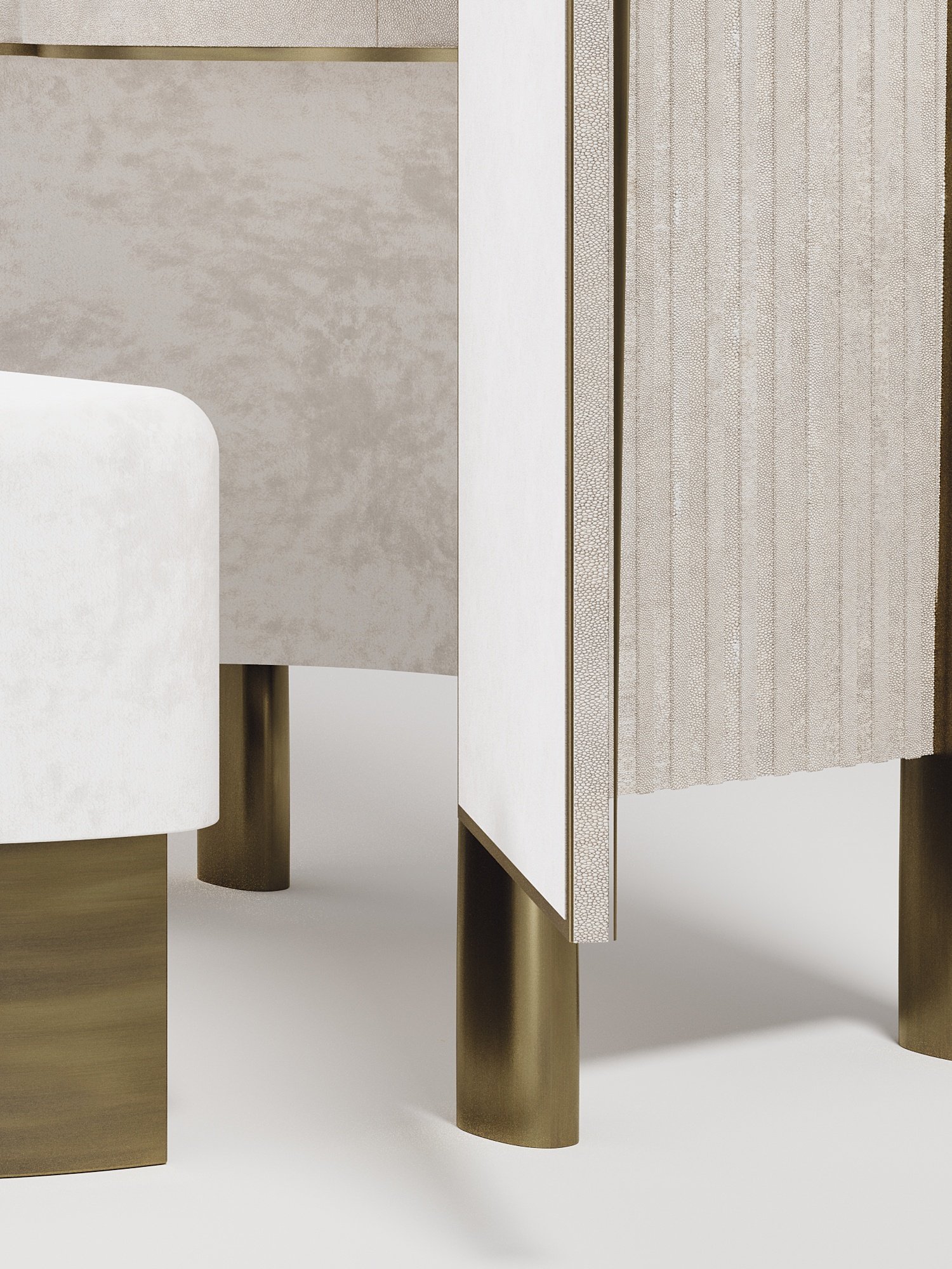 The Wave Vanity Cabinet by R&Y Augousti is one of a kind statement piece. The overall piece is inlaid in cream shagreen, with the exterior hand-carved in an updated version of the signature Augousti "rhomboid" pattern. The door handles and legs are in a bronze-patina brass. The interior of the piece opens up to an ultra luxe vanity. An elegant pendant mirror floats above a patagonia semi-precious stone top, while the interior walls are lined in a plush cream velvet. This piece comes with a matching cream velvet / bronze-patina brass stool that tucks inside the cabinet when closed. Available in other finishes and as a bar cabinet