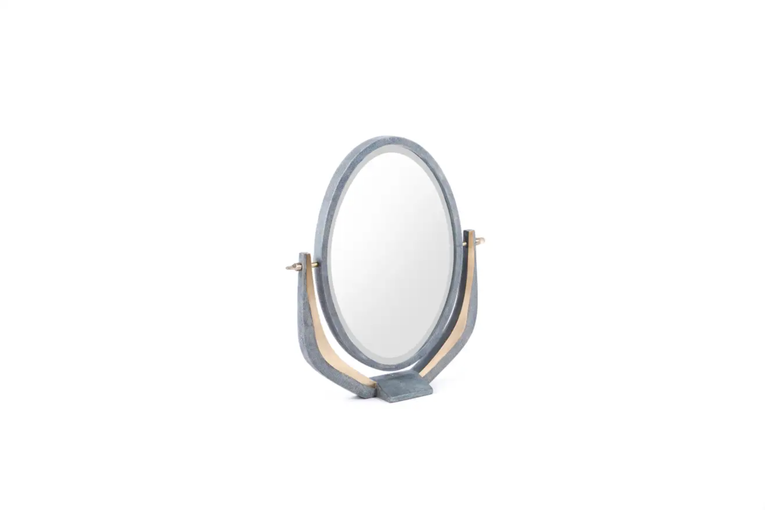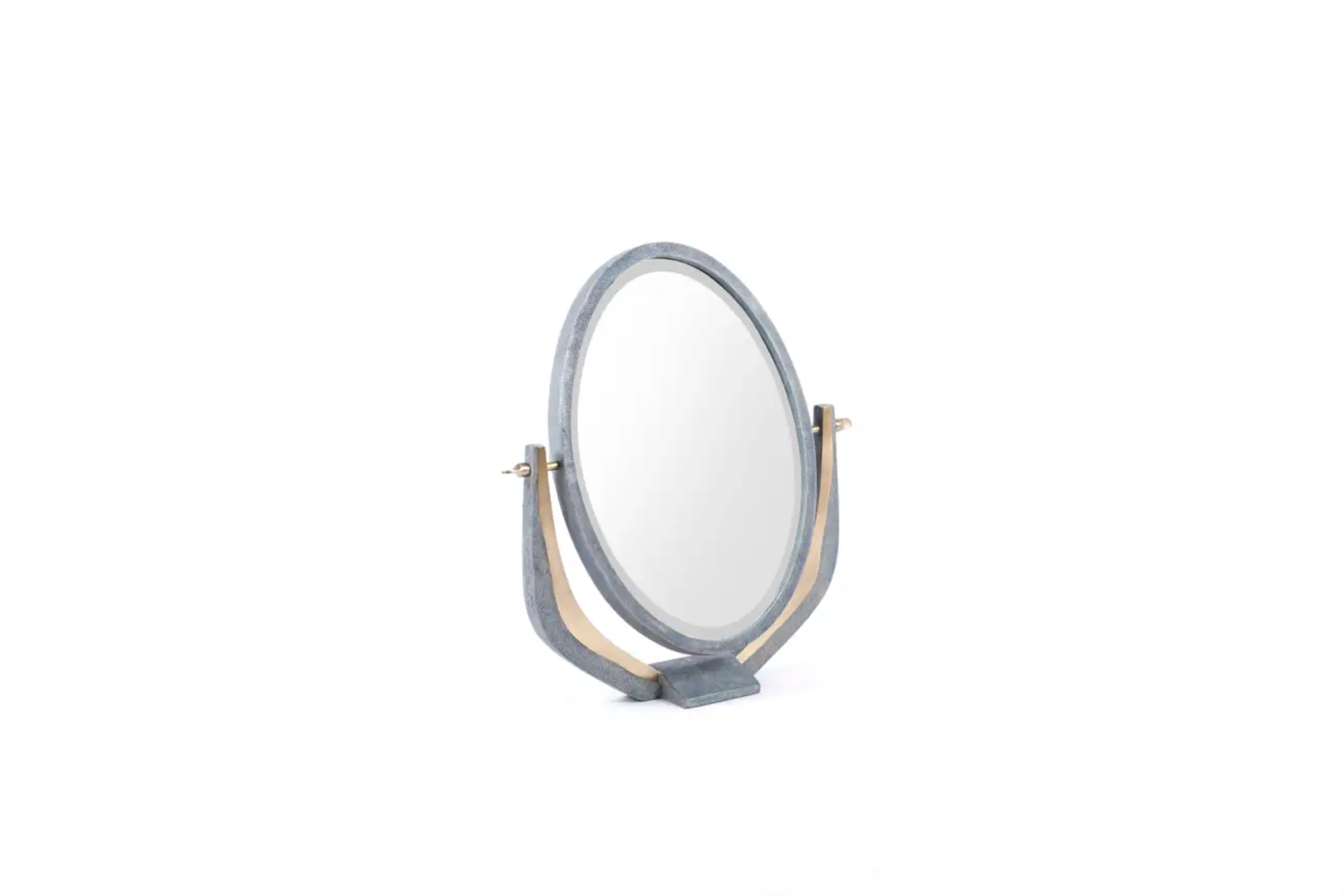 The melting vanity table's simple but elegant design, makes for an adaptable elegant piece of furniture. The blue shagreen inlaid surface is framed with an irregular surface bronze-patina brass that creates the "melting" effect against the shagreen inlay. This desk includes 5 drawers total with a discreet thin metal handle. Mirror included, chair sold separately. Custom color or sizing available on request.