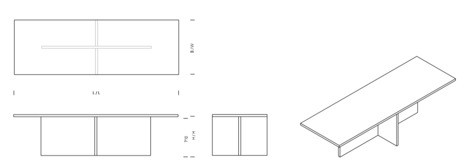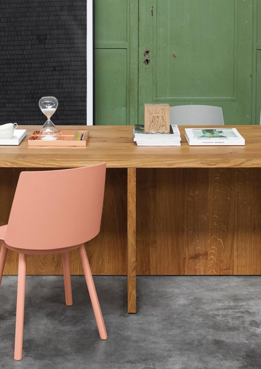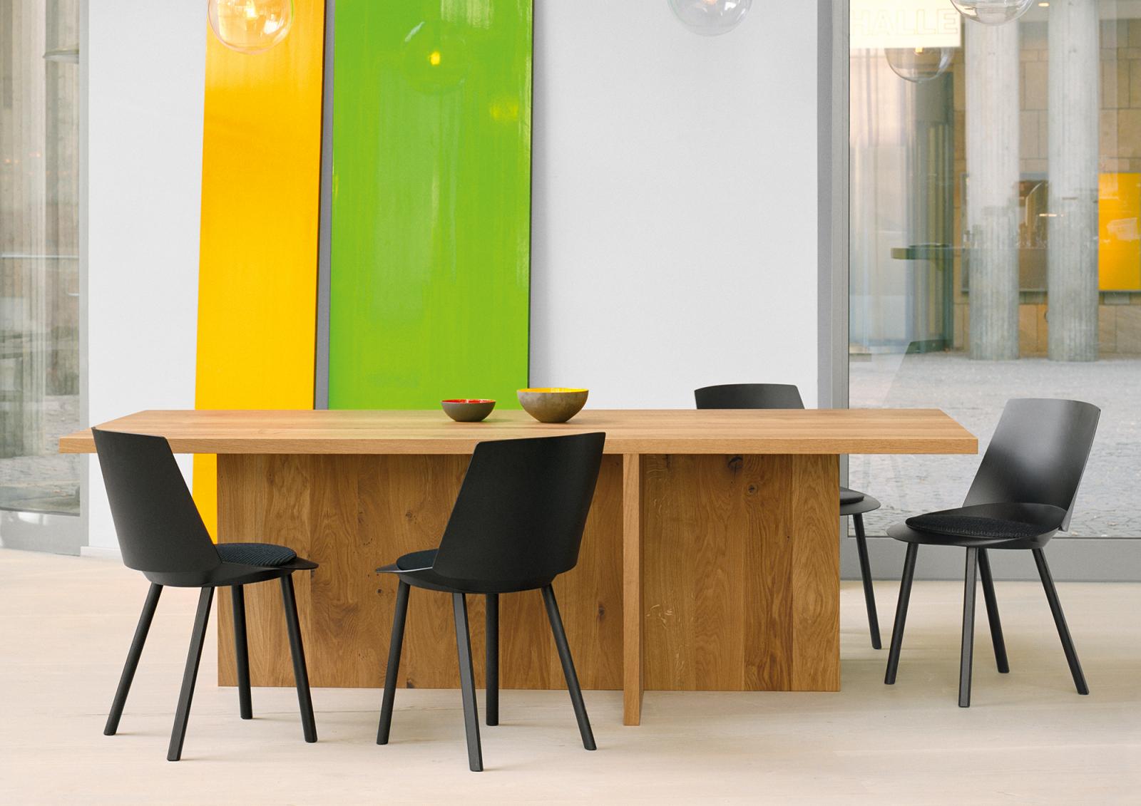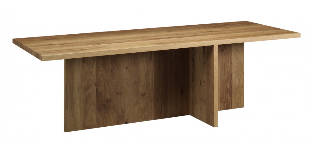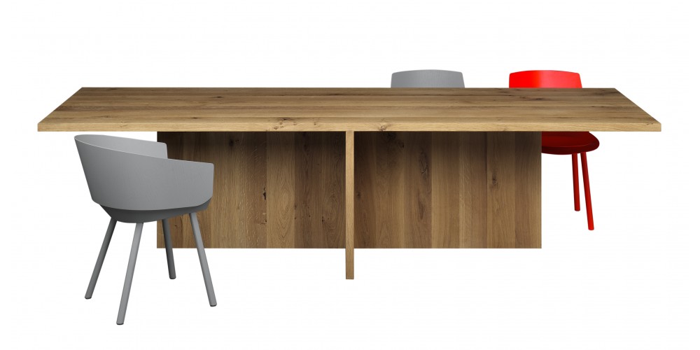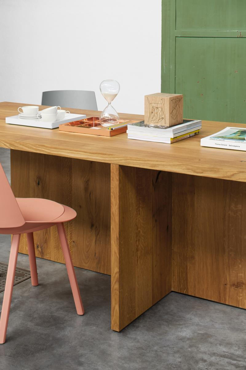 The table ZEHN has through the complete reduction to its geometric form a sculptural appearance. Due to its simple middle leg, which dependant on the length of the table, is symmetrically positioned underneath the table top, the usual protruding stilts are omitted. With a solid wood thickness of table top and leg of 40 MM (1 5/8 INCH), ZEHN is available in oiled European oak. Its reduced form enables the table to suit various interiors as a conference or dining table. ZEHN offers seating for up to eight people with a length of 2400 MM (94 1/2 INCH) and up to ten people with a length of 3000 MM (118 1/8 INCH). The table ZEHN is perfectly complemented with side chairs HOUDINI or THIS. The clearance underneath the table top measures 710 MM (28 INCH).
