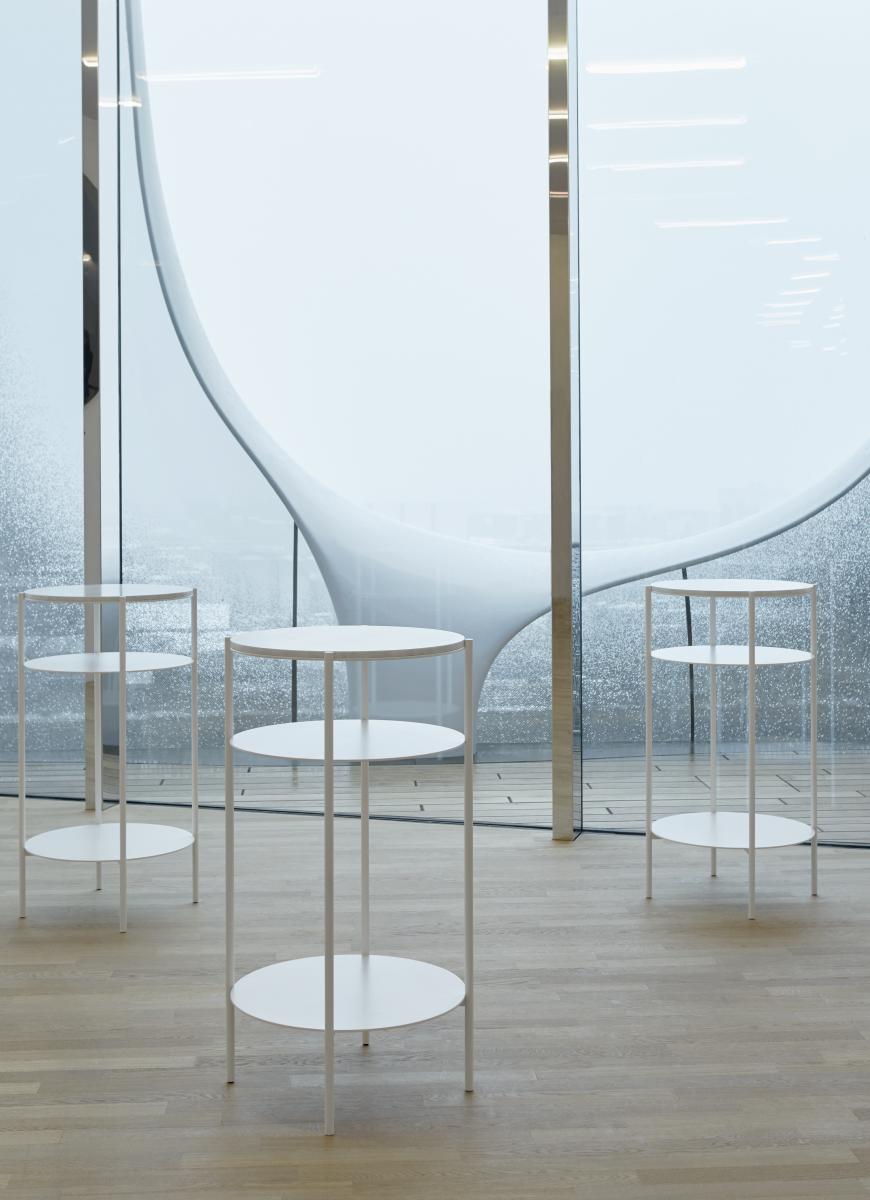 Building on simple geometric forms in combination with a monochromatic palette, high table ELBE I is an enduring piece with a clear structural concept. The powder-coated steel base in signal white is combined with an exchangeable table top in Bianco Carrara marble, offering multiple options for eating, drinking and storing personal belongings. Originally designed for the foyers of concert hall Elbphilharmonie by Herzog & de Meuron architects, ELBE I is ideally suited for contract purposes.