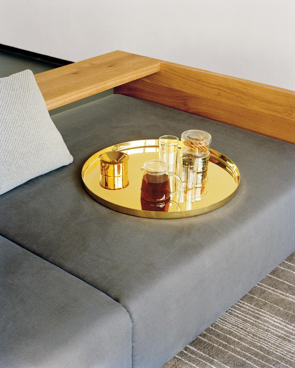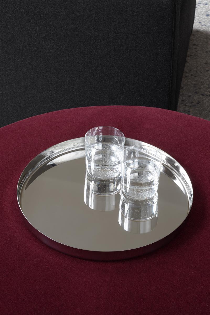 Reminiscent of ornately detailed oriental tea services, HABIBI as a tray or side table is a precious piece offering elegant possibilities for combination. The tray HABIBI in combination with the base can be used as an independent side table with generous diameters and optional heights available in polished brass, copper and stainless steel. Each piece is entirely unique, handmade and truly valuable, offering versatile use as the tray can be removed from the base and used as such on its own. Untreated by chemicals, natural oxidation processes create a beautiful patina over time, unless interrupted by applying conventional metal polishes. The surfaces are not lacquered. The endearing tray and side table HABIBI is additionally available in powder-coated aluminium in the colours signal white and jet black. The tray HABIBI is delivered as one piece whereas the side table with the base is delivered in two pieces.