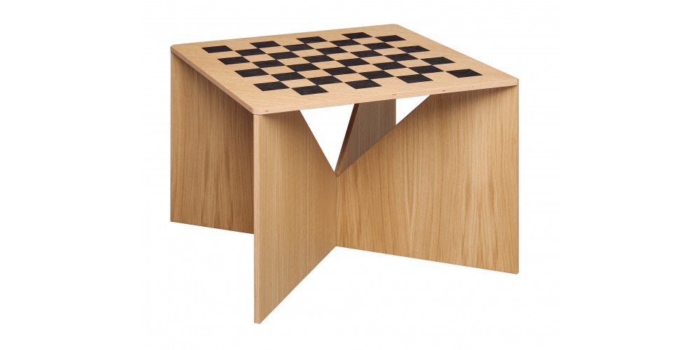 CALVERT is from a series of coffee tables, designed by German functionalist architect Ferdinand Kramer during his time in America. Part of his successful ?Knock-Down“ furniture series, it consists of a table top and two crossing invertible sheets serving as a base for the table. Celebrating 120 years Ferdinand Kramer?, CALVERT CHESS is based on a cardboard picnic version Kramer originally proposed for Coca-Cola in 1951. The special edition features a silkscreen black chessboard printed on natural oak lacquered.
