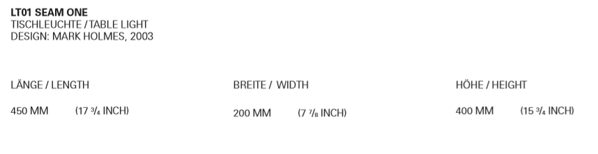 The light SEAM ONE is a modern interpretation of a classic table light. Made of three firmly bonded components of powder-coated, folded sheet aluminium, the number of parts has been reduced to the essentials to provide the strongest focus on the element of light itself. Applying simple but elaborated construction methods and balanced proportions, the light reflects e15's brand ethos of high grade materials paired with extraordinary craftsmanship.