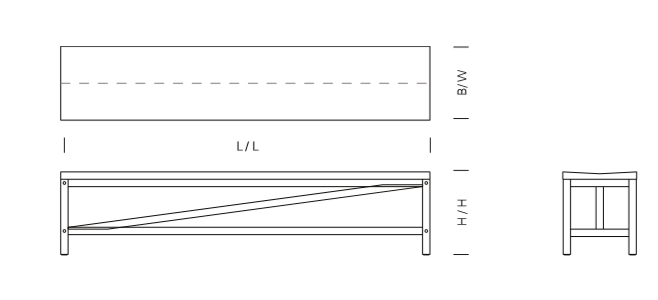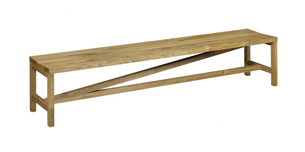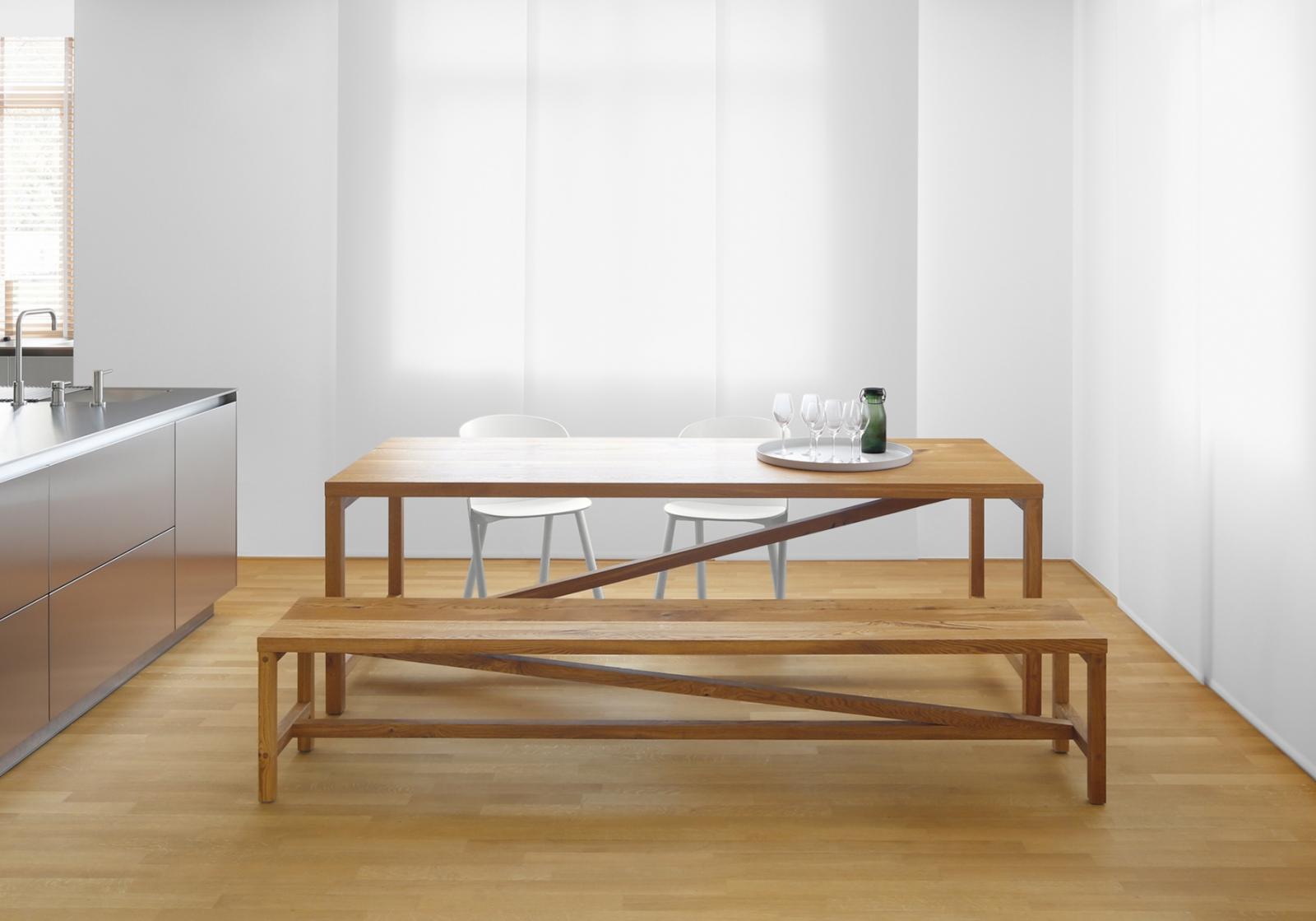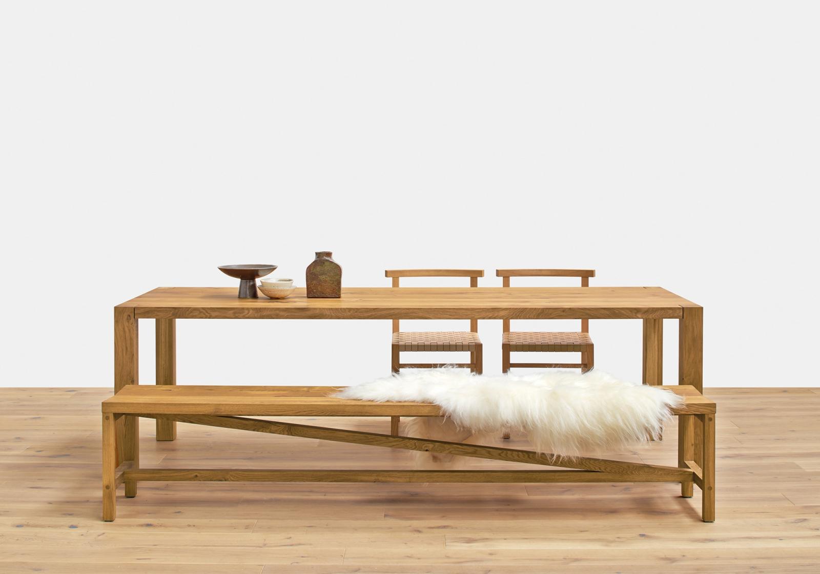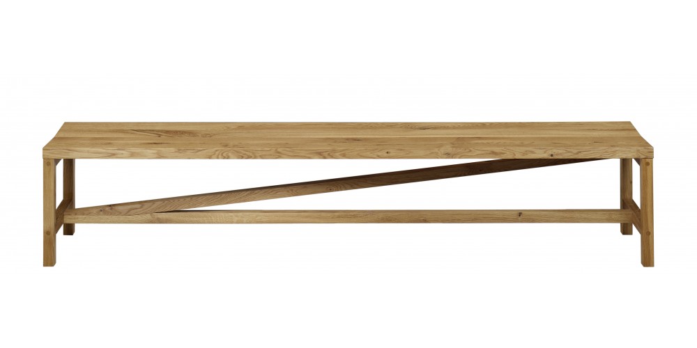 Bench SITZ reflects the design language of table PLATZ and is a natural complement. The signature diagonal bar dominates the character of the solid wood bench, highlighting the casual and stable construction. The frame is mortised with visible solid wood dowels, emphasising the construction detail and wood surface of the bench. Its asymmetric detail and distinct character make SITZ a noteworthy and versatile piece. The bench SITZ is available in seven lengths.