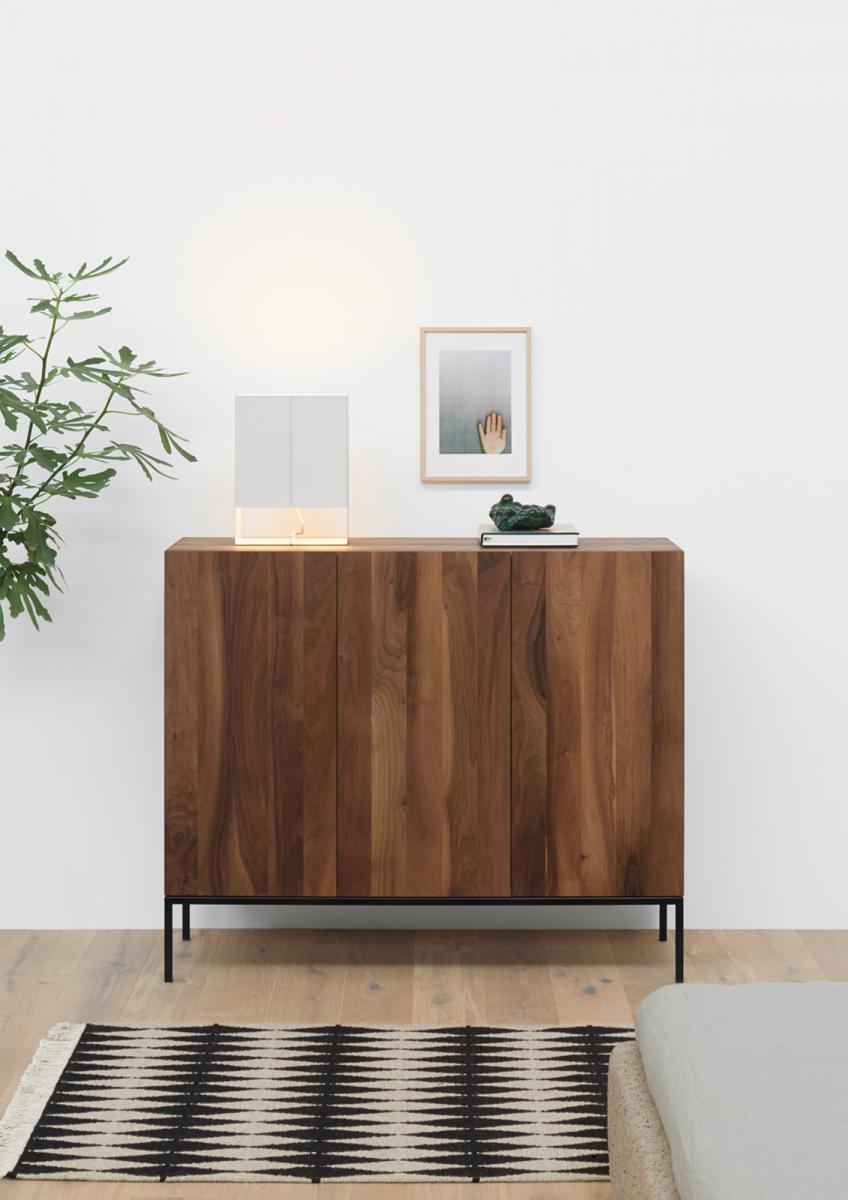 The sideboard FARIBA is particularly striking with its vertical display of solid wood grain. FARIBA elegantly highlights the combination of solid wood and a seamless stainless steel frame. The sides of the drawers have an end-to-end bevel functioning as handle. FARIBA is also available in a two door version and with a powder-coated steel frame.