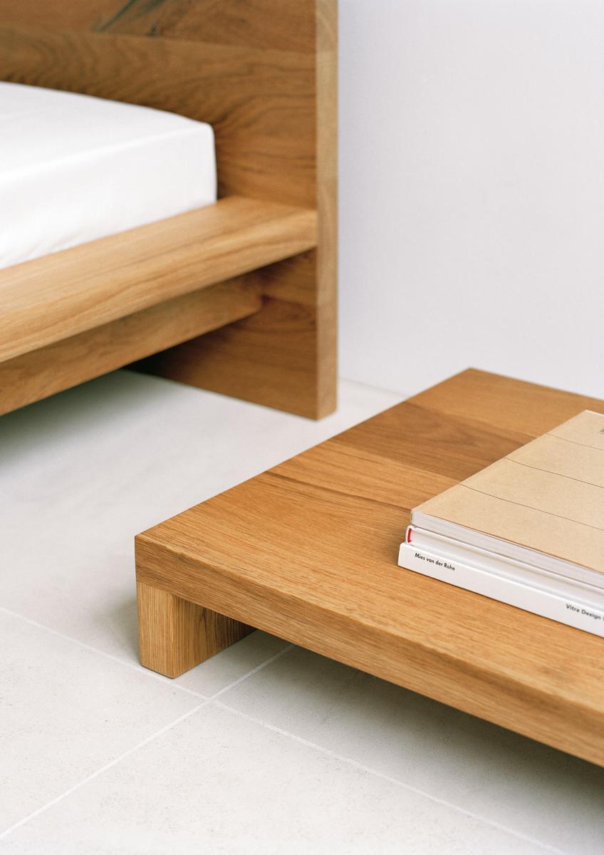 The solid wood bedside table MAX persuades with its simple design and perfectly fits into various environments. It combines well with the MO bed.