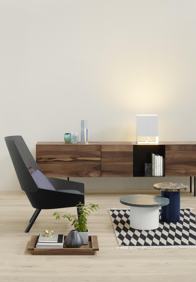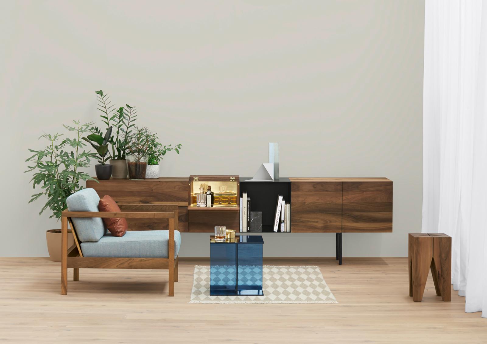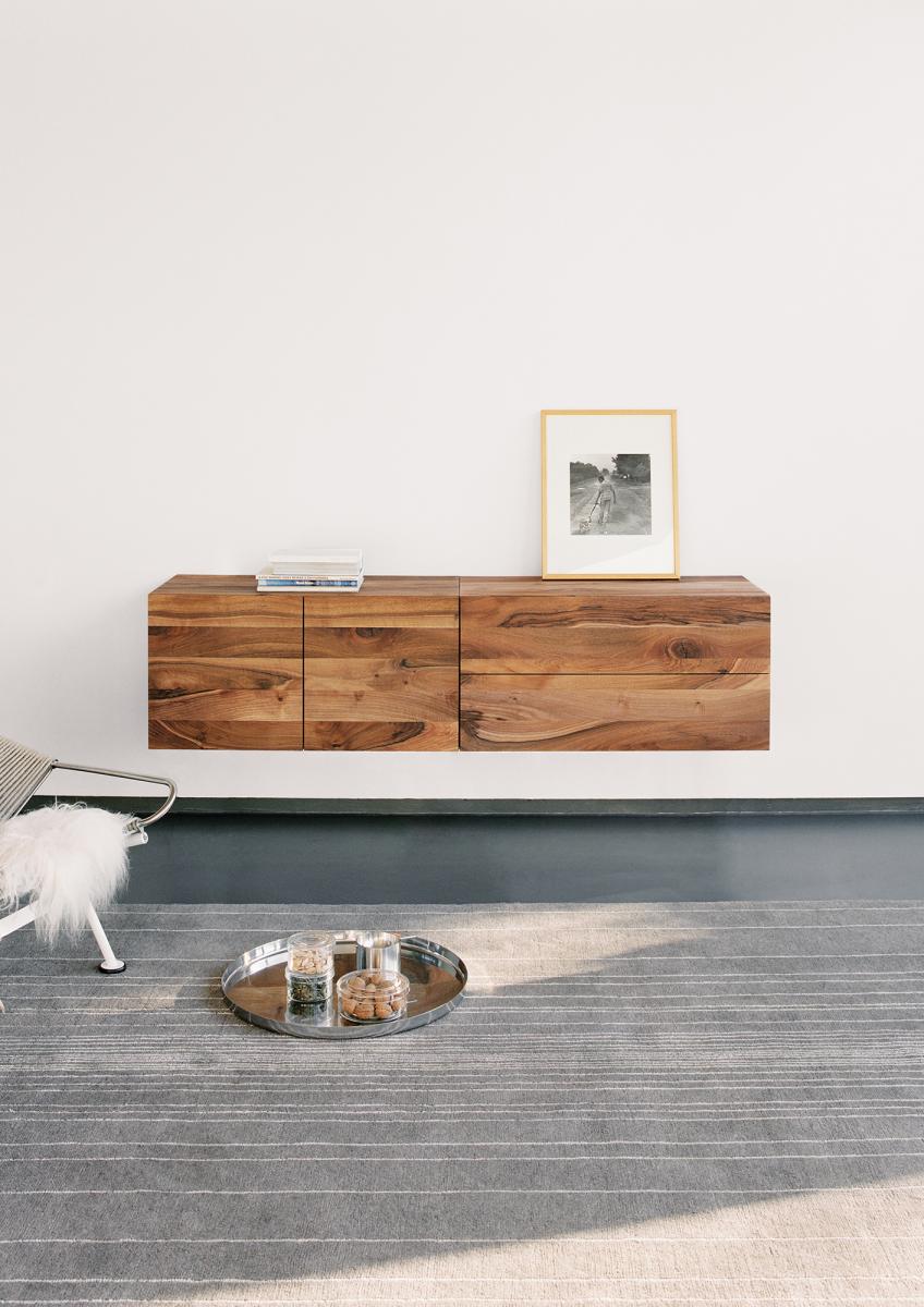Chest of drawers MAHNAZ is the wall-mounted adaption of the sideboard FATIMA. Even its body is made of solid wood, the sideboard floats effortlessly. The clear design of MAHNAZ benefits from a concept that eliminates visible frames and excludes all unnecessary and obtrusive elements. MAHNAZ can be combined the bar cabinet ARAQ and open shelf DARA.