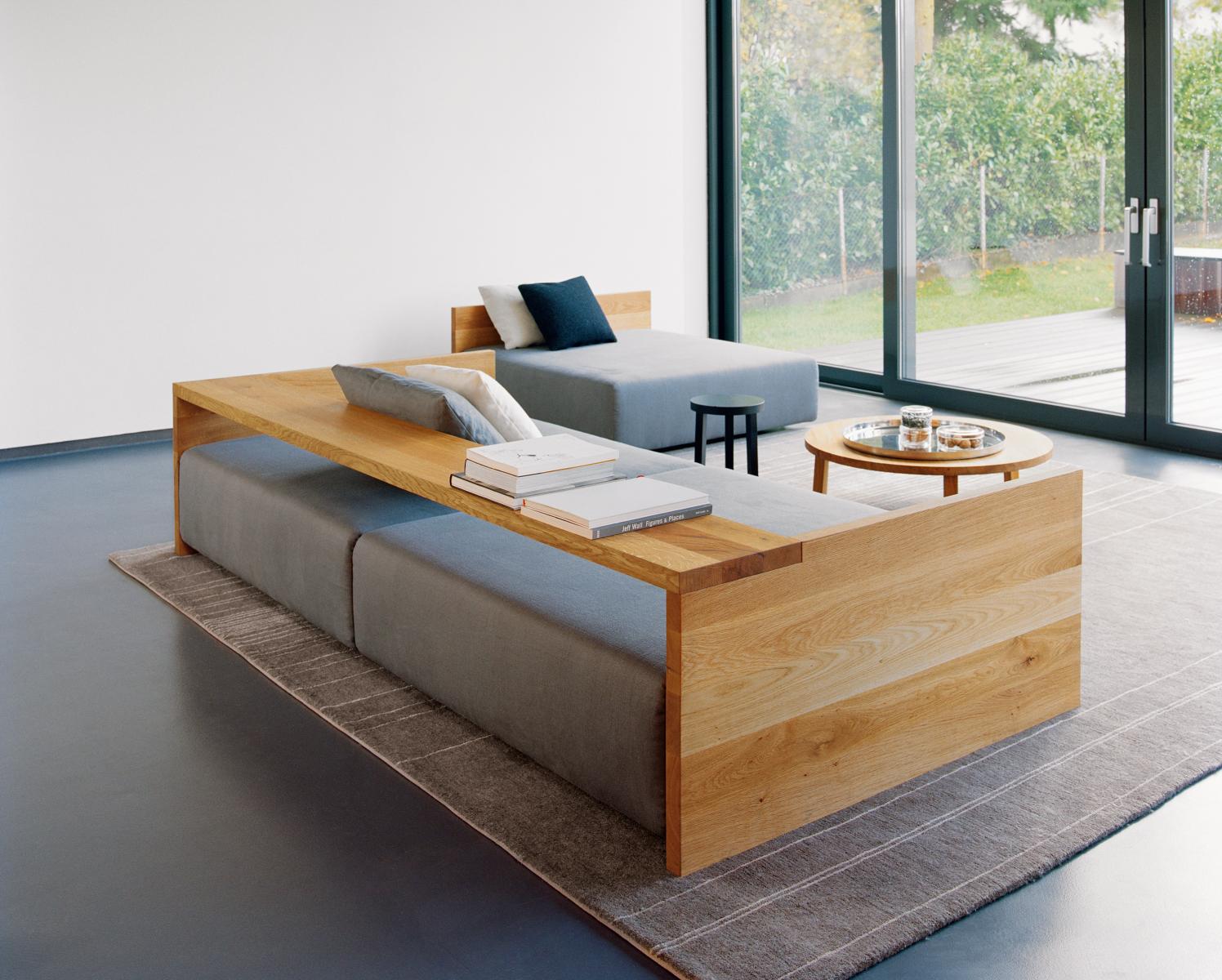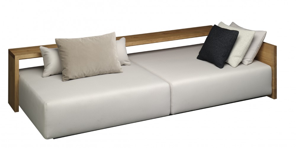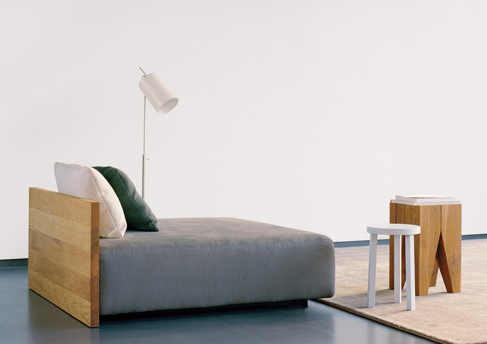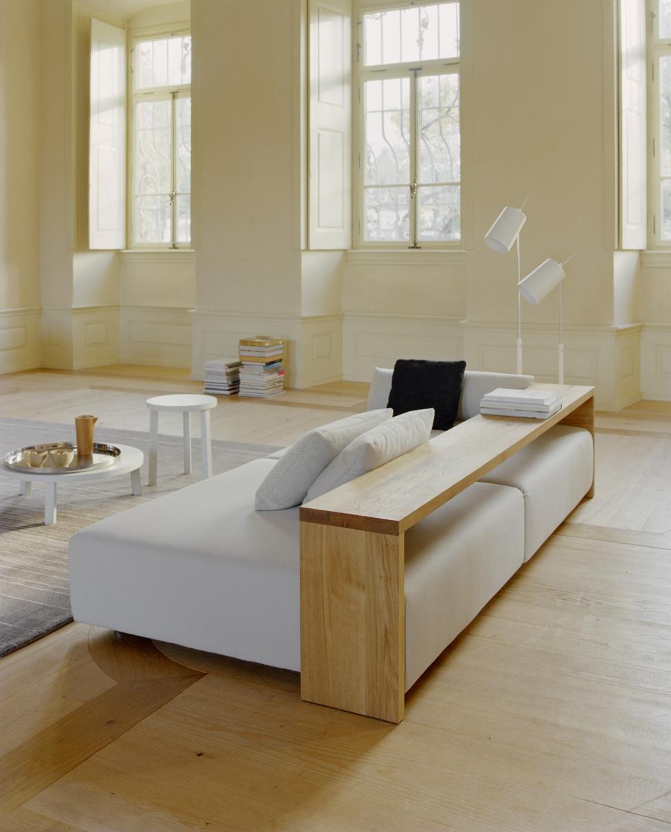 In its form and material, the KASHAN sofa epitomizes the logical continuation of e15 design. The 550 MM (21 5/8 INCH) tall backrest is notched to the equally tall side frames, underscoring the contrast of the cross grain and the end grain where the two intersect. The seating height is 350 MM (13 3/4 INCH). Removable fabric covers are available in different textures and colours. Six pre-selected fabric combinations, as well as sample fabrics for individual selections are available from e15 upon request.