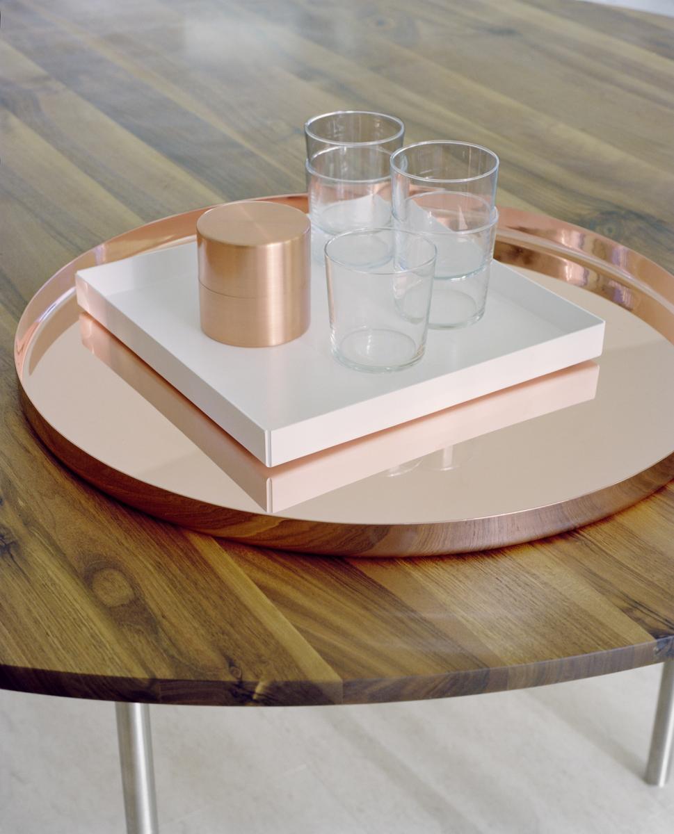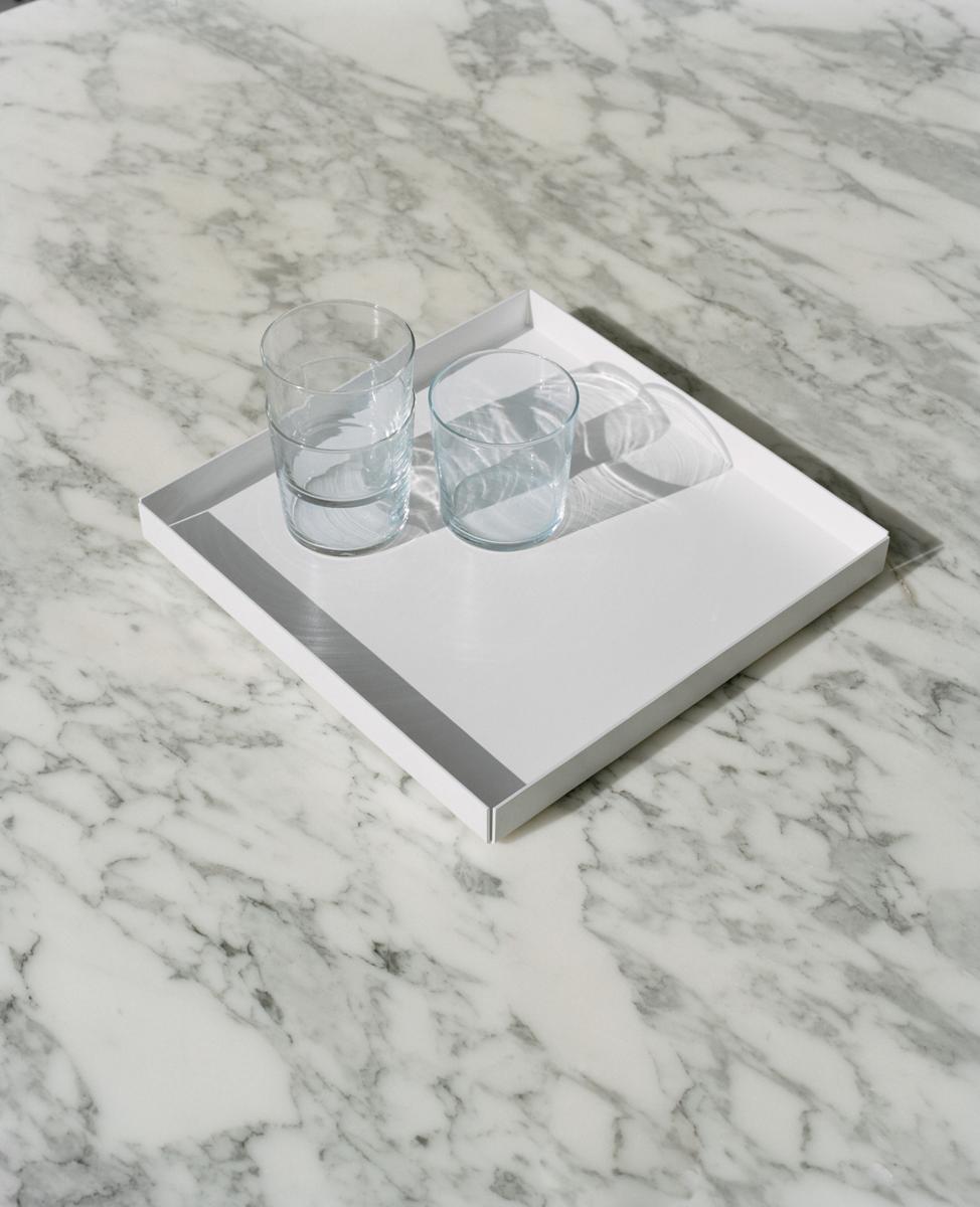 The square shaped tray ITO by Philipp Mainer is a modern and versatile accessory. The tray ITO is made of folded powder-coated sheet aluminium and available in different colours. In addition to powder-coated aluminium, ITO is now also available in luxurious hand-polished stainless steel, copper and brass.