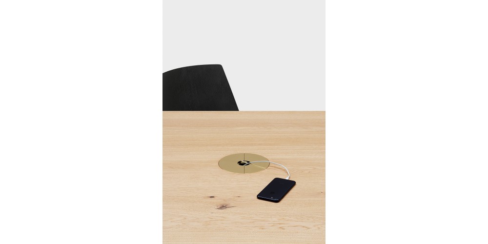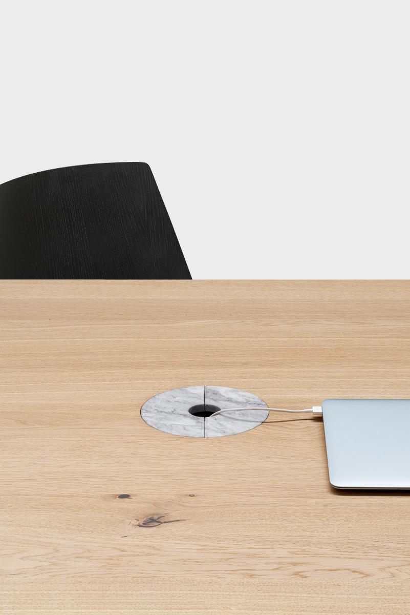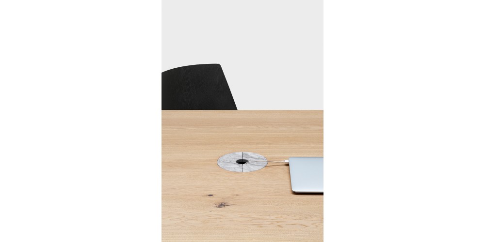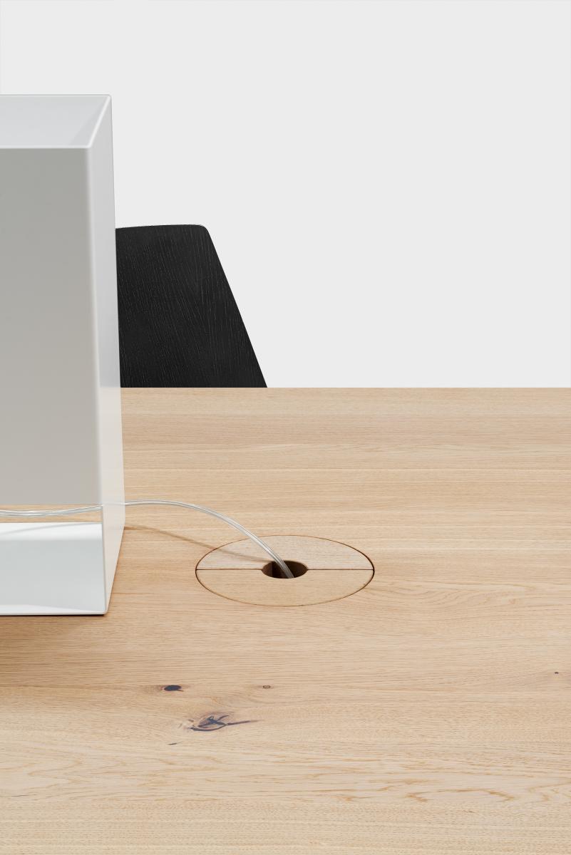 e15 tables can also be ordered with an integrated wire management solution. Adaptations are possible regarding material, dimensions, form, colours as well as different finishes.