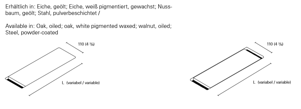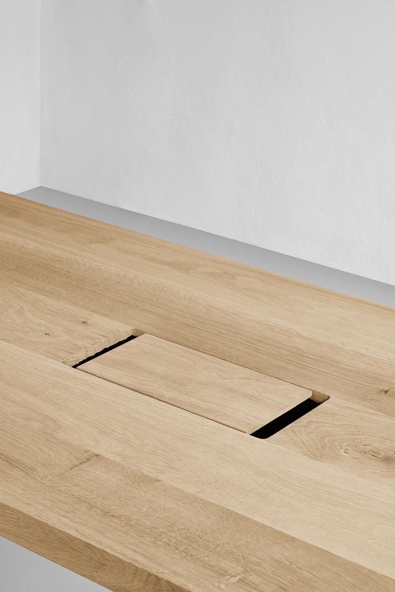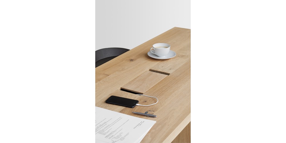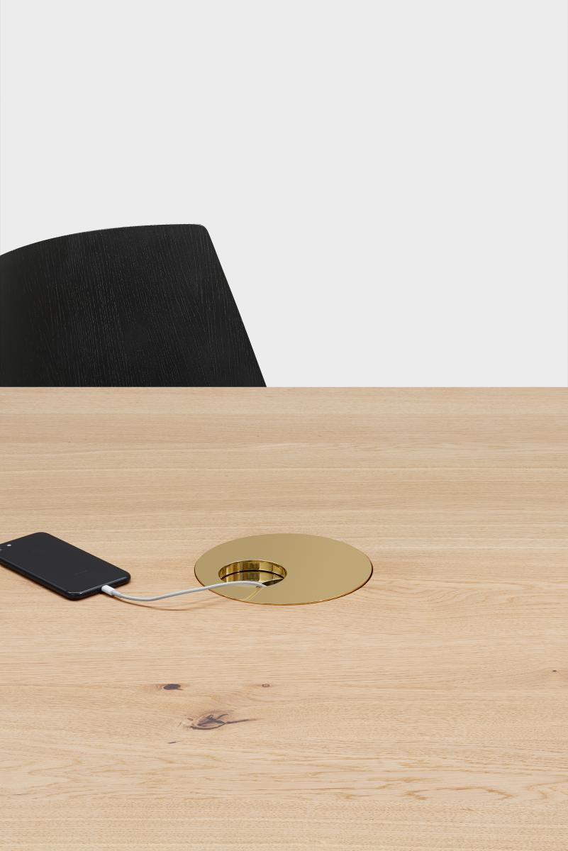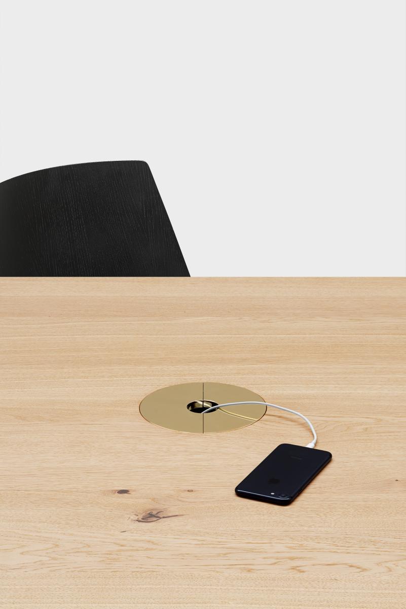 e15 tables can also be ordered with an integrated wire management solution. Adaptations are possible regarding material, dimensions, form, colours as well as different finishes.