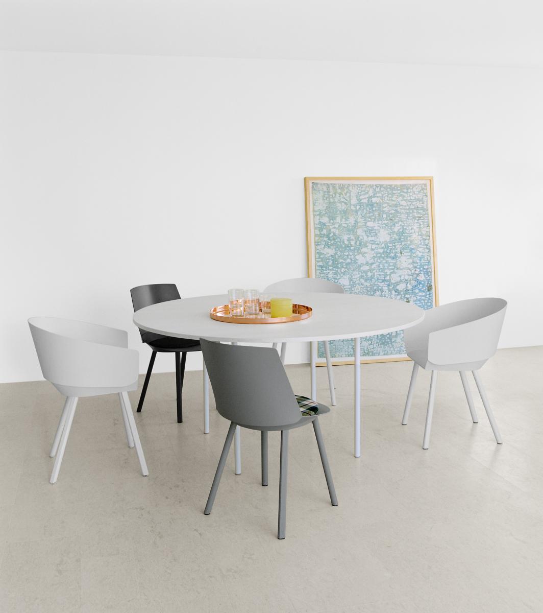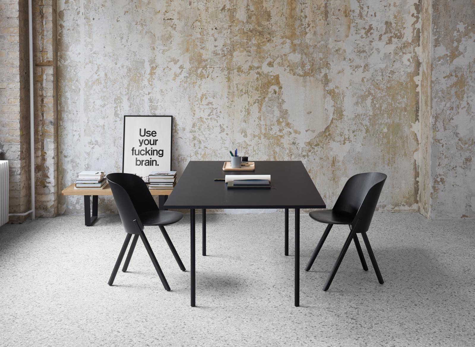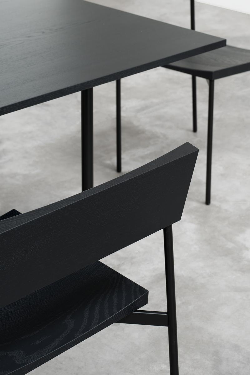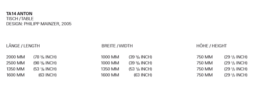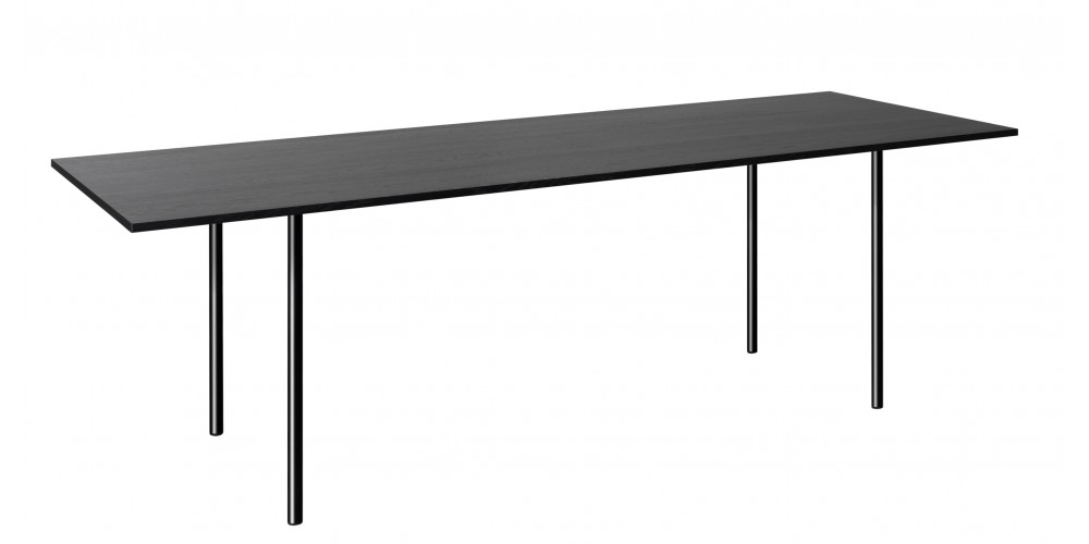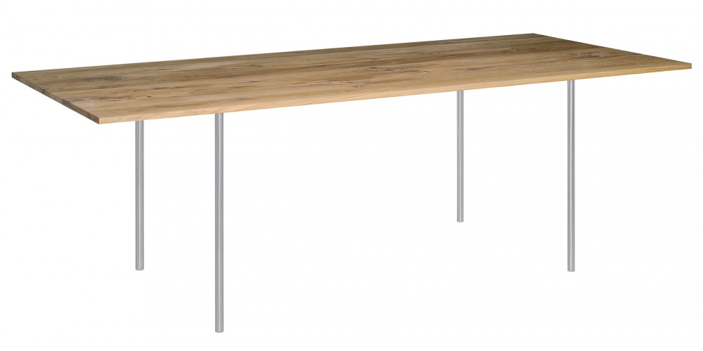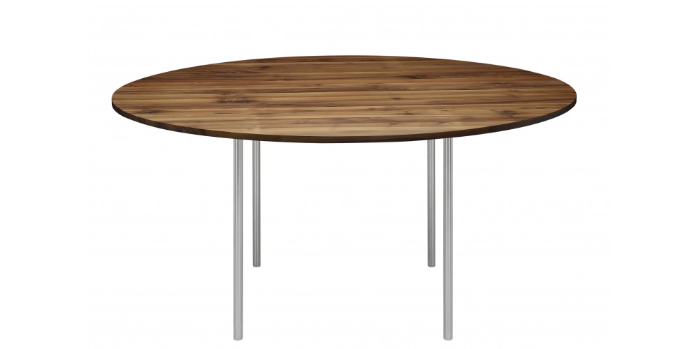 The table ANTON illustrates an uncompromising focus on the essentials with regards to material and form. The table top has been constructed using 8 solid wood planks and is only 20 MM (3/4 INCH) thick. The walnut tabletop is build out of 11 planks. The legs have a diameter of 30 MM (1 1/8 INCH), are removable, and come in either powder-coated steel or brushed stainless steel. The table top and frame come bolted together.