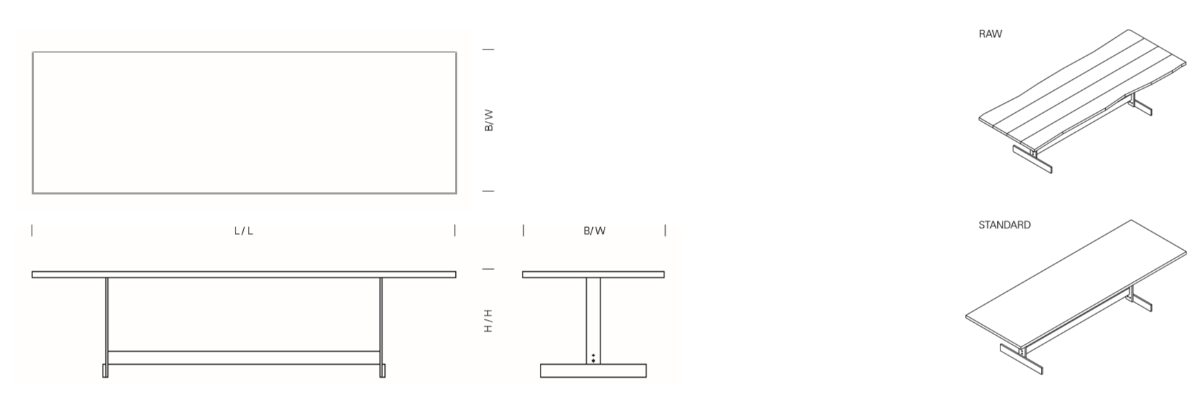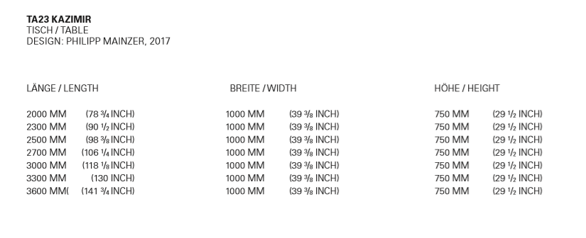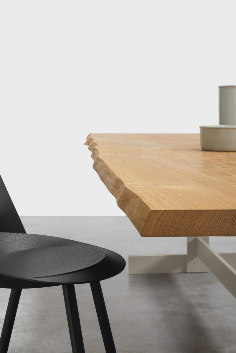 Inspired by Suprematist compositions, table KAZIMIR by Philipp Mainzer features a bold mix of geometric forms and materials. Focussing on a distinct construction, the tabletop made from solid European oak or walnut rests on a metal centre base, allowing for various interpretations in private and public spaces. Available in a range of standard and custom colours as well as exclusive materials such as galvanised zinc, blackened steel and brushed brass, the frame features a characteristic refectory table construction, which provides stability for tables up to 3600 MM (141 34 INCH) and generous seating at the table ends. KAZIMIR RAW features solid wood boards with a width of up to 250 MM (9 78 INCH) exposing the brushed natural edges of the tree.