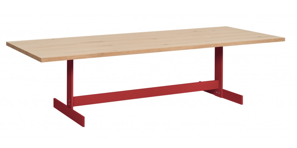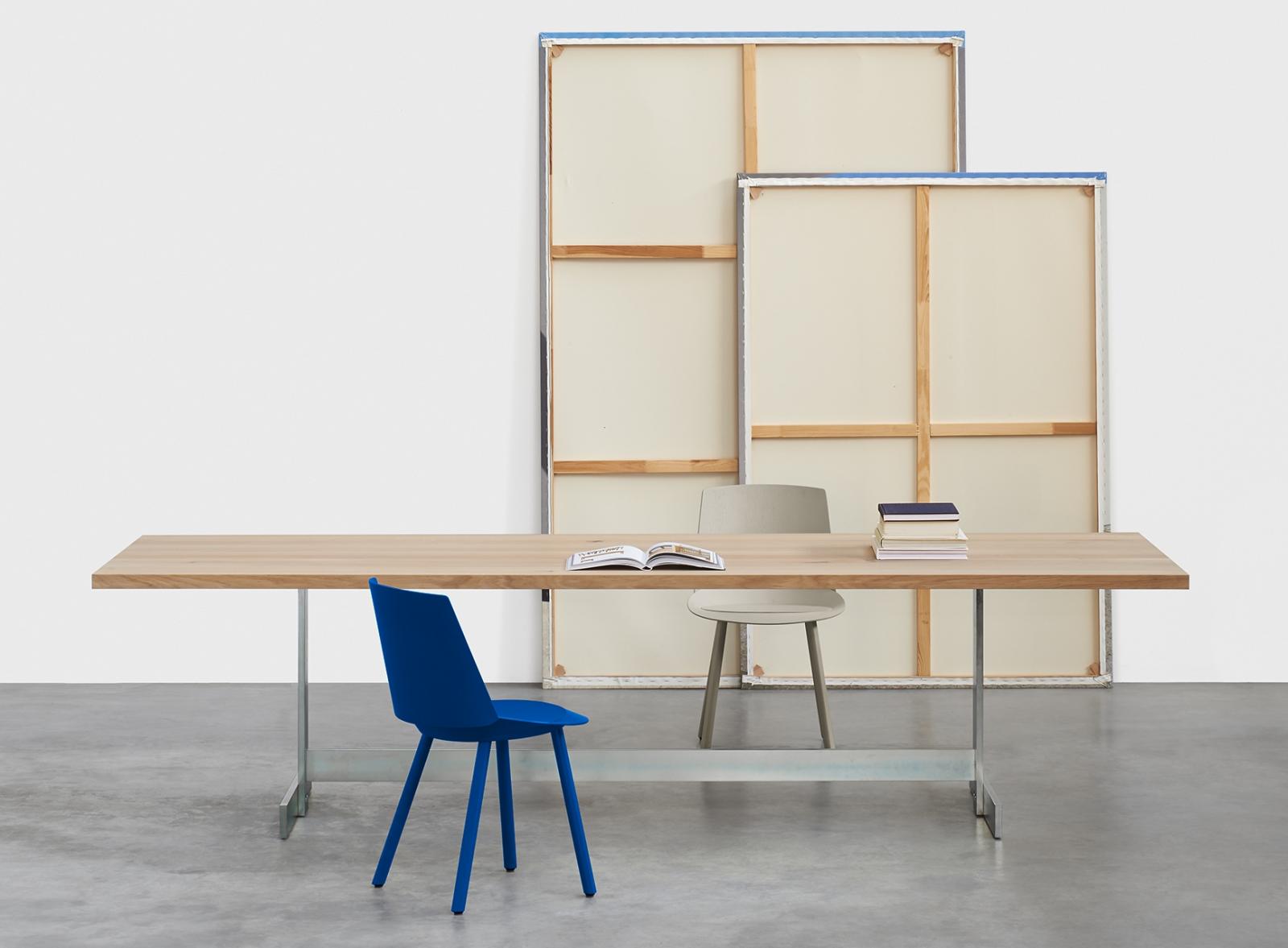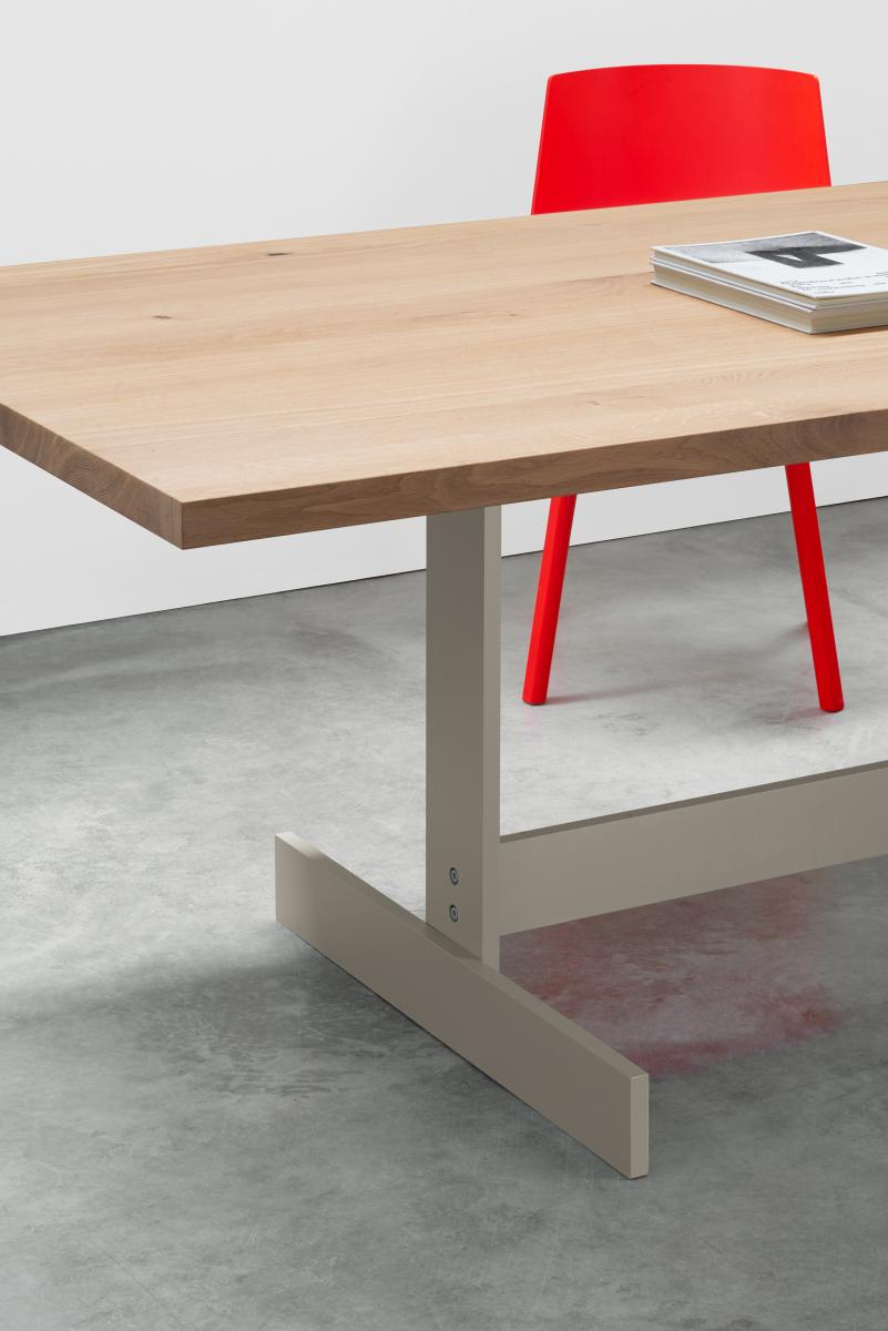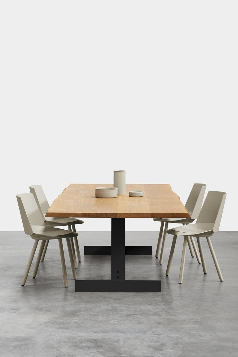 Inspired by Suprematist compositions, table KAZIMIR by Philipp Mainzer features a bold mix of geometric forms and materials. Focussing on a distinct construction, the tabletop made from solid European oak or walnut rests on a metal centre base, allowing for various interpretations in private and public spaces. Available in a range of standard and custom colours as well as exclusive materials such as galvanised zinc, blackened steel and brushed brass, the frame features a characteristic refectory table construction, which provides stability for tables up to 3600 MM (141 3/4 INCH) and generous seating at the table ends. KAZIMIR is also available in a ‘RAW’ version, featuring solid wood boards with a width of up to 250 MM (9 7/8 INCH) exposing the brushed natural edges of the tree.