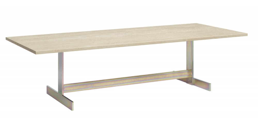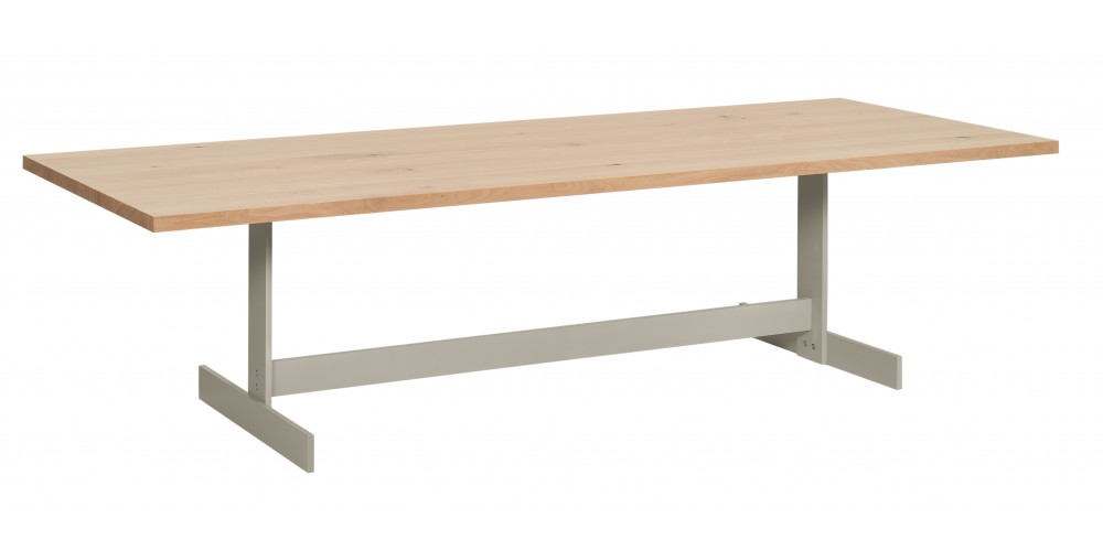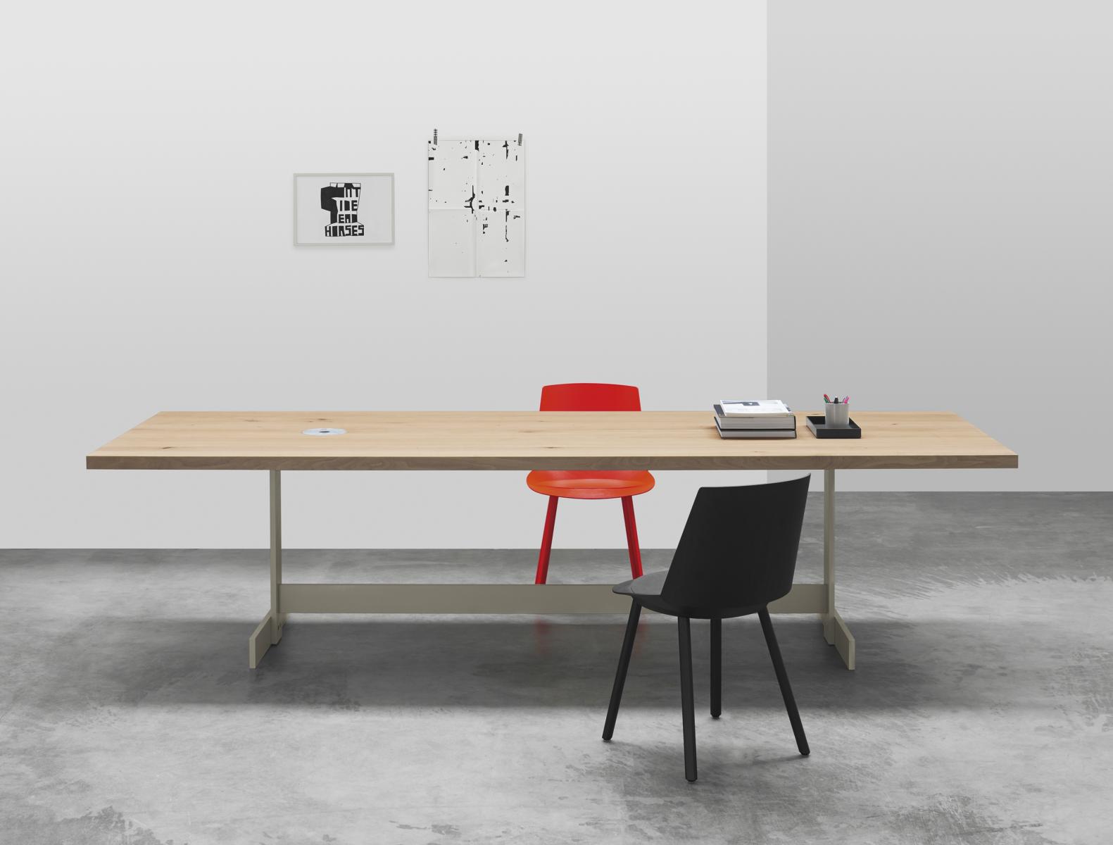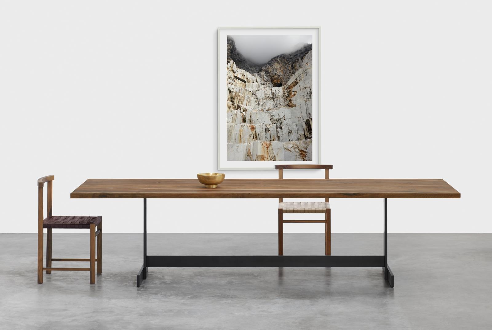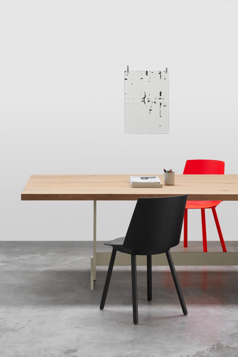 Inspired by Suprematist compositions, table KAZIMIR by Philipp Mainzer features a bold mix of geometric forms and materials. Focussing on a distinct construction, the tabletop made from solid European oak or walnut rests on a metal centre base, allowing for various interpretations in private and public spaces. Available in a range of standard and custom colours as well as exclusive materials such as galvanised zinc, blackened steel and brushed brass, the frame features a characteristic refectory table construction, which provides stability for tables up to 3600 MM (141 3/4 INCH) and generous seating at the table ends. KAZIMIR is also available in a ‘RAW’ version, featuring solid wood boards with a width of up to 250 MM (9 7/8 INCH) exposing the brushed natural edges of the tree.