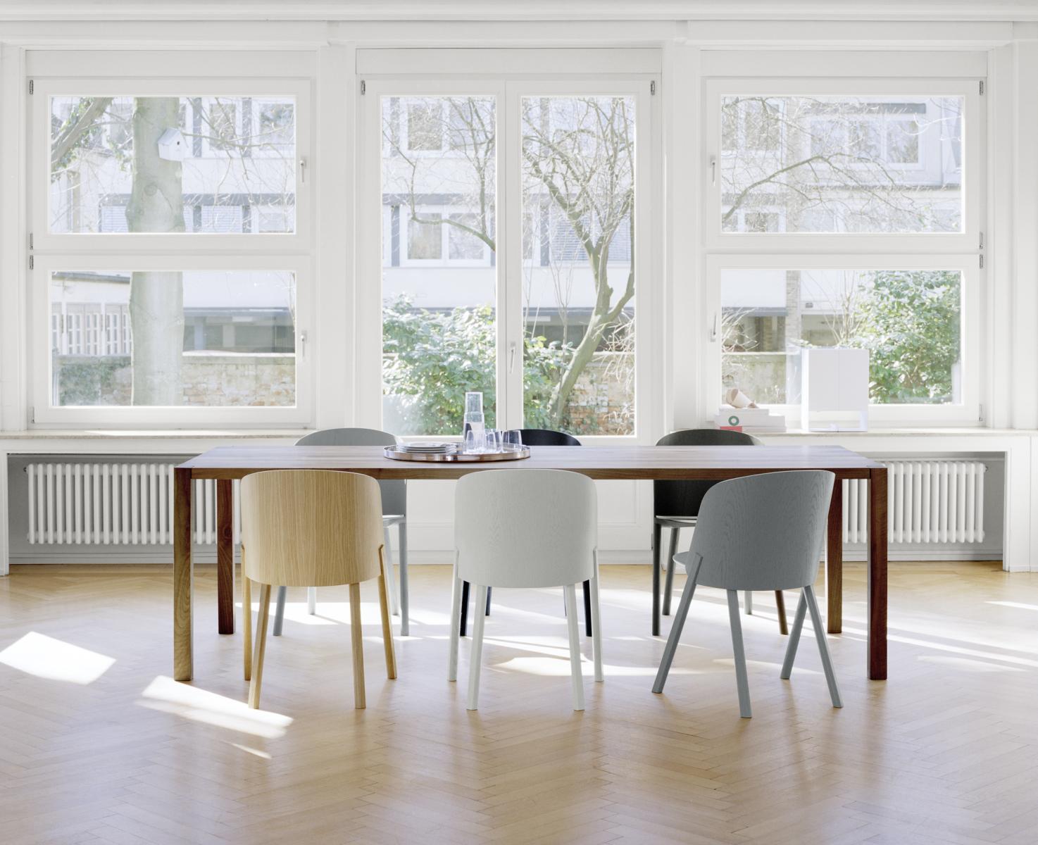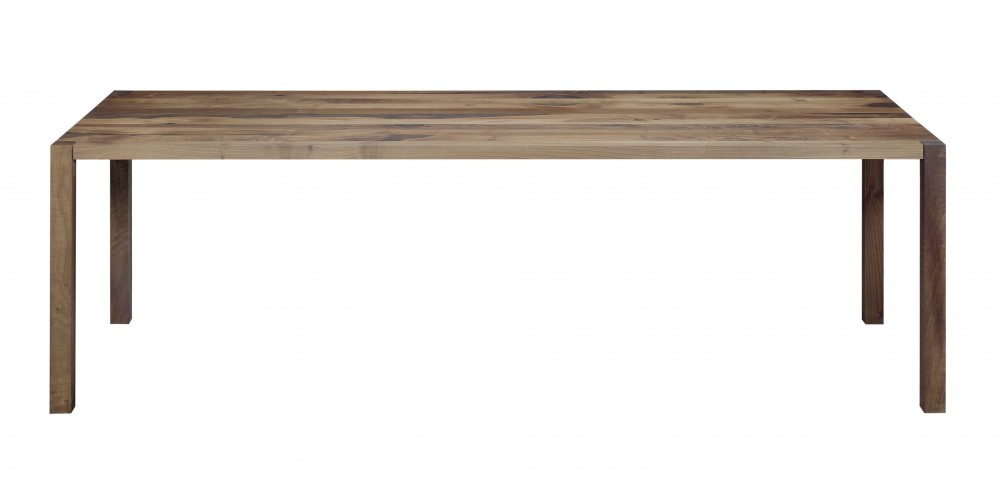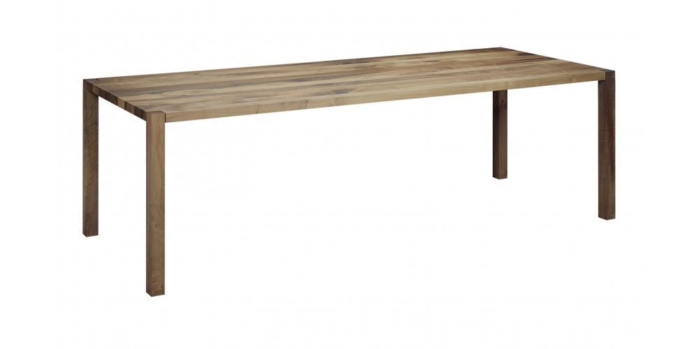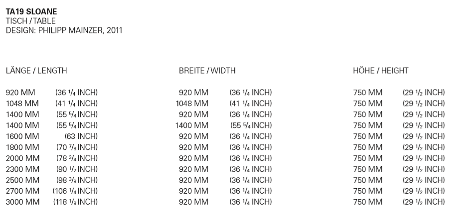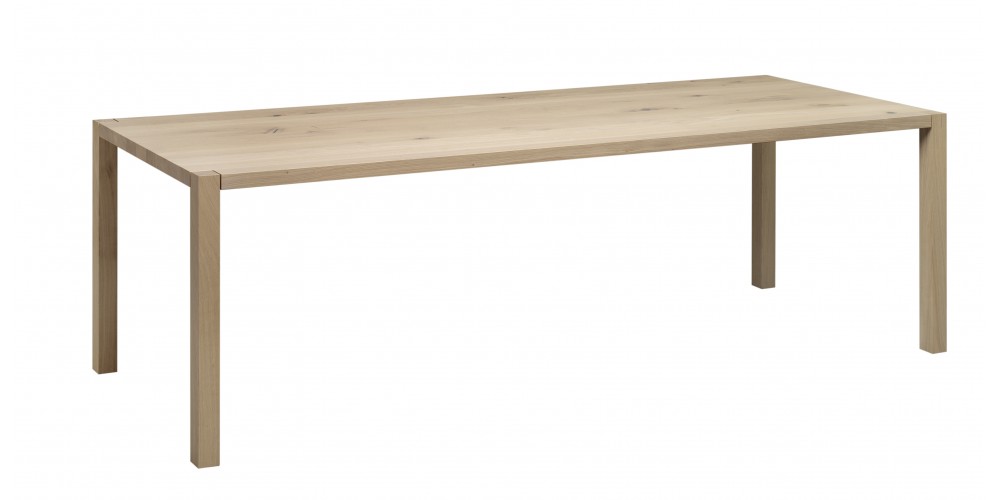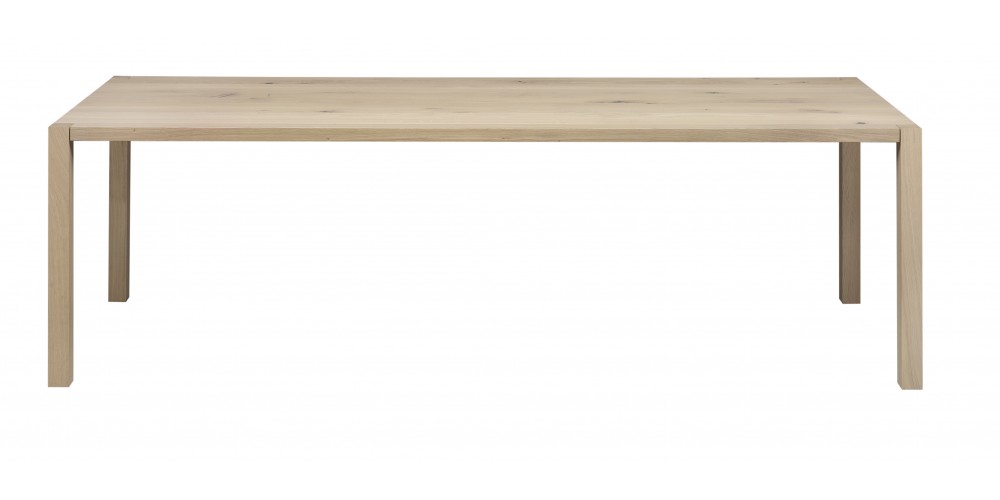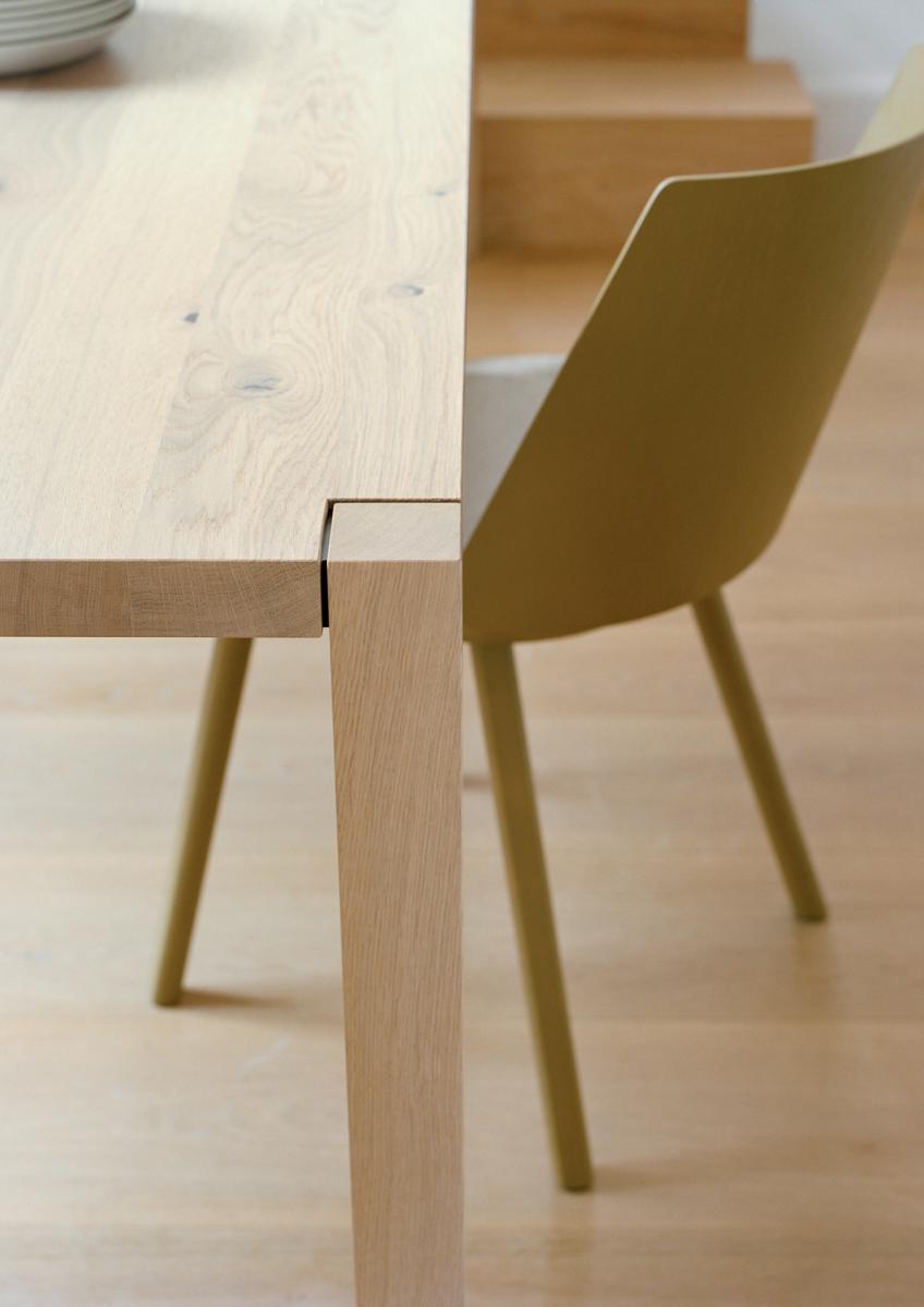 The table SLOANE is a lean and elegant solid wood dining table. Characteristic of iconic e15 solid wood tables, the square legs of SLOANE intersect with the slim 40 MM (1 5/8 INCH) tabletop with the supporting structure incorporated into the tabletop. Its slim silhouette is further emphasised with a new wood finish that is offered for SLOANE, white pigmented waxed, which exudes lightness and elegance. Available from a length of L 1400 MM (55 1/8 INCH), SLOANE is a dining table ideal also for smaller spaces. The clearance underneath the table top measures 710 MM (28 INCH). The table can be disassembled into five parts.