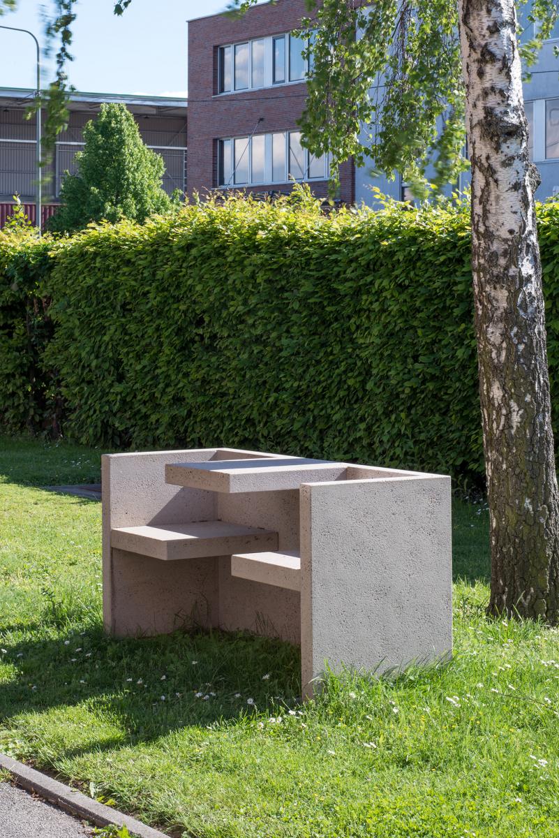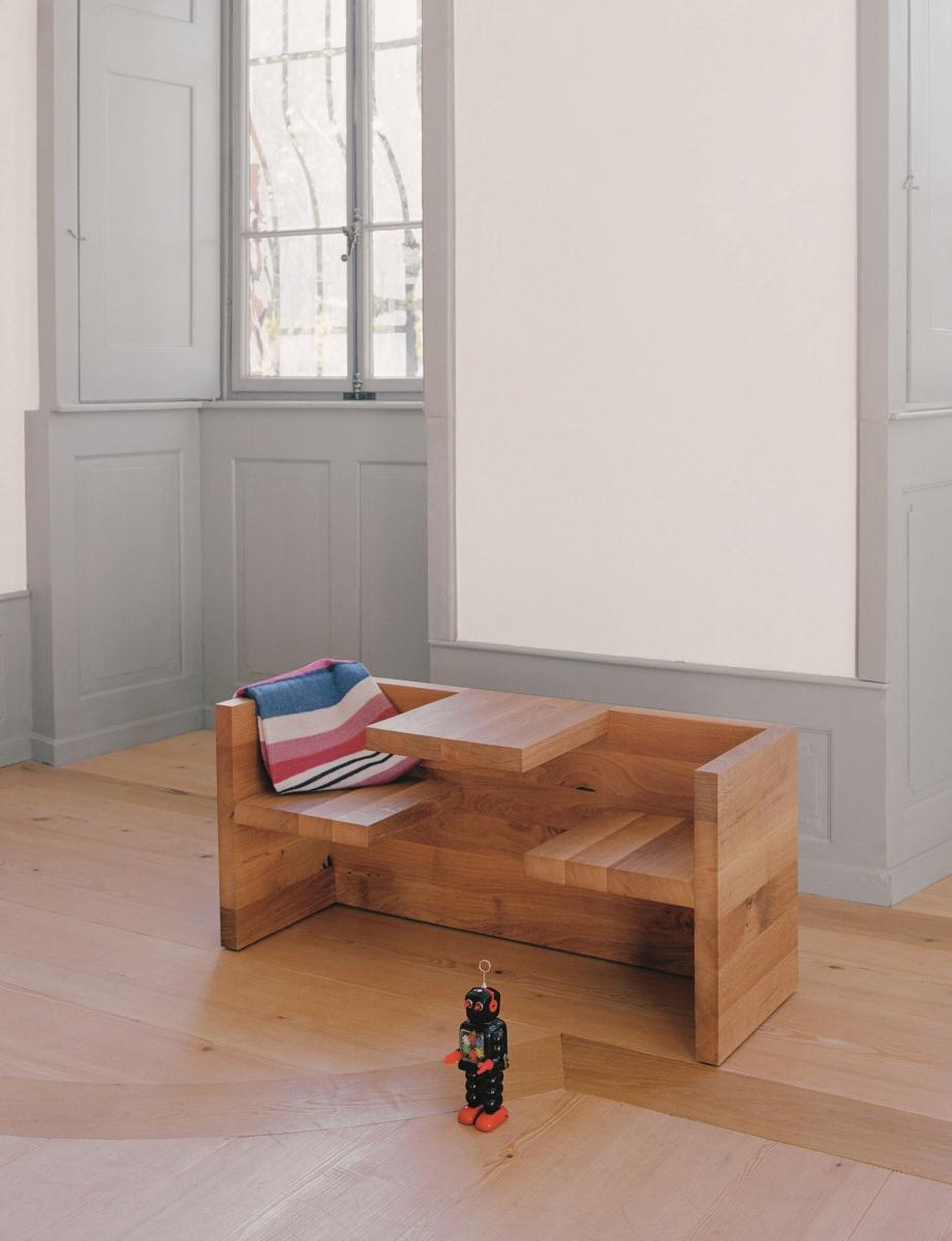 The tablebench TAFEL draws special interest with its sculptural, functional appeal. TAFEL is included in various museum collections. The combination of table and bench creates a unique sitting experience. In equal proportions, but smaller measurements, TAFEL is in its oak version also available for children in 1190 MM (46 7/8 INCH) length.