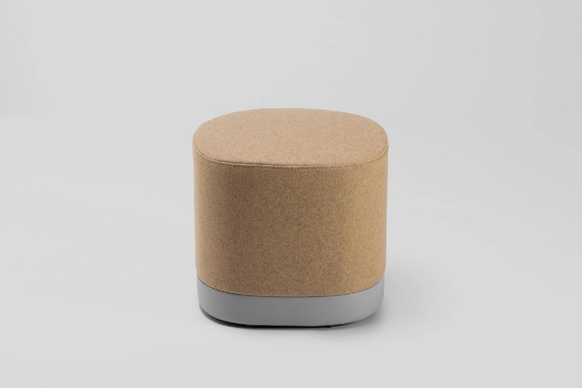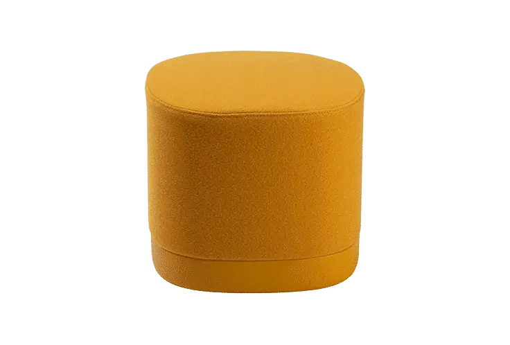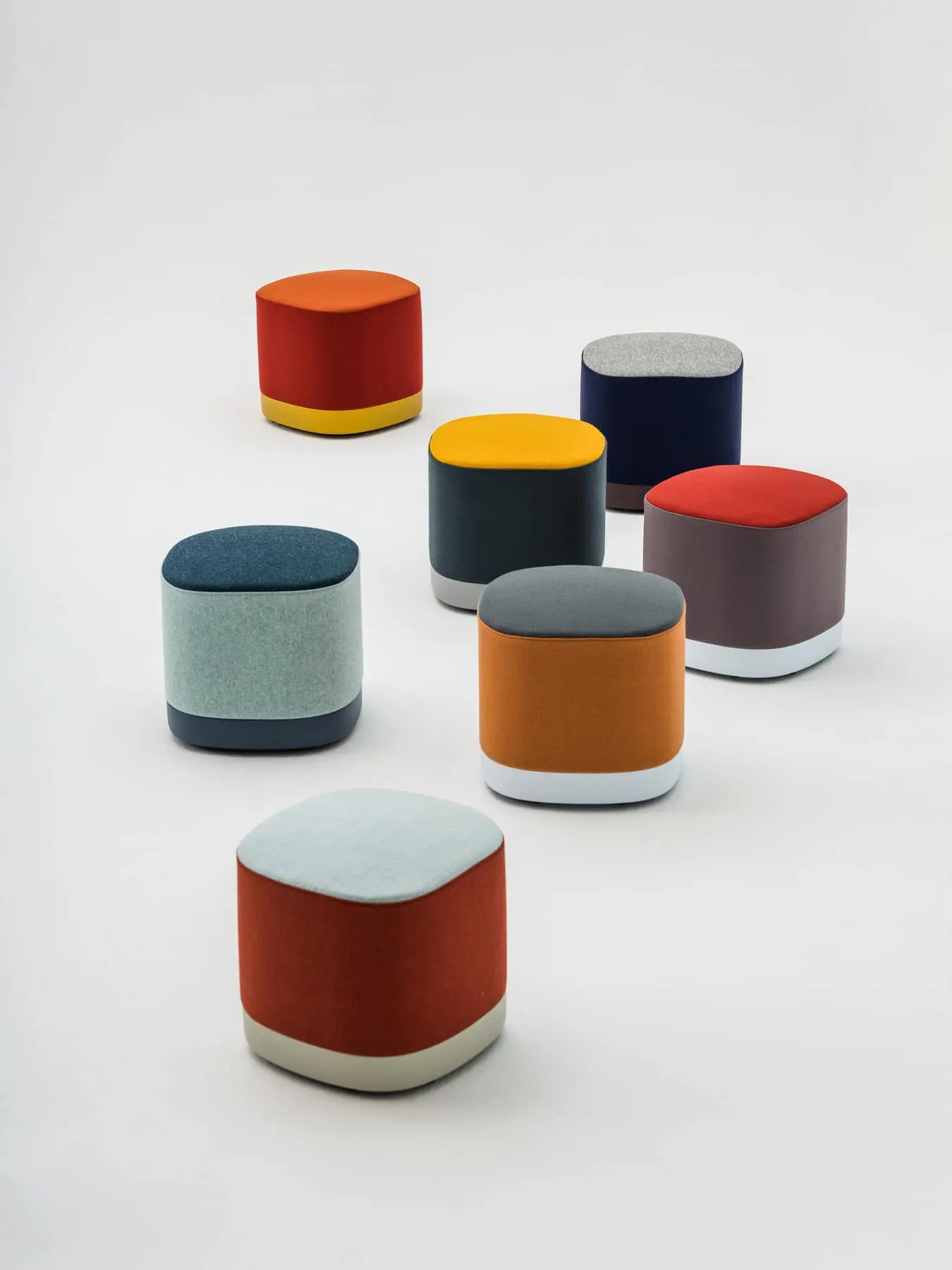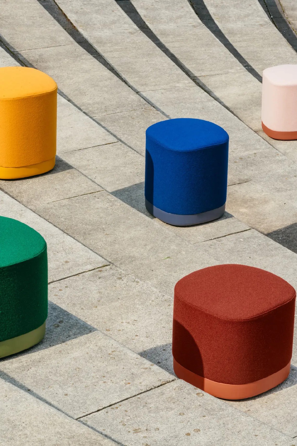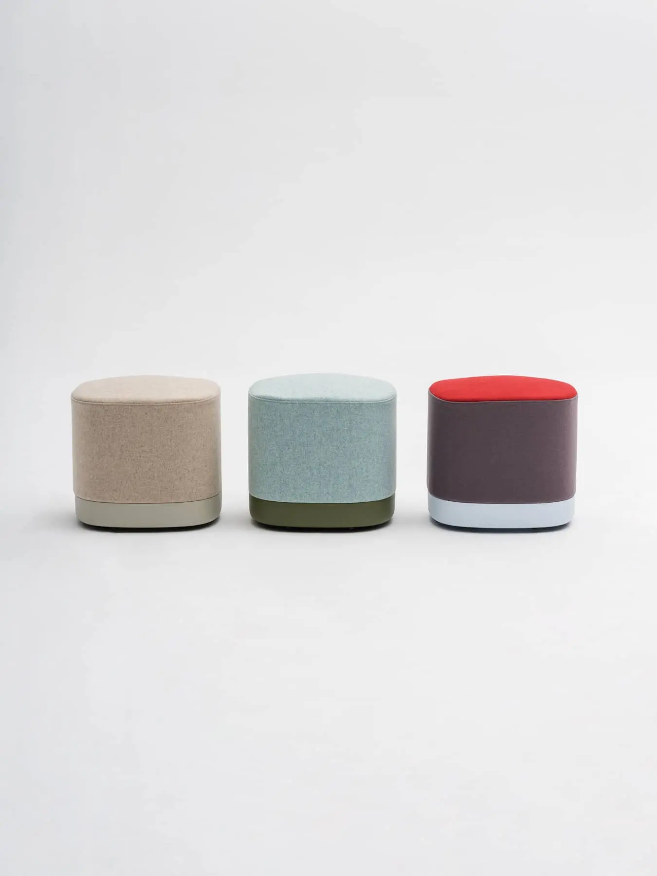 The low Puck pouf has an aluminium base lacquered in any of our colours and with or without castors. The seat can be upholstered in one or two fabrics, and that is why it is possible to combine one, two or three tones in the same pouf.