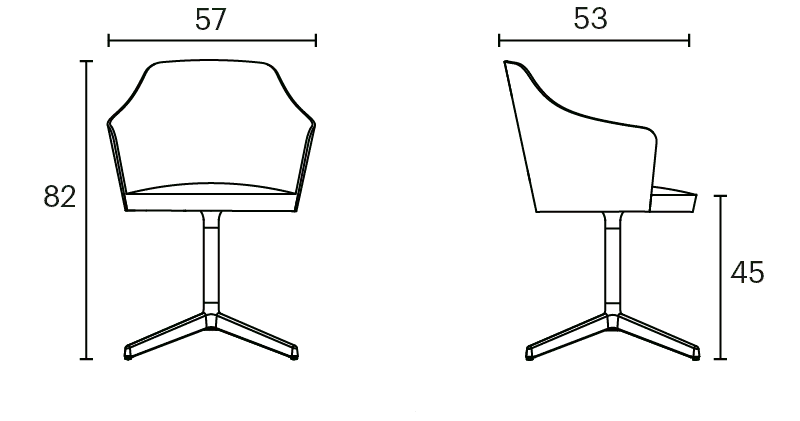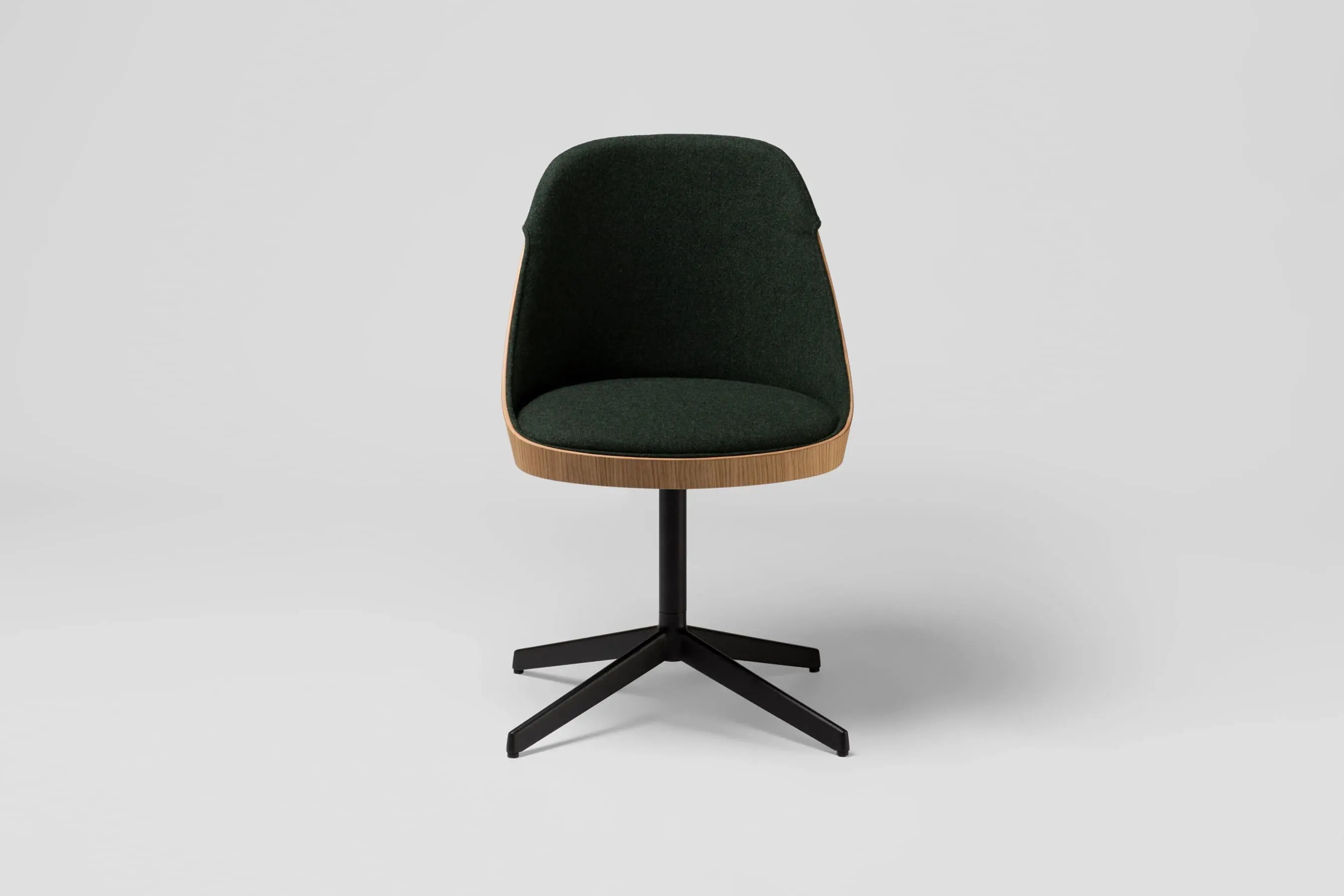 The shell of Kaiak confident chair, available with or without arms, is made of natural or stained oak wood and it has a broad range of upholstery options available: fully upholstered, upholstered seat, three quarters upholstered and inside upholstery. Its 4-star swivel structure can be lacquered in any of our colours.