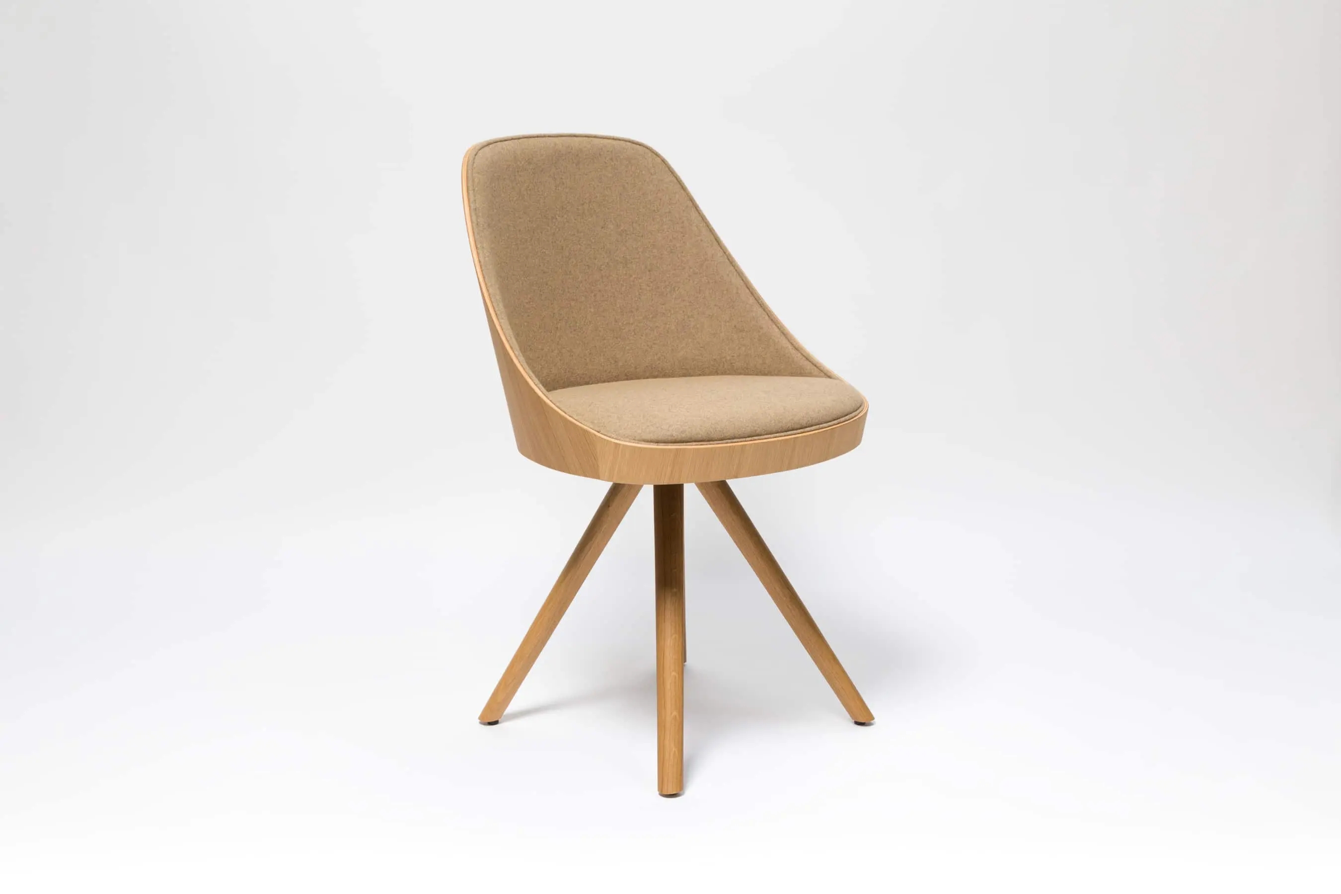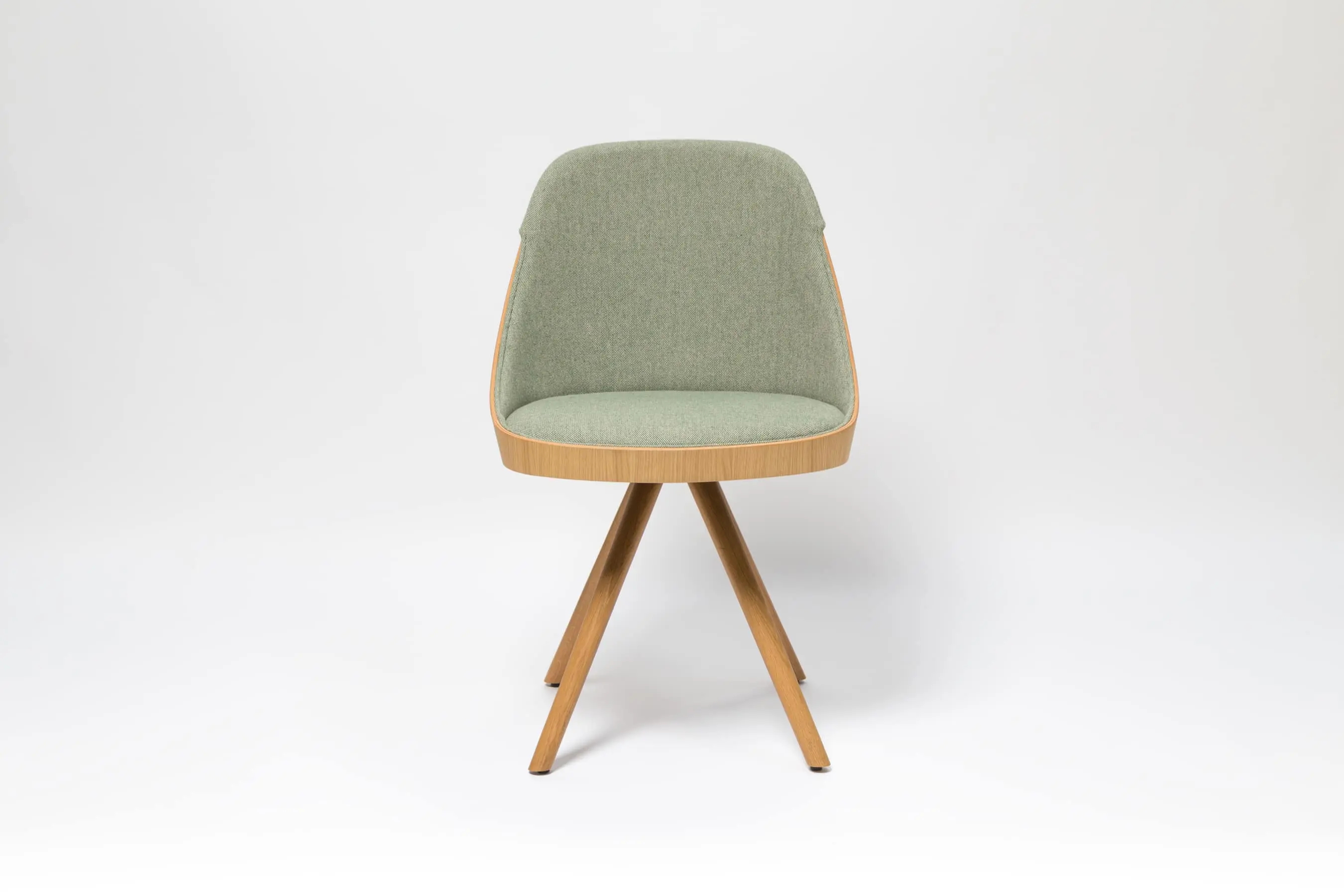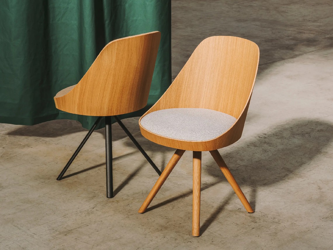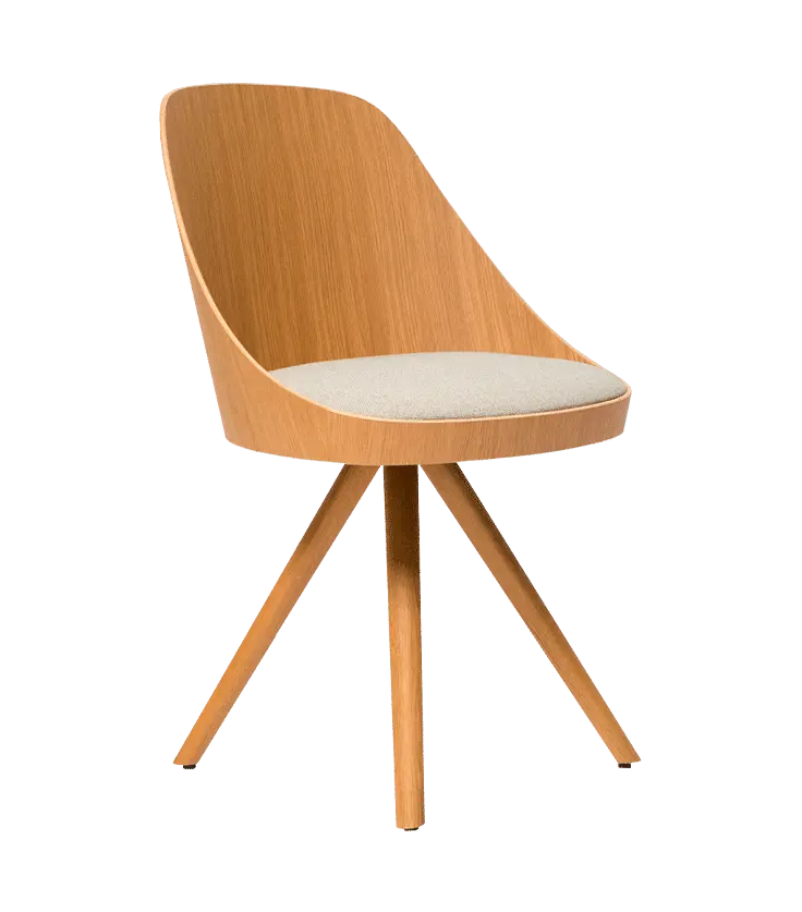 Kaiak spin wood chair, with a natural or stained oak curved shell in combination with solid wooden legs, has a broad range of upholstery options available: fully upholstered, upholstered seat, three quarters upholstered and inside upholstery. This model brings warmth and comfort for soft office or hospitality spaces.
