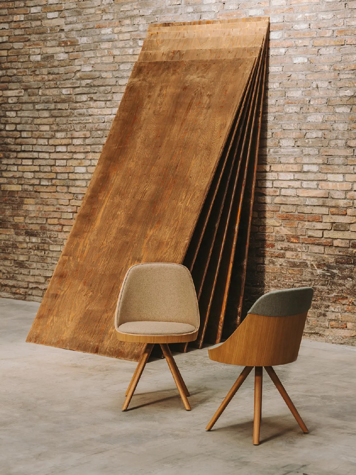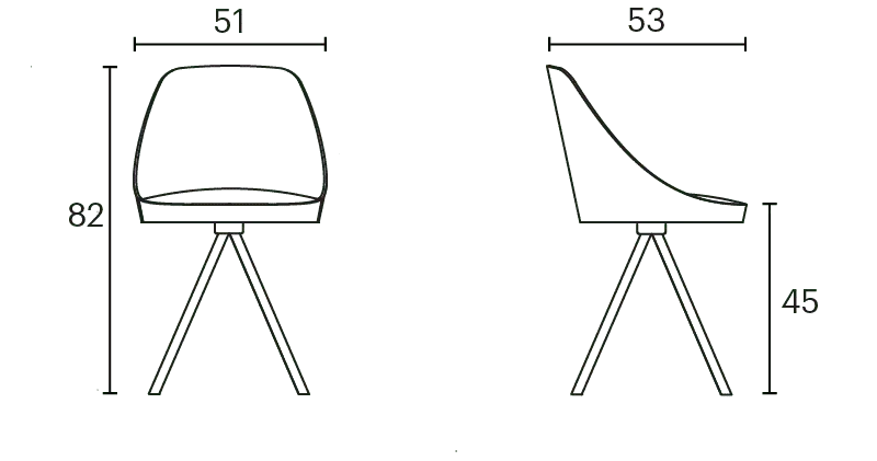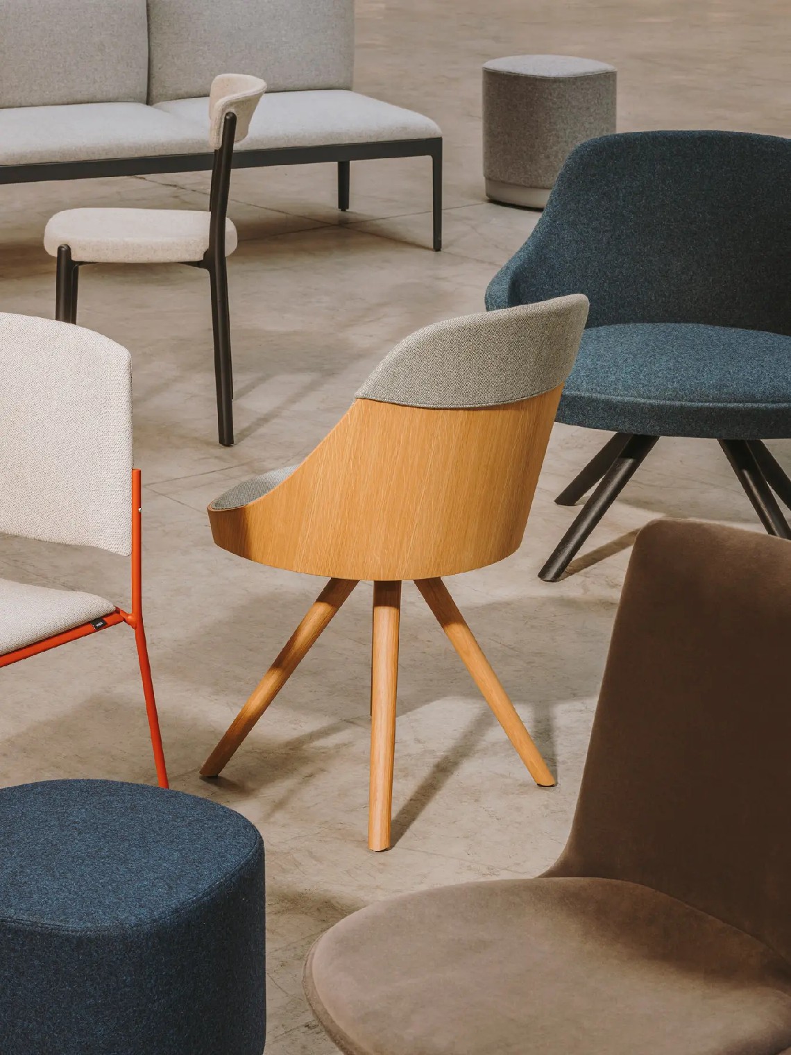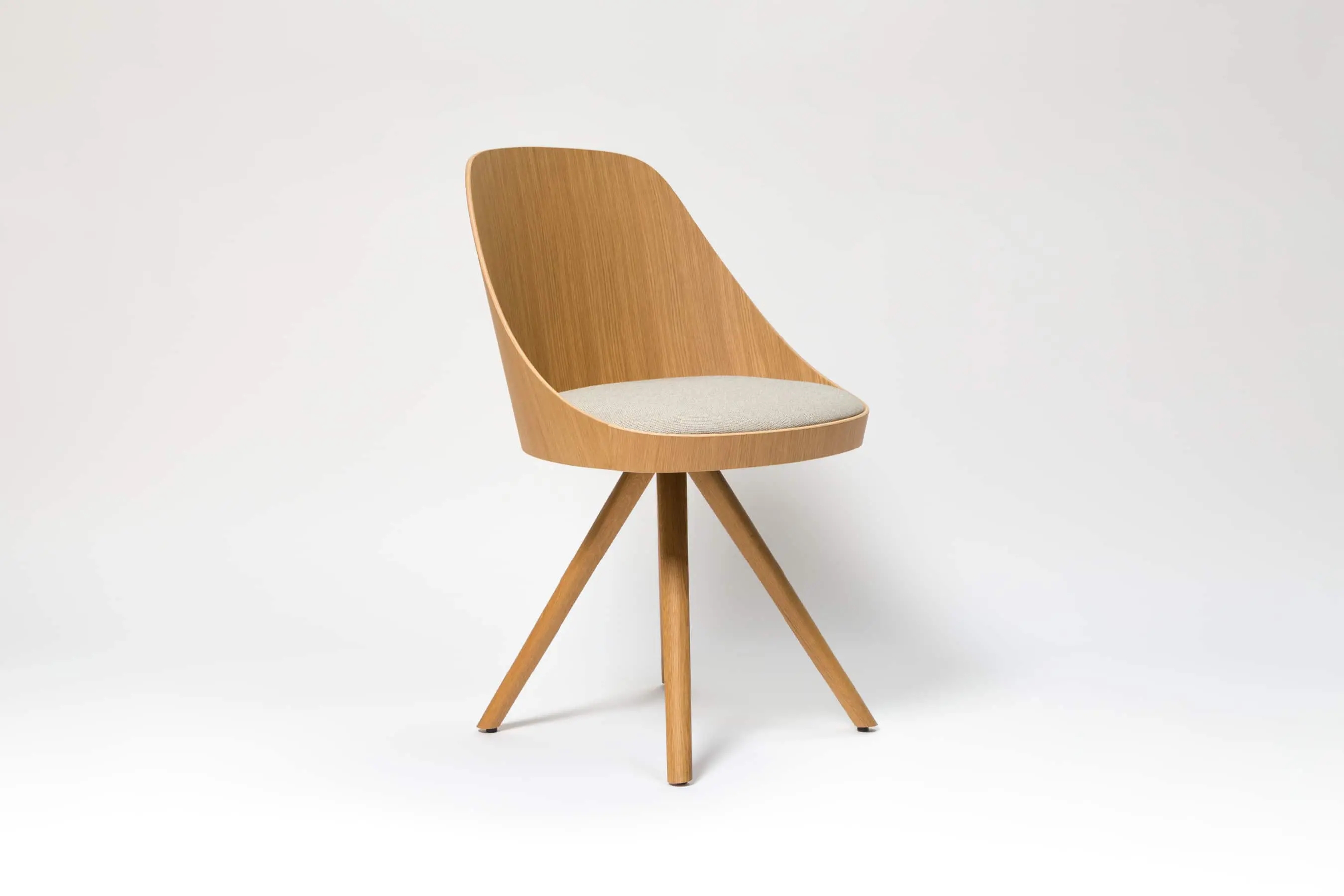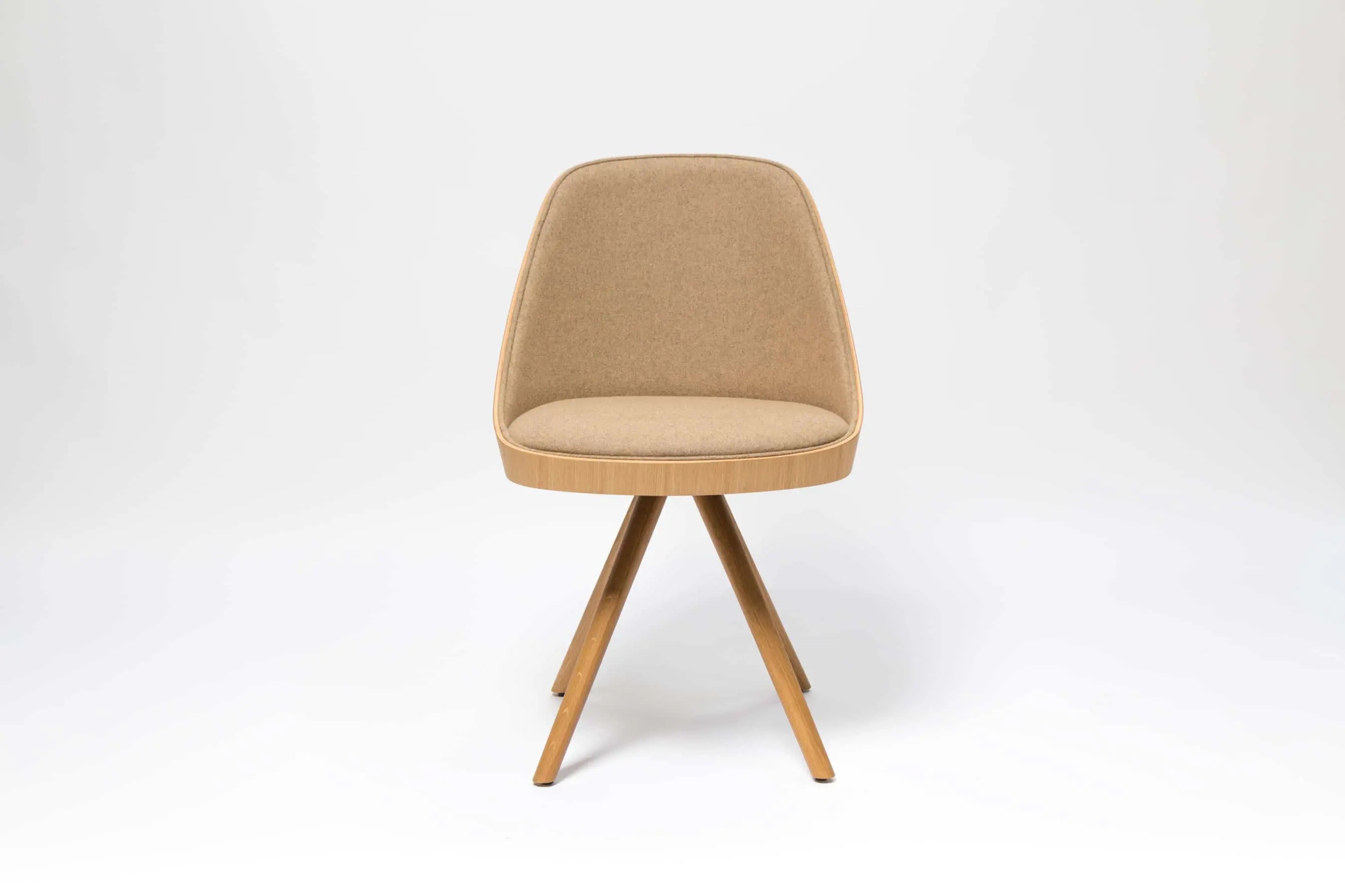 Kaiak spin wood chair, with a natural or stained oak curved shell in combination with solid wooden legs, has a broad range of upholstery options available: fully upholstered, upholstered seat, three quarters upholstered and inside upholstery. This model brings warmth and comfort for soft office or hospitality spaces.