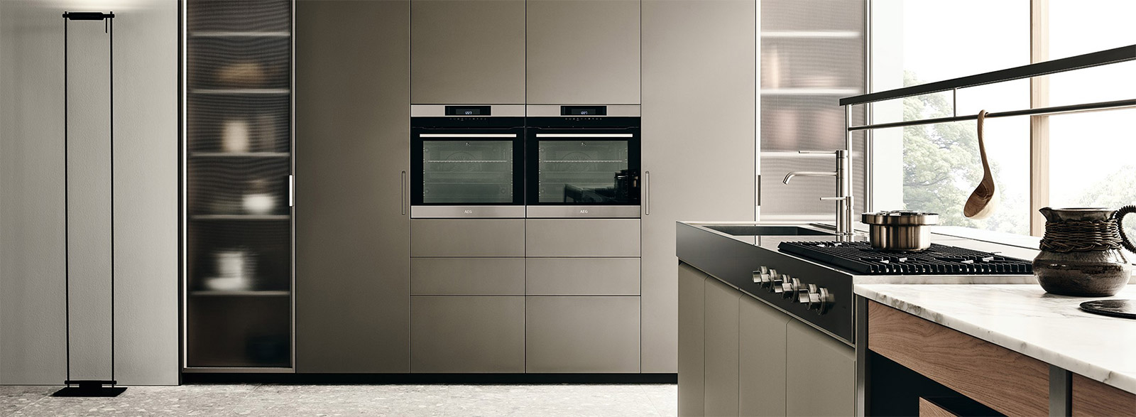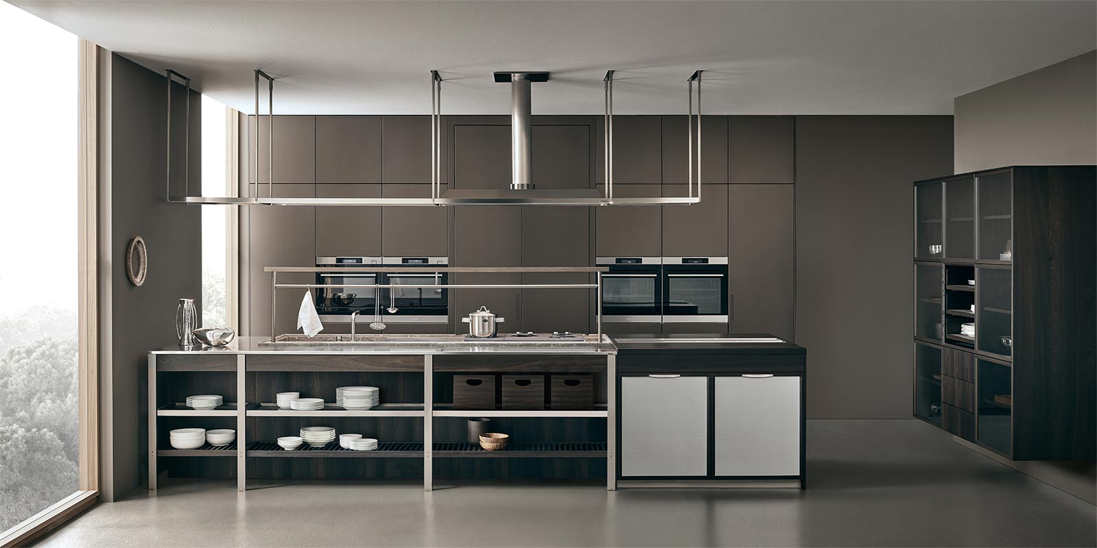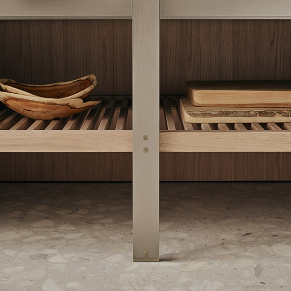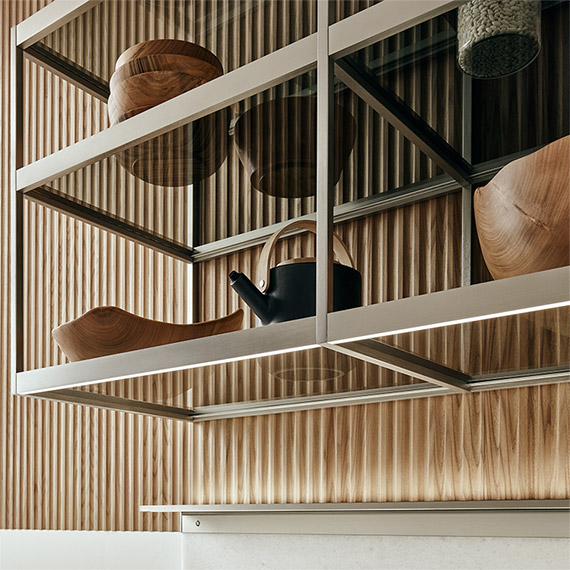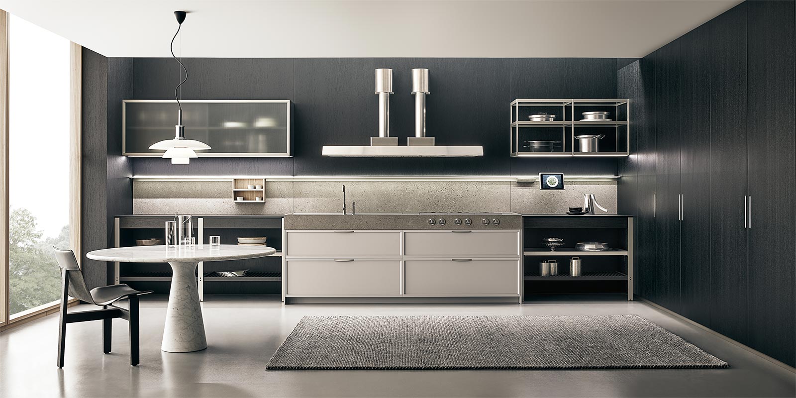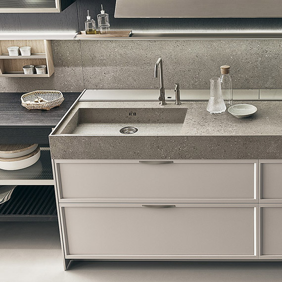 K-lab 可以通過各種全新材料和變體進行定制:鉑金、石墨和縞瑪瑙 Metallix 飾面,光滑的北歐橡木,開孔型黑橡木,經過熱處理的光滑橡木貼面,專用于框架門的優雅銀色背漆鉆石圖案玻璃,采用異形手柄的全新 Nexus 門以及獨特的 Ernestomeda Zero Gloss? 漆面。