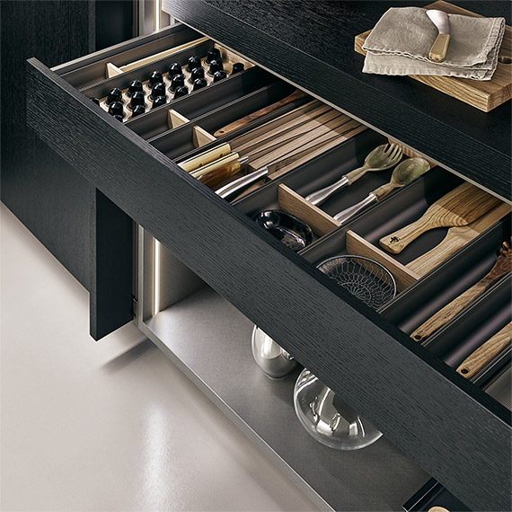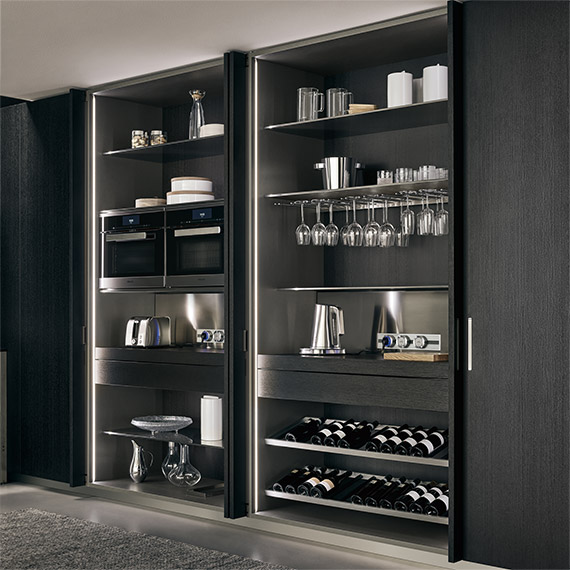 采用開孔型黑橡木制作,帶有伸縮門,配有大量內部配件。拉出式桌子和抽屜、鋼制擱板、鋁材/玻璃擱板、瓶架和玻璃架。Led Line 系列照明配有開口傳感器和電動導軌。