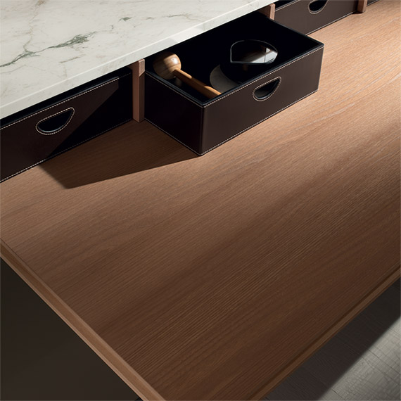 榆木焦糖色的固定桌,地柜前向部分采用后開式設計。長形桌尺寸 181x104 厘米,距離地面高度 76 厘米。