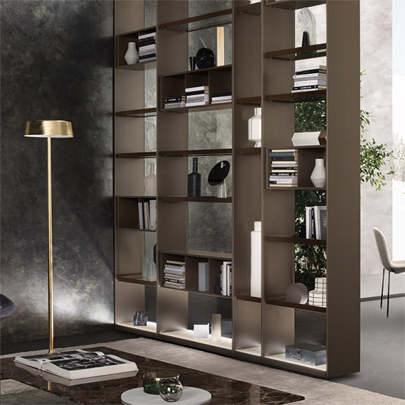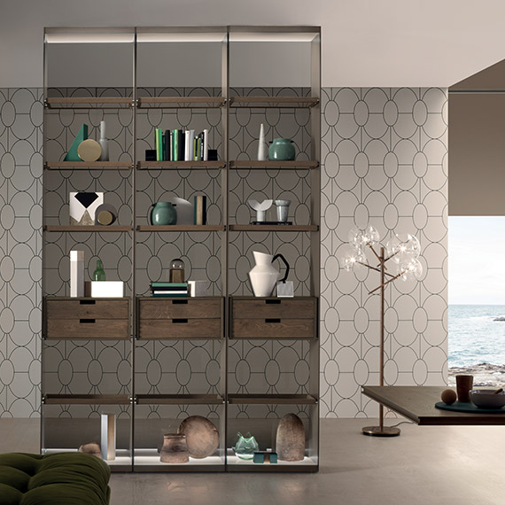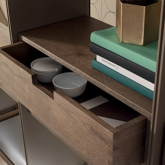 Mud Flat Matt 涂漆側板。透明灰色玻璃背板。透明灰色玻璃擱板,飾有多節 Terra d'Ombra 橡木鑲邊。多節 Terra d'Ombra 橡木材質的抽屜柜。特清磨砂玻璃頂板和地板,飾有多節 Terra d'Ombra 橡木鑲邊。