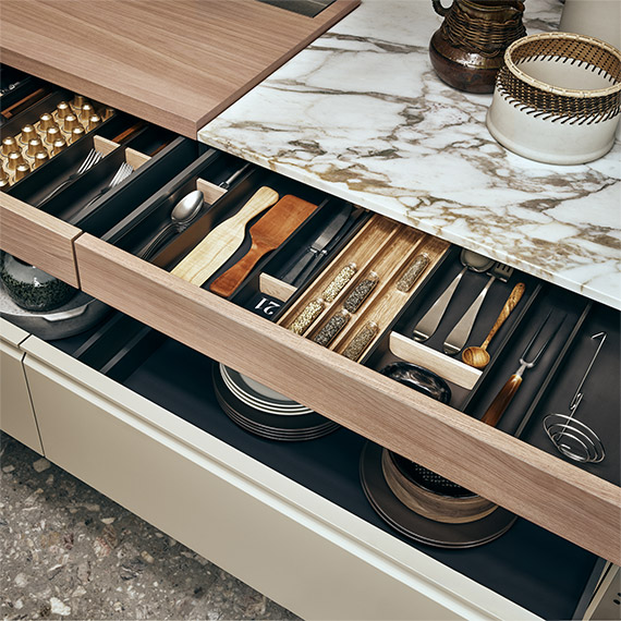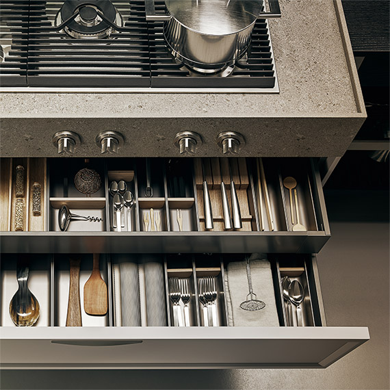 塊化內部配件,適用于采用 Legrabox 側面的抽屜。由于種類繁多的定制配件可以滿足最廣泛多樣的需求(刀具、香料、小容器、罐子和廚用薄膜支架)并發揮不同尺寸的可拆卸隔板的潛力,通過對各個細節的精心設計,可以根據個人品味定制模塊化抽屜內部空間。Peltrox 陽極氧化鋁框架配有北歐橡木隔板。