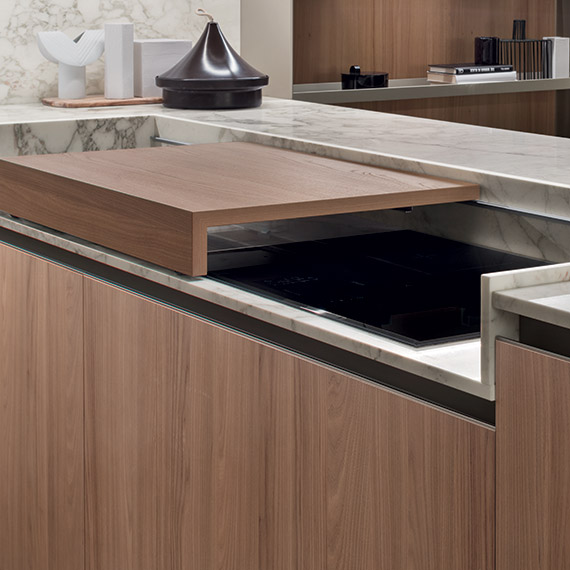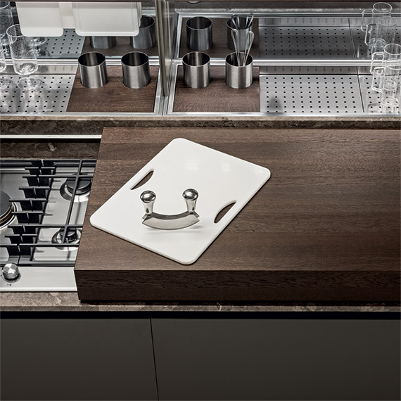 經熱處理的案板可沿導軌滑動。可用于制備食物和作為工作臺面,也可用作爐盤蓋。