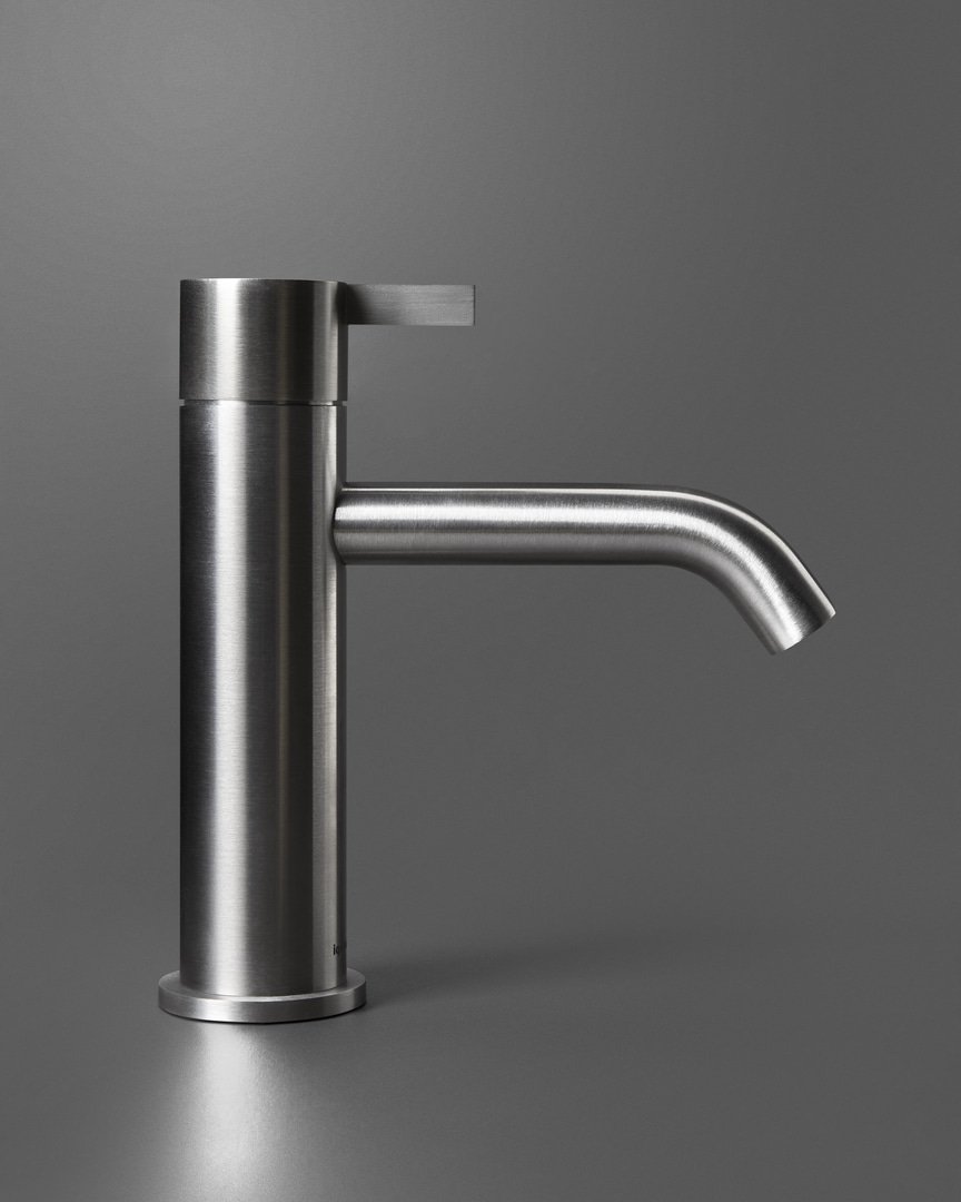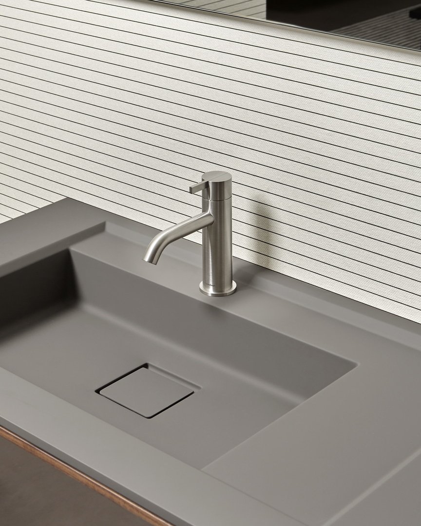 Le geometrie pure del cilindro che definiscono corpo, bocca e manopola, le linee nette e squadrate della leva che vi si innesta con un gesto dirompente, un taglio netto e deciso ma allo stesso tempo misurato e in armonia con l’immagine complessiva del miscelatore. Essentia è la collezione di rubinetteria che associa minimalismo e prestazioni, proporzioni misurate ed equilibrio dimensionale a caratteristiche di sostenibilità, igienicità e durata nel tempo. Interamente realizzata in acciaio inox, Essentia è disponibile nelle finiture satinata o lucido ma anche nella versione Laccata opaca, mentre la leva del miscelatore può essere personalizzata in tutti i colori della gamma antoniolupi.