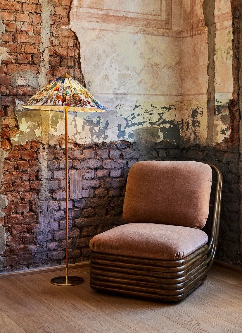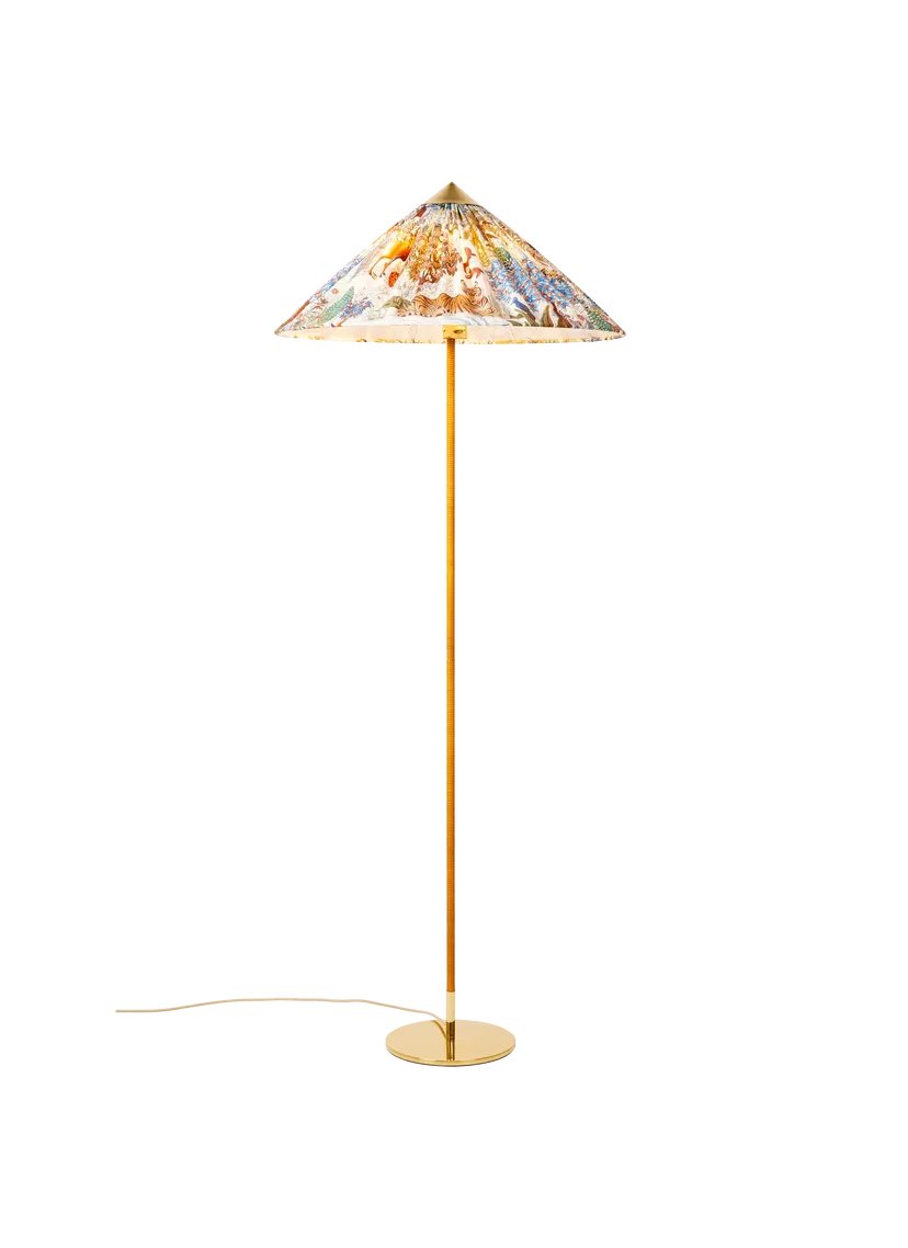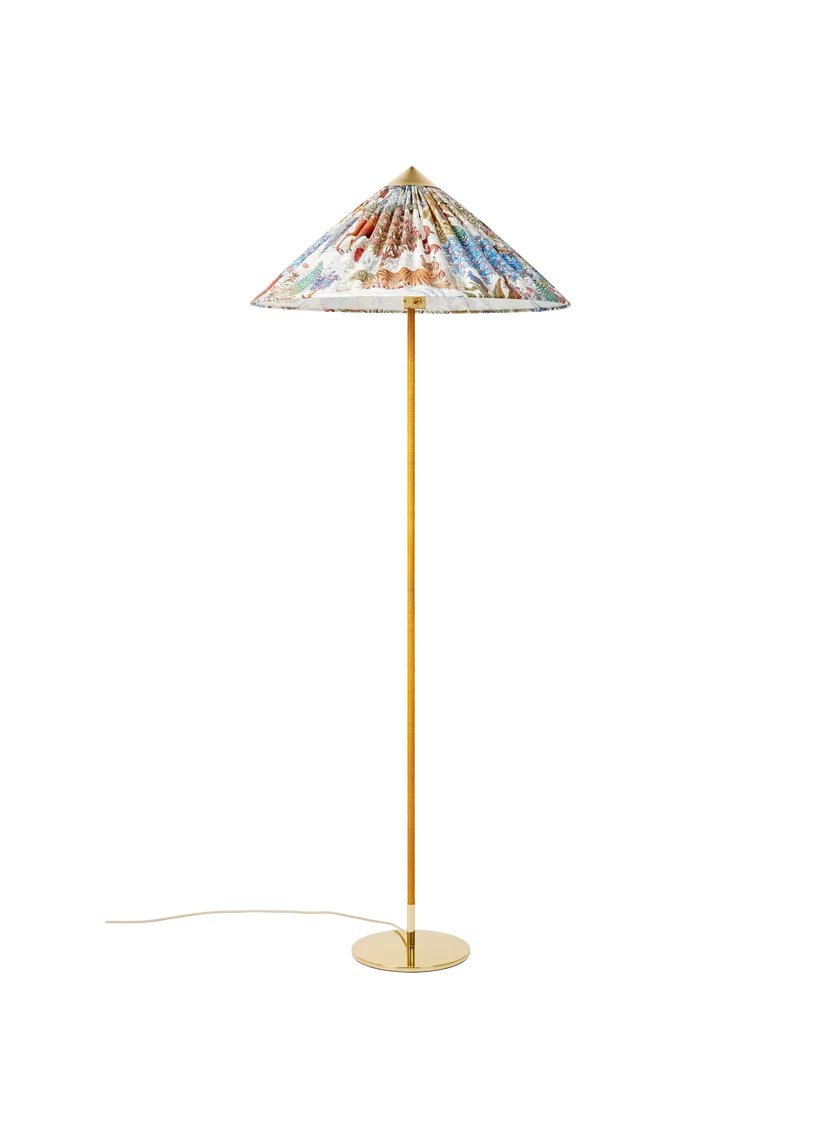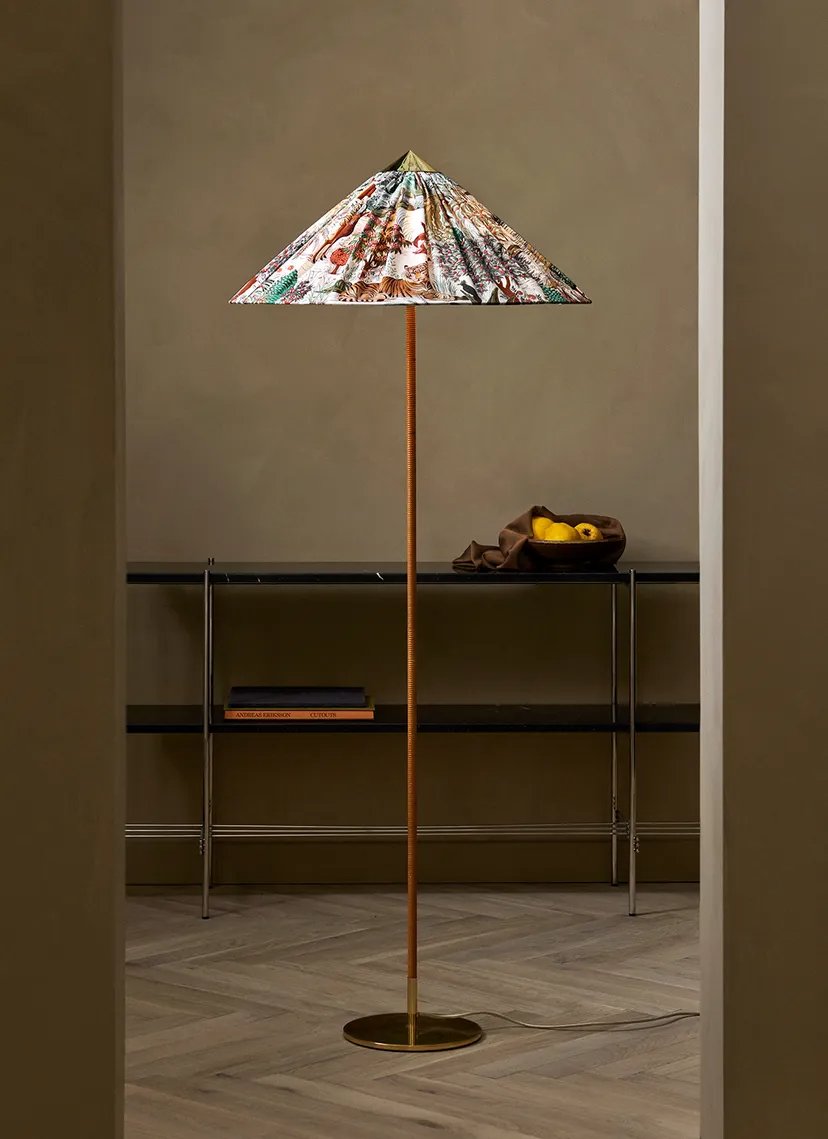 First created for Helsinki’s Hotel Aulanko in 1935 and reintroduced by GUBI in 2018, the 9602 Floor Lamp comprises a rattan-wrapped stem with a polished brass base and conical crown that ties the design together. In this special edition, GUBI brings together two masters of 20th-century design – the Finnish lighting maestro Paavo Tynell, and the renowned Parisian textile house Maison Pierre Frey, introducing a dreamlike new dimension to the Tynell Collection.