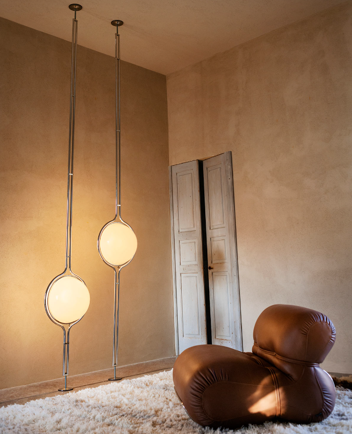 A luminous sphere seems almost suspended in time and space. A metal structure seduces the gaze with its striking simplicity and the boldness of its construction. The extroverted Dana by Jean-Pierre Garrault and Henri Delord fits perfectly into the constant search for timeless pieces carried out by Tacchini: a lamp with a strong personality. Born from free creative thought and full of the artistry of the 70s, rediscovered by Tacchini to leave an unmistakable mark in any room. Dana’s idea was born in 1970 during a trip to Japan, when the designers decided to climb Mount Fujiyama and one evening, during a stop in a traditional Japanese inn, they were lucky enough to see the full moon rise and pass over the top of the mountain: hence the intuition to create a lamp with large luminous spheres that seem to rise towards the sky.
