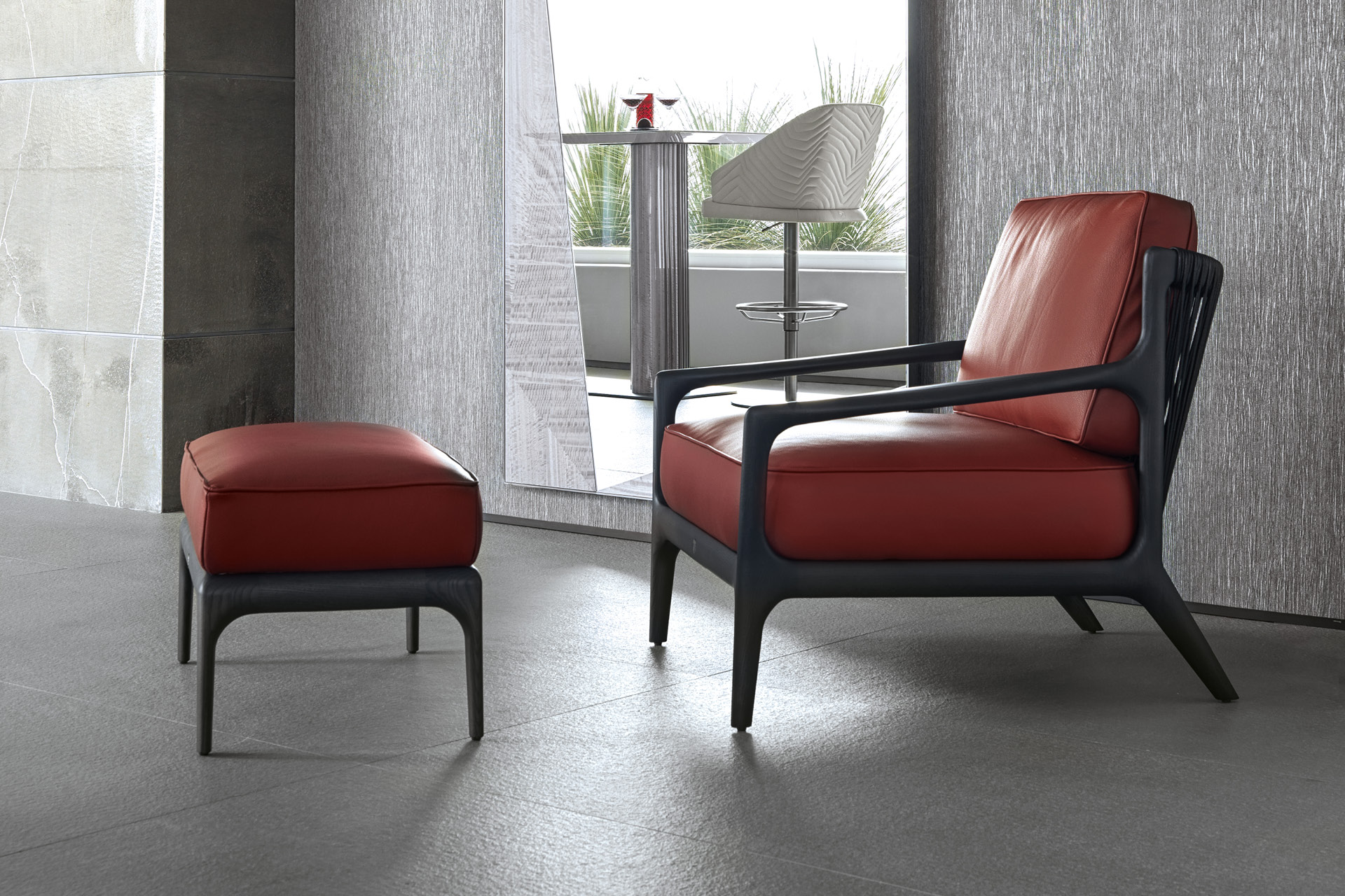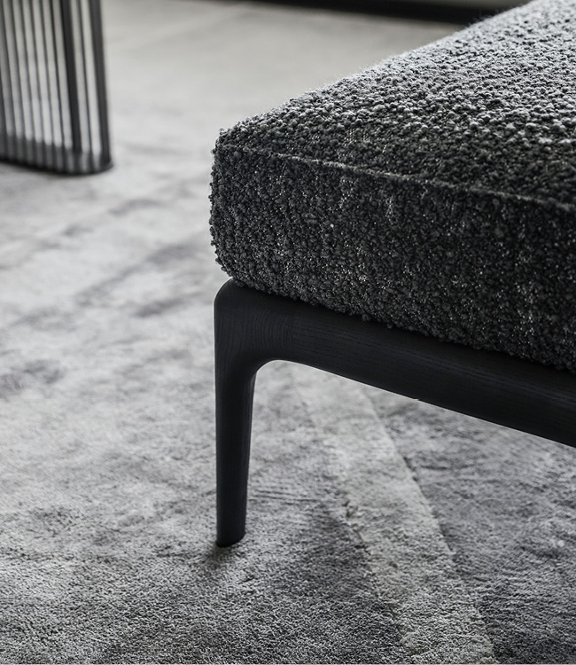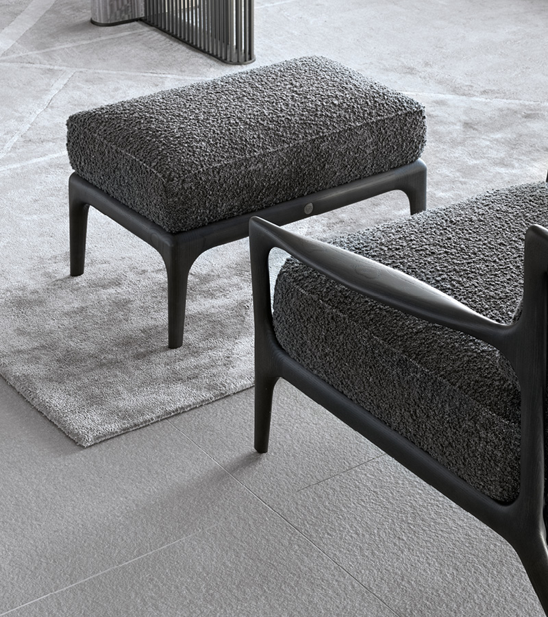 Ottoman for occasional chair available in fìrst grade leather, nubuk leather, lizard printed leather, velvet or suede fabric. Seat with double stitching in polyurethane foam wrapped in down feather. Legs in solid satined black oak.Wooden base with inserted Giorgio Collection logo.